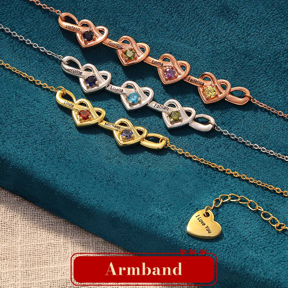 Personalisiertes Herz-Armband mit verbundenen Herzen, 1–4 Namen und Geburtssteinen