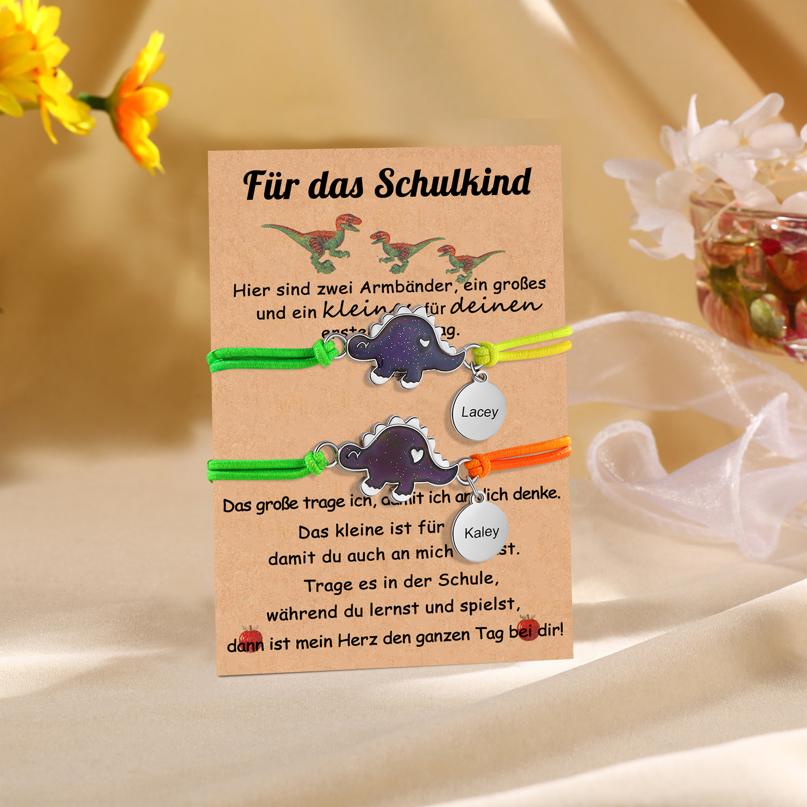 Dinos Armbänder Set mit 2 Ketten-Für das Schulkind Mein Herz den ganzen Tag bei dir-Schulanfang Geschenk mit Nachrichtenkarte