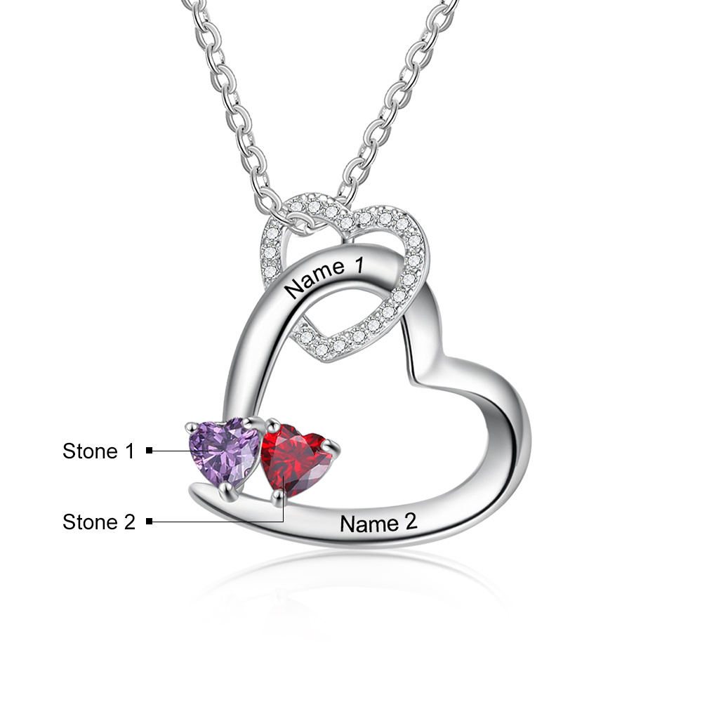 Personalisierte 2-Namen-Halskette mit 2 Herz-simulierten Geburtsstein-Paar-Anhänger-Halskette