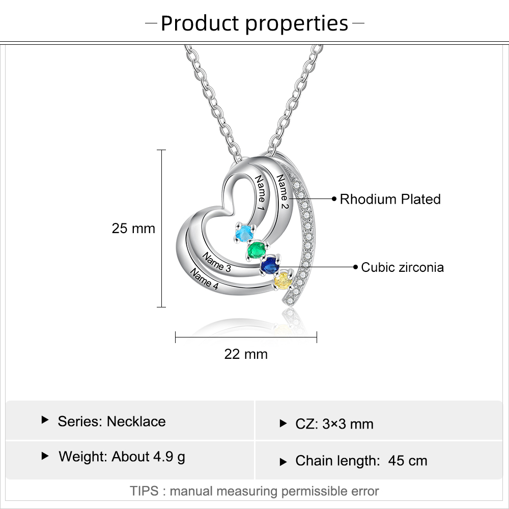 Personalisierte herzförmige Halskette, geschnitzt mit 4 Namen und 4 Geburtstagssteinen