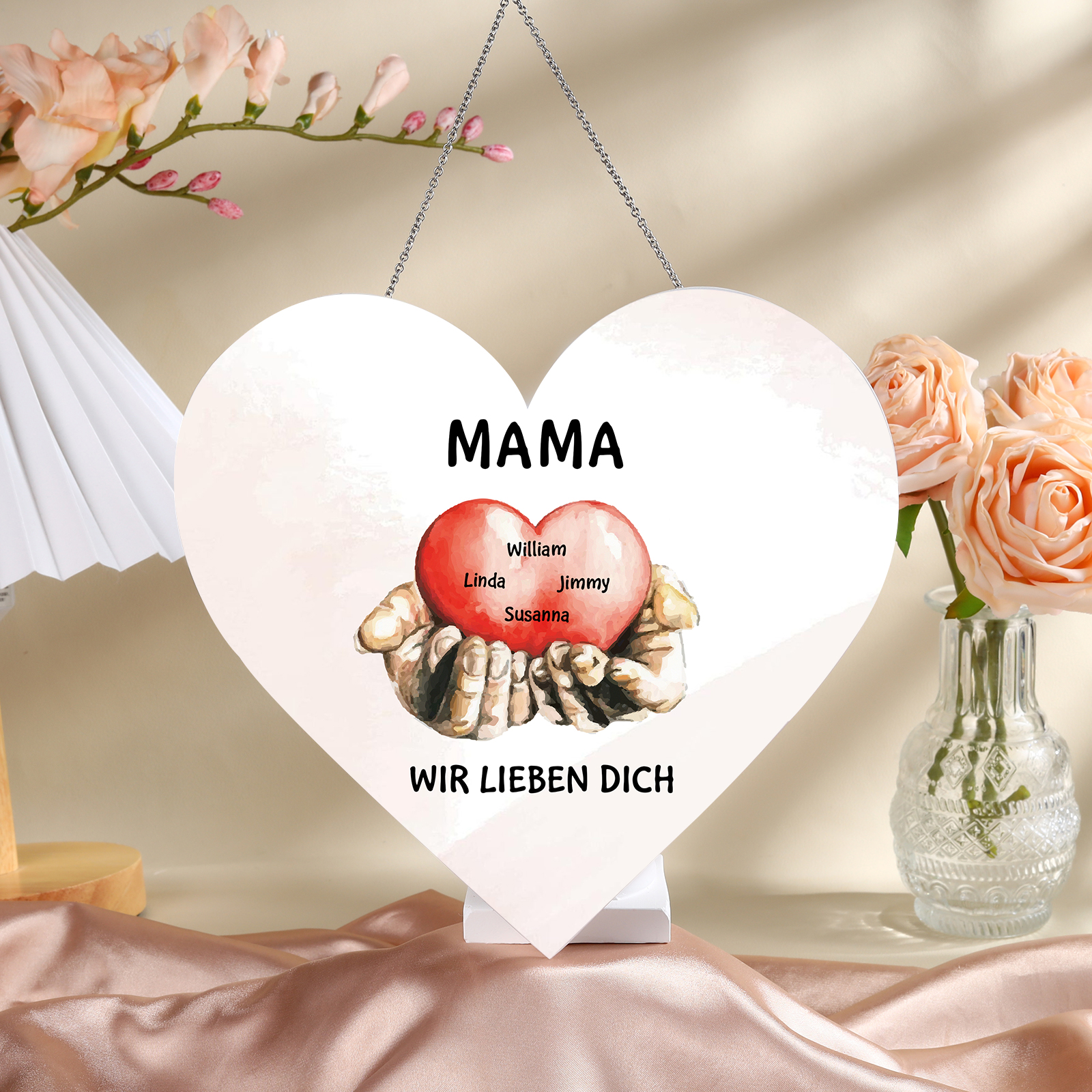 Personalisierte 4 Namen & 2 Texte Herz auf der Hand Herz Ornament Licht Acryl Hängender Wandlampe Geschenk für Mutter
