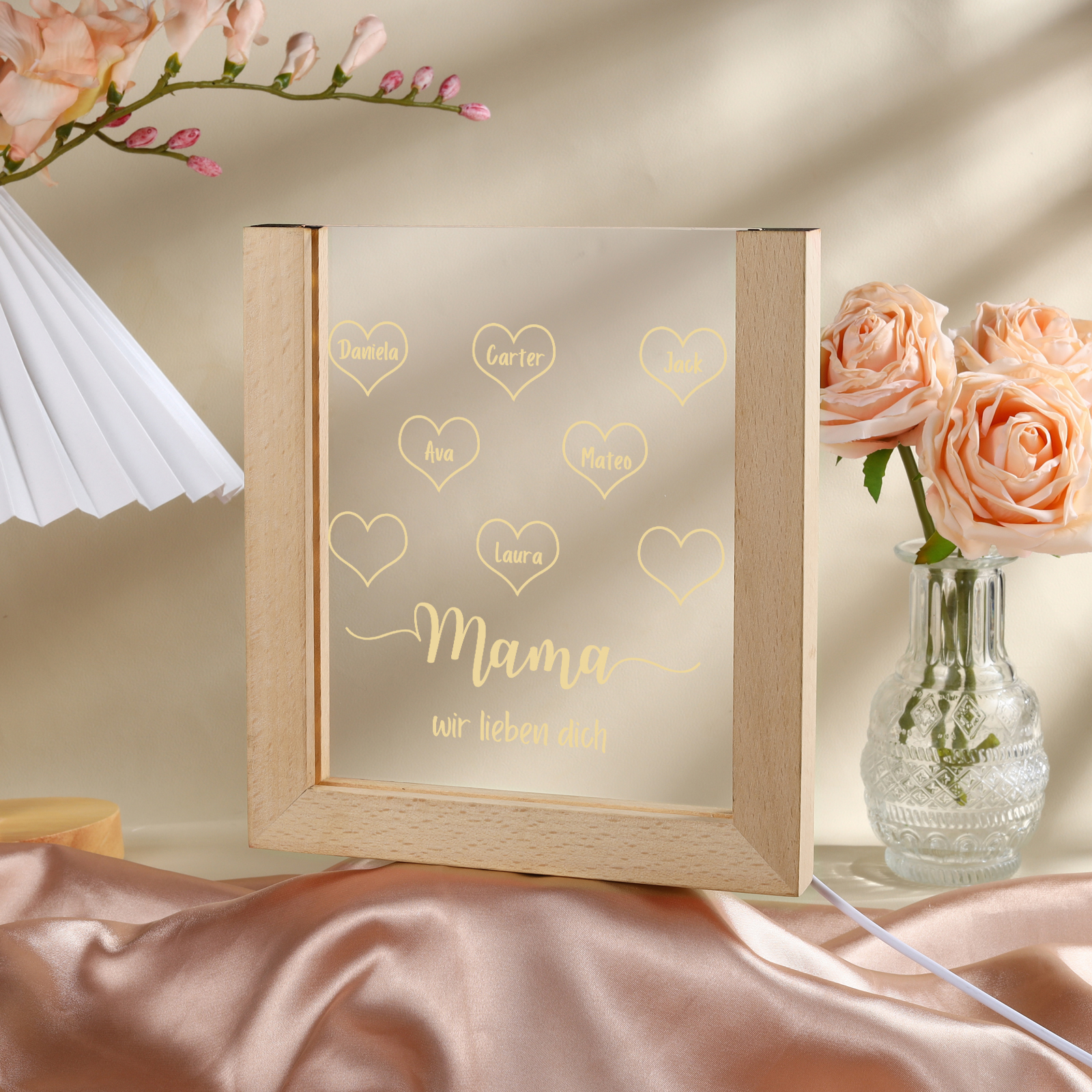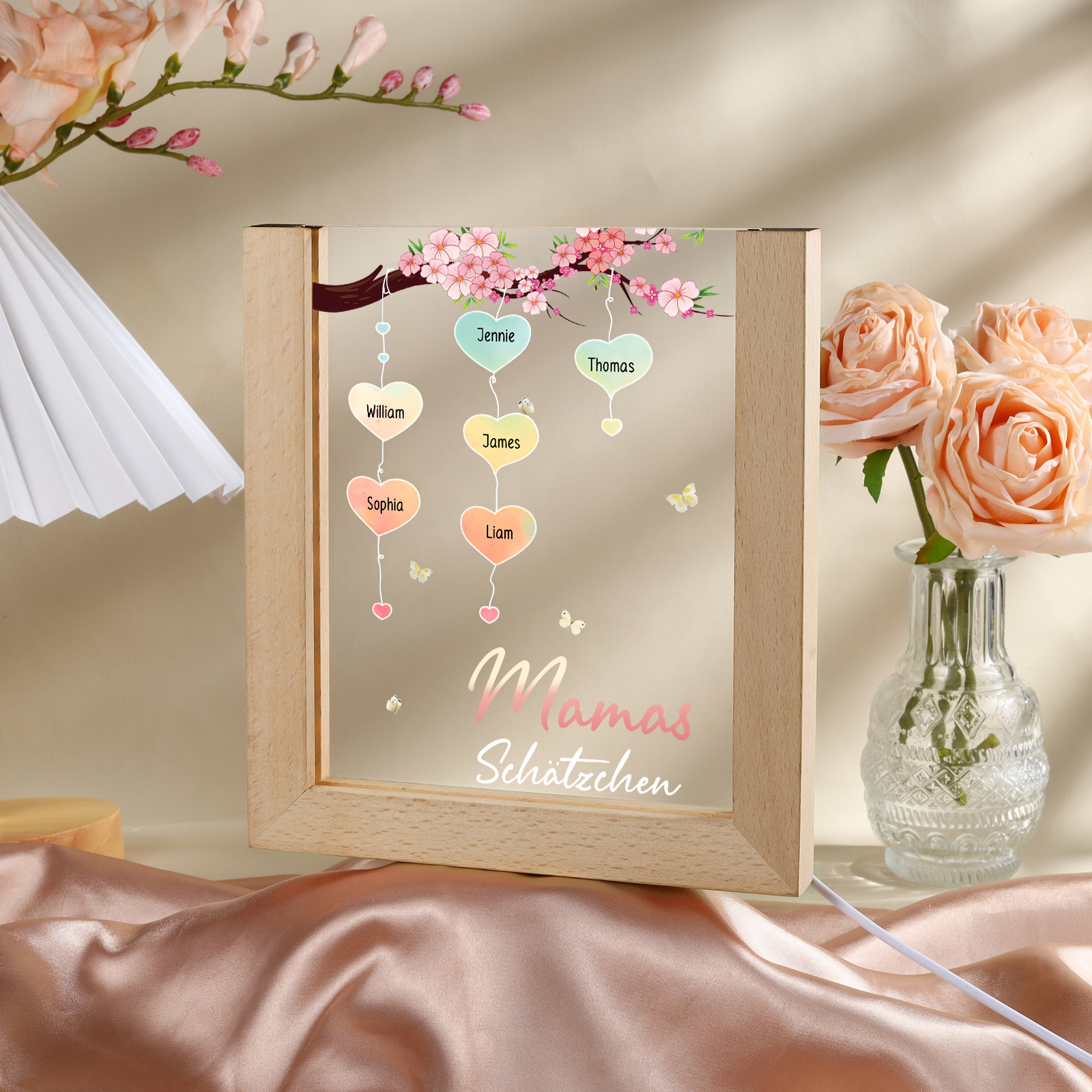 Personalisierte 7 Namen & Text Pfirsichblüte Familienbaum Acryl Rahmen Nachtlicht Geschenk für Großmutter/Mutter zum Muttertag