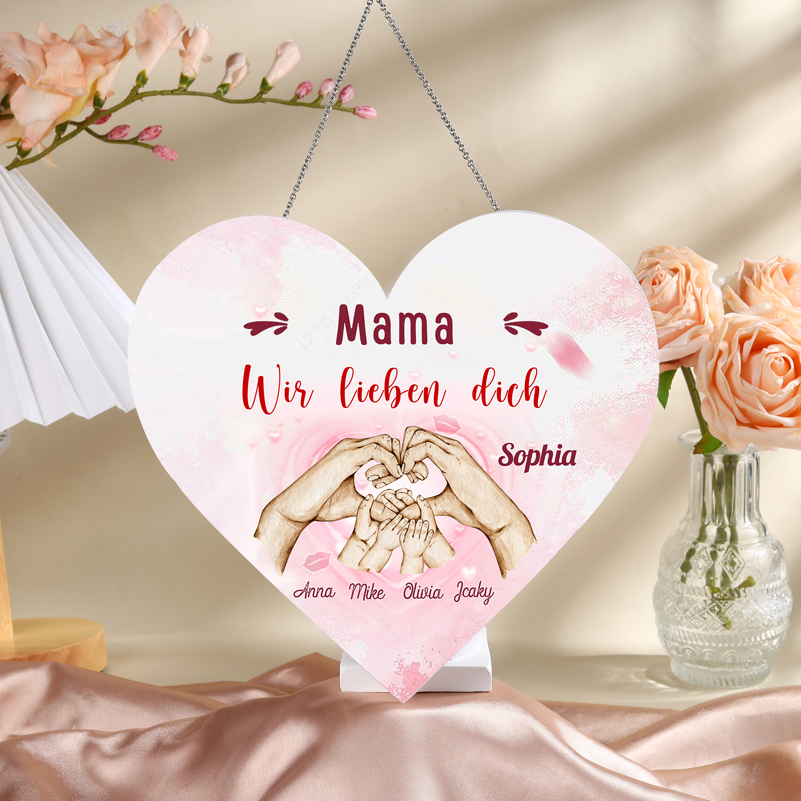 Personalisierte 4 Namen & 2 Texte Familie Hand in Hand Herz Ornament Licht Acryl Hängender Wandlampe Geschenk für Mutter