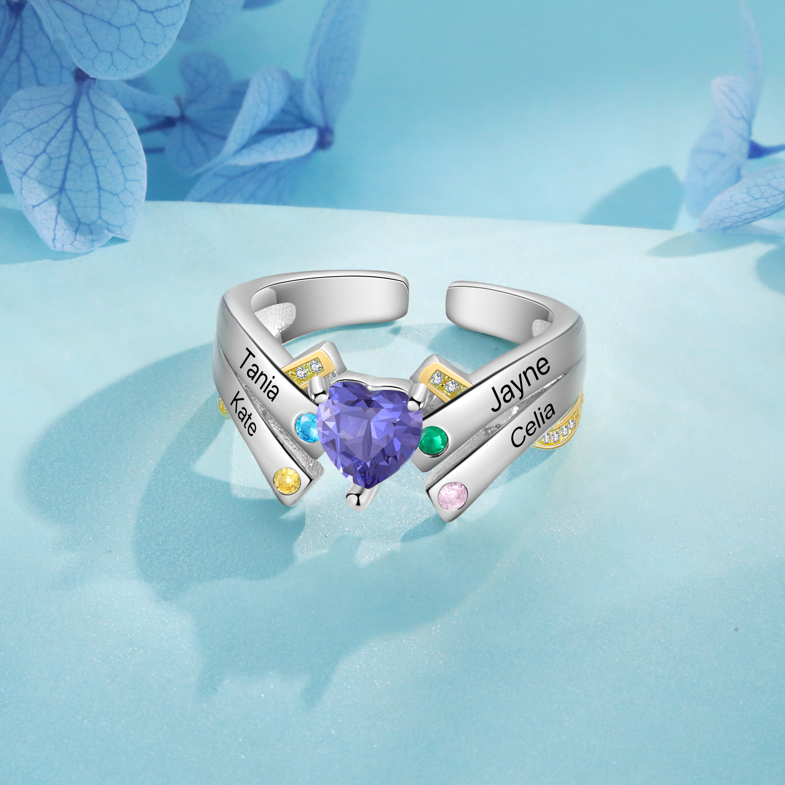 Personalisierte 4 Geburtssteine & 4 Namen Offener Familie Ring