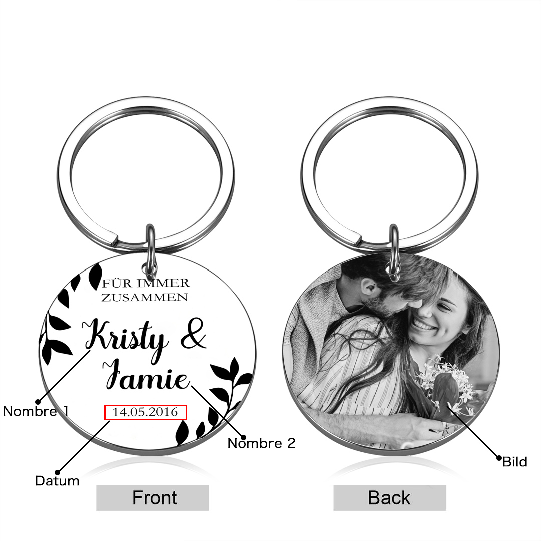 Personalisierbares Foto & 2 Namen & Jahr Rund Metall-Für immer zusammen-Schlüsselanhänger für Paare