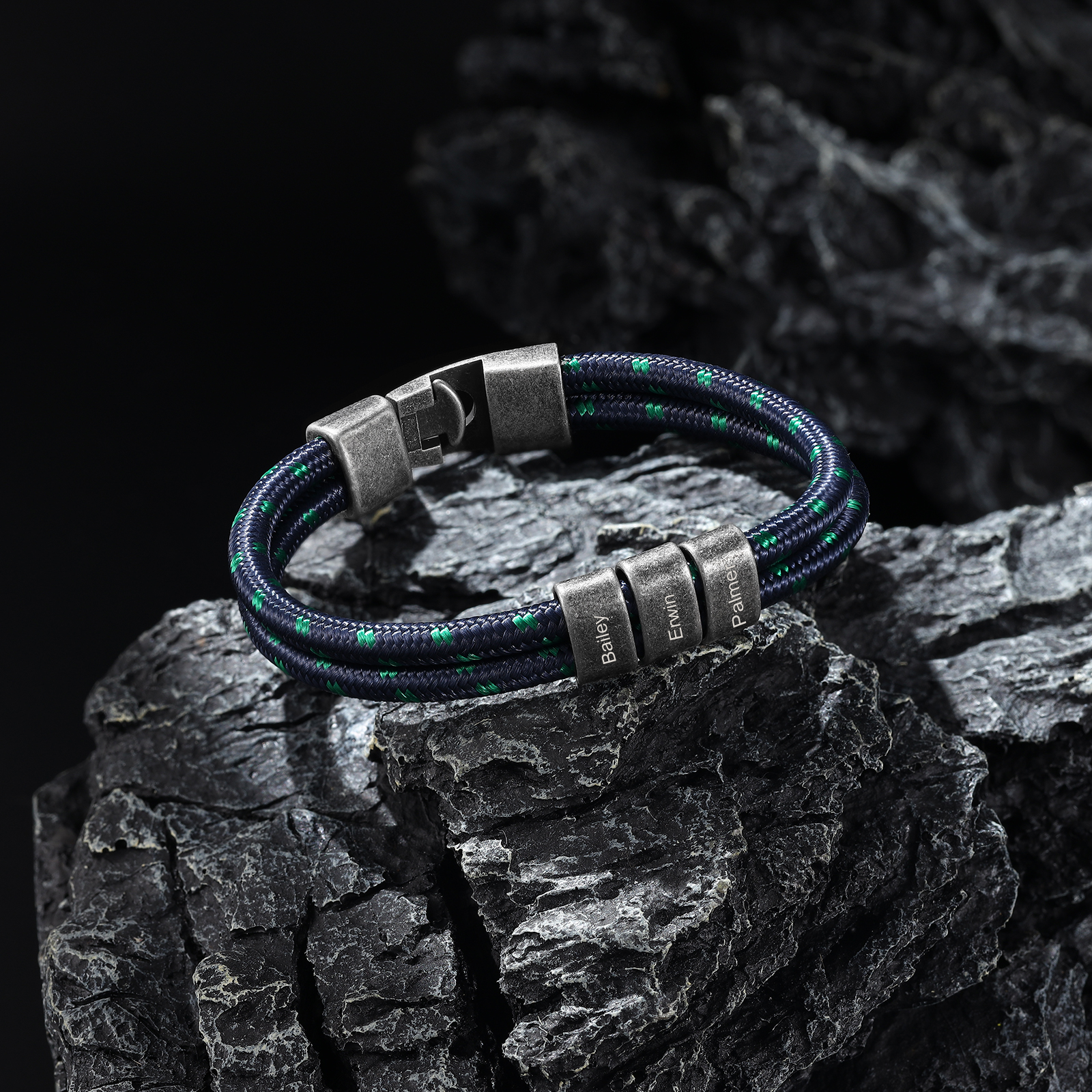 Herren Schmuck-Personalisierte 4 Namen Vintage Edelstahl Perlen Armband mit Grün Nylon Kette