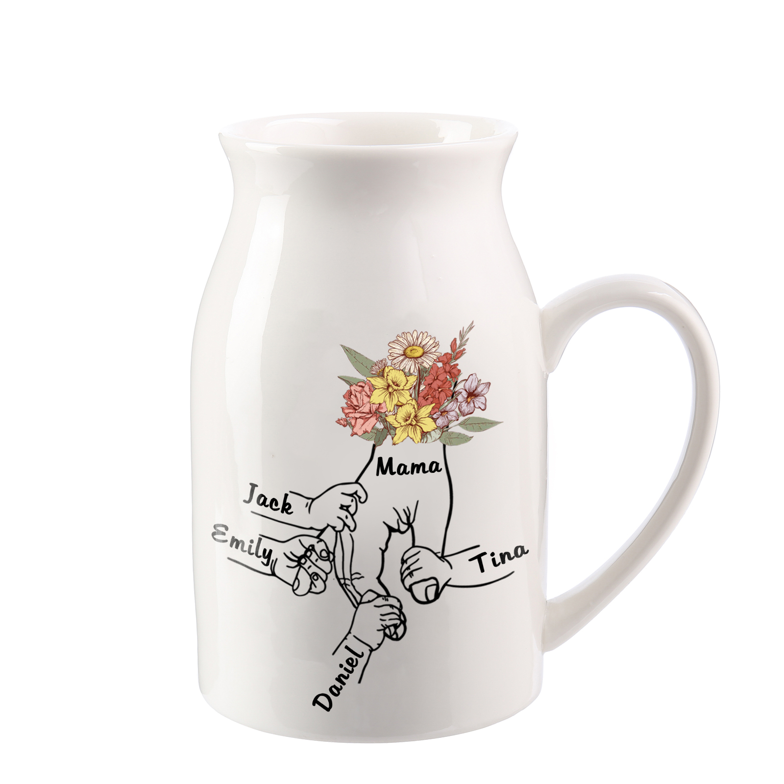 Personalisierte 2-8 Namen & Text-Hand in Hand- Gießvase mit Henkel Mama Vase-Pefektes Geschenk für Mama/Oma