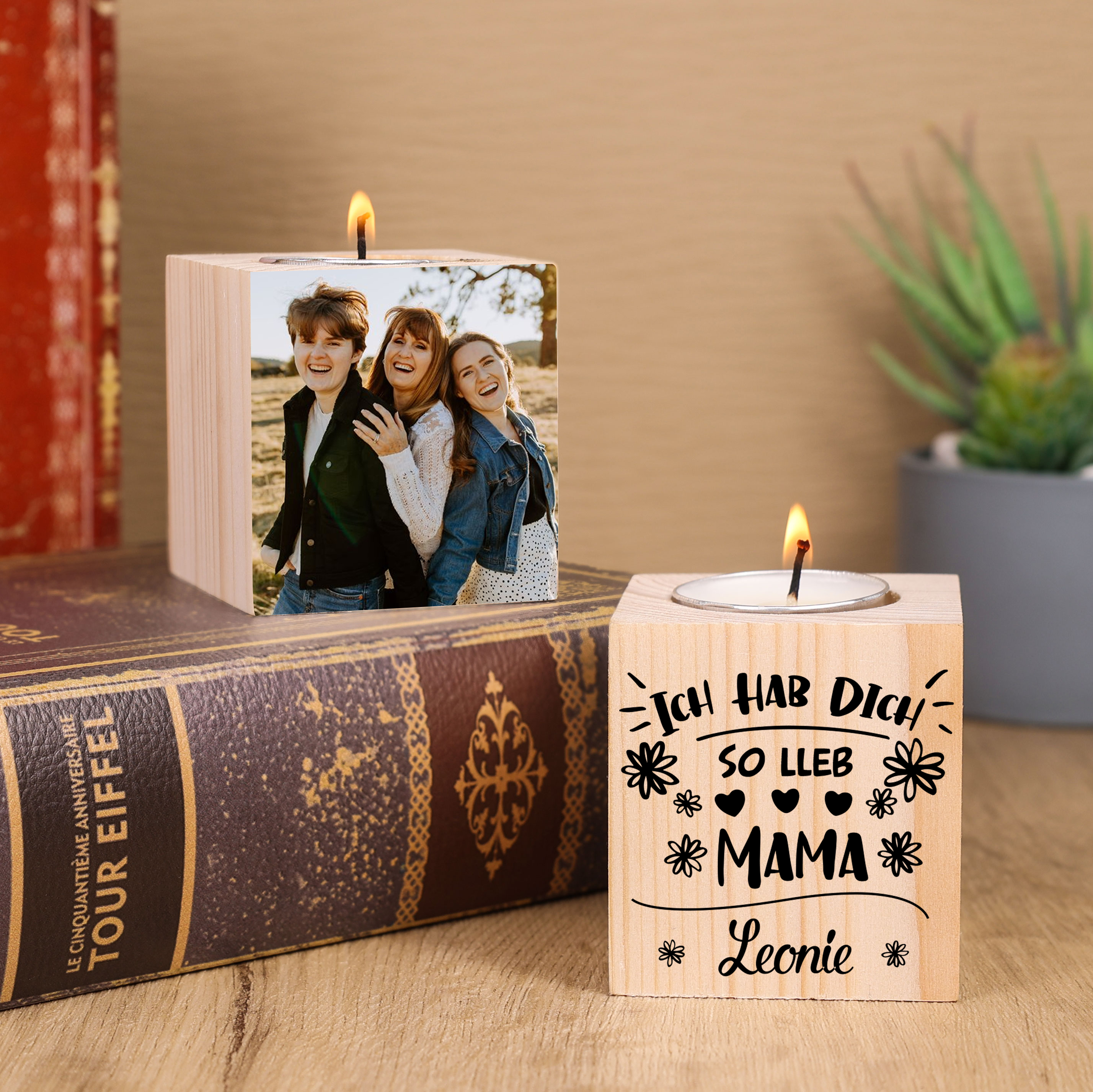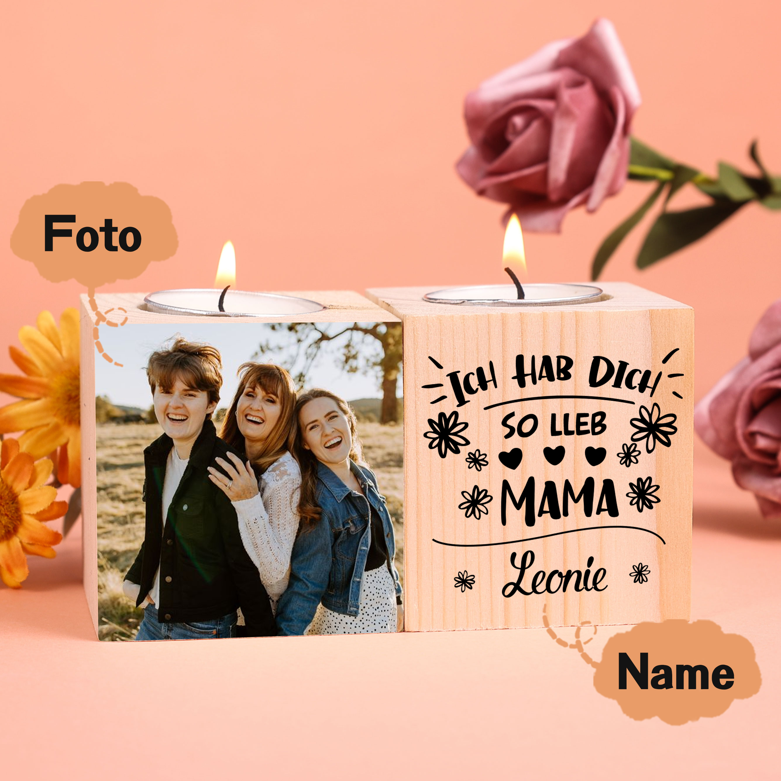 Holz Kompliment Personalisierter 2 bedruckte Seiten Foto & Name Kerzenhalter-Ich hab dich so lieb Mama-für Mutter