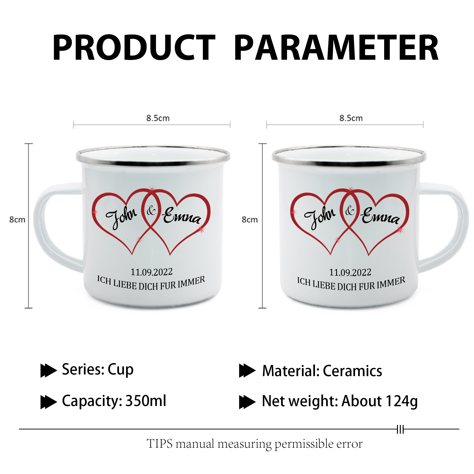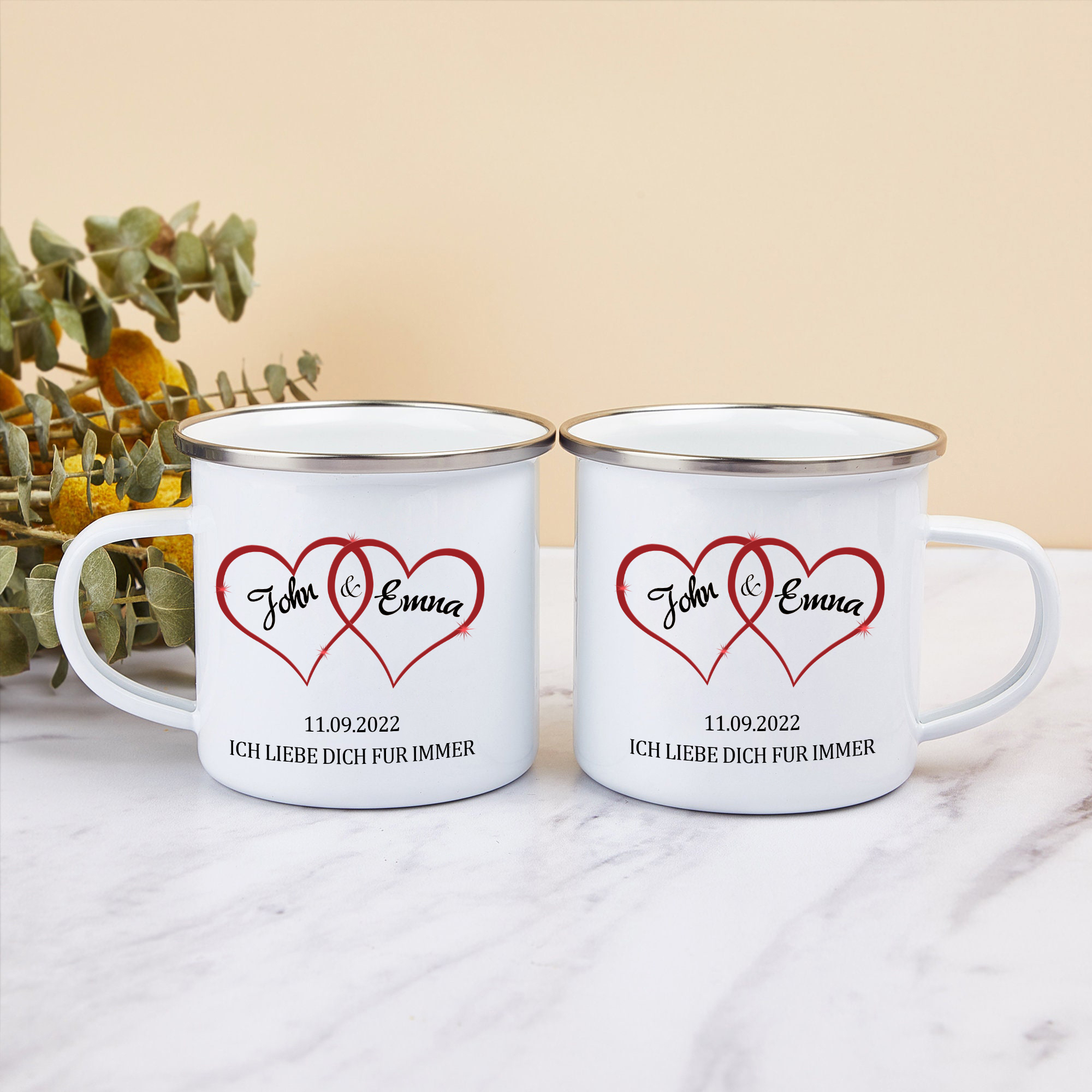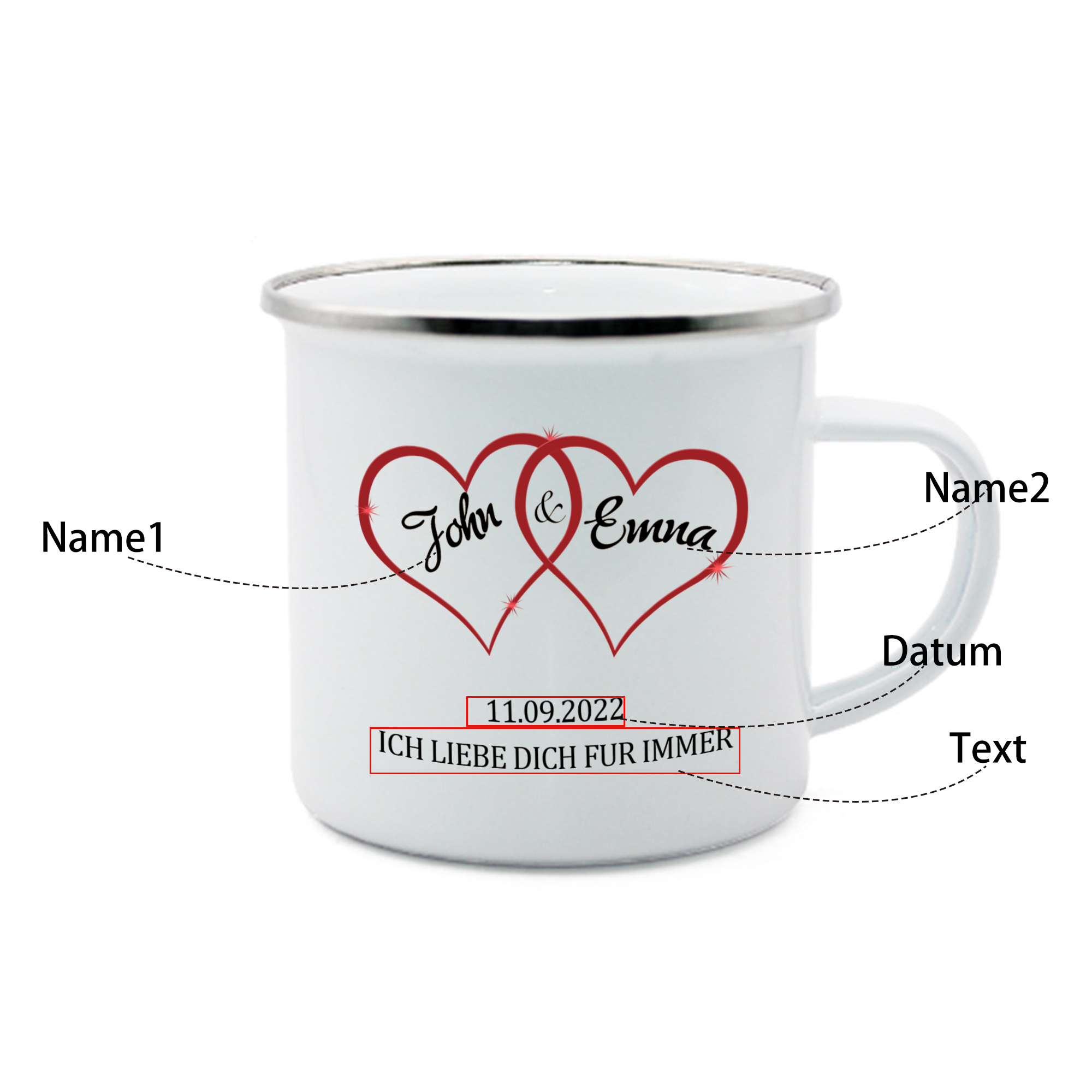 Emaille Tasse-Personalisierte 2 Namen & Datum & Text Emaille Becher für Paare