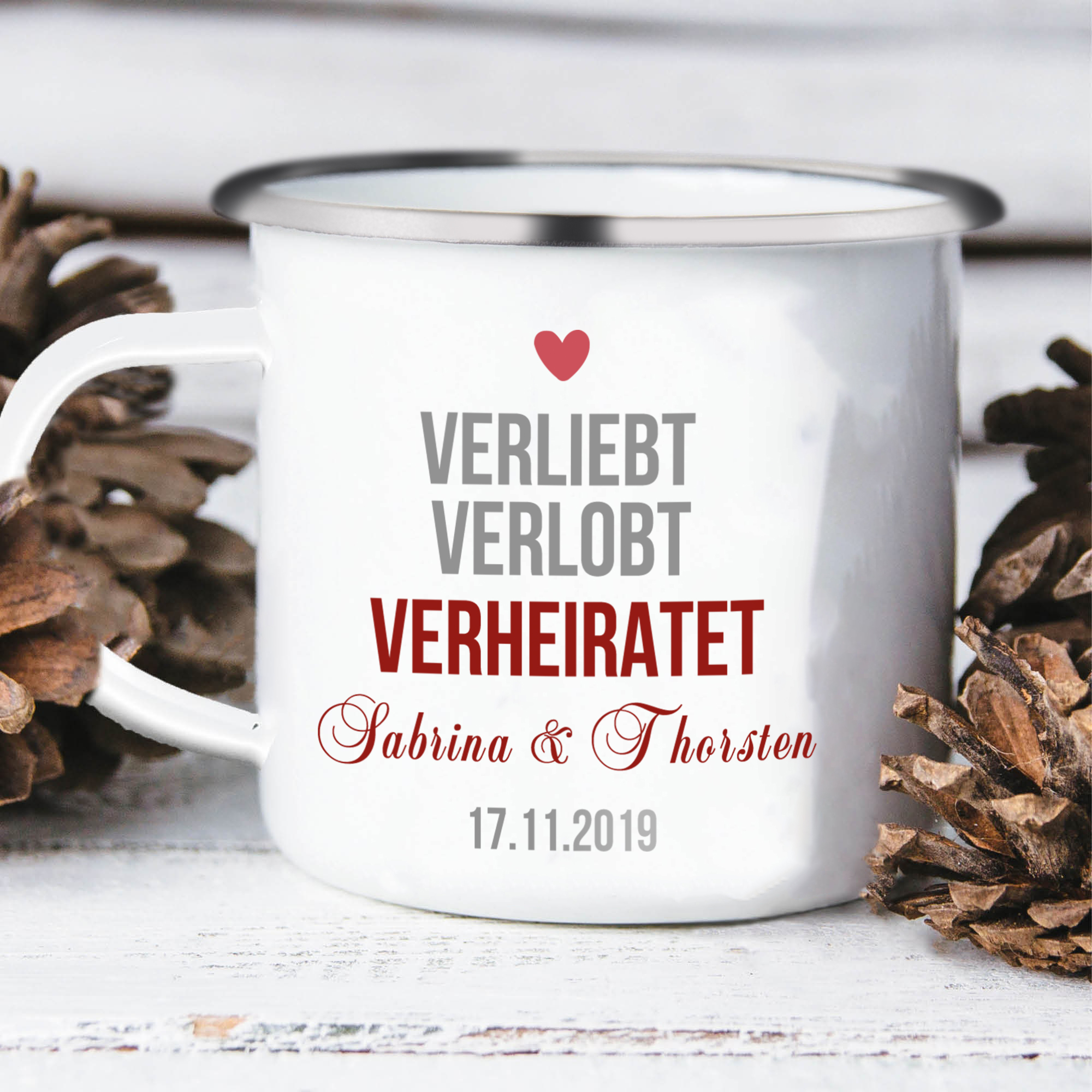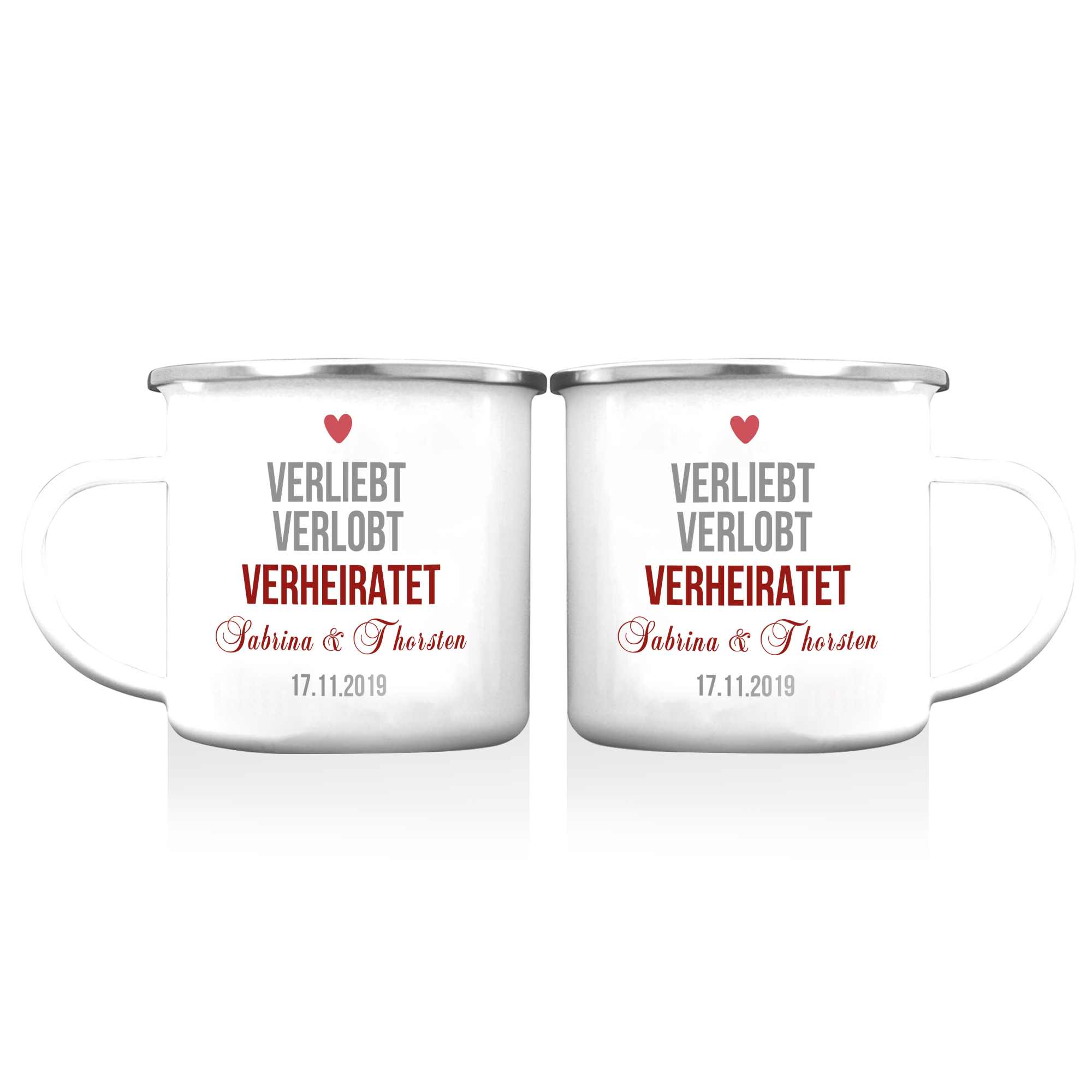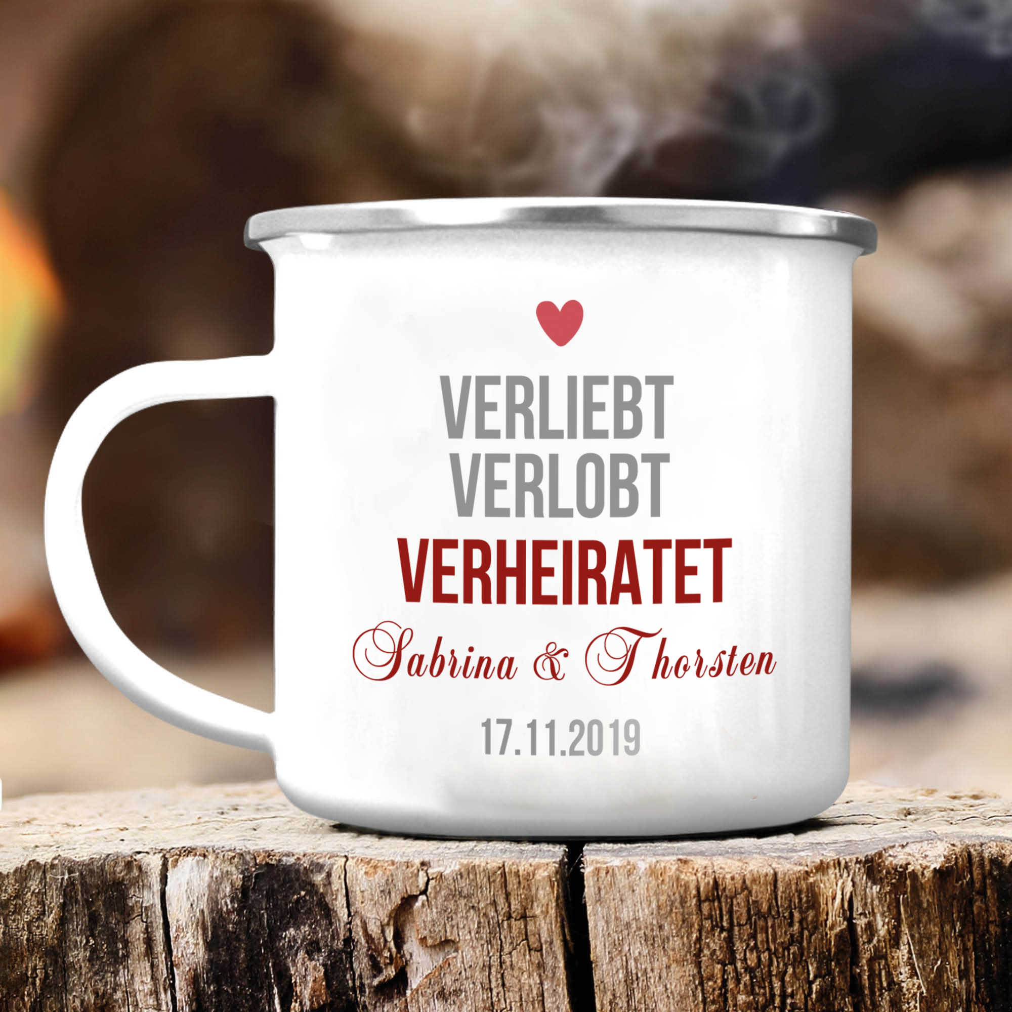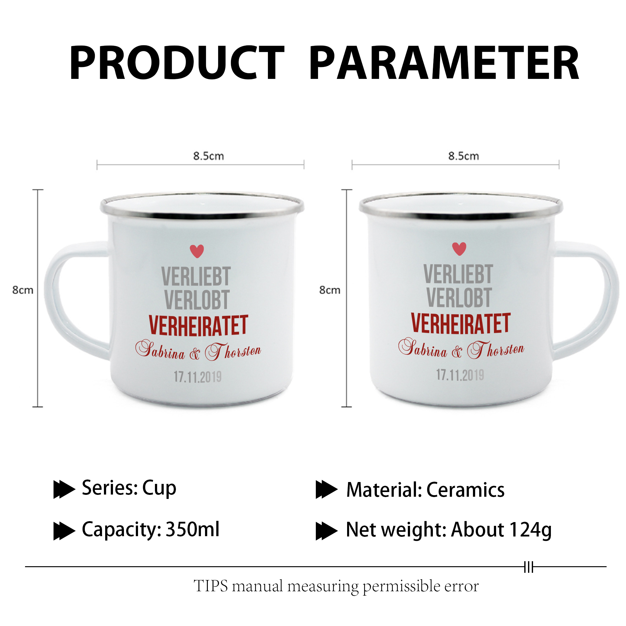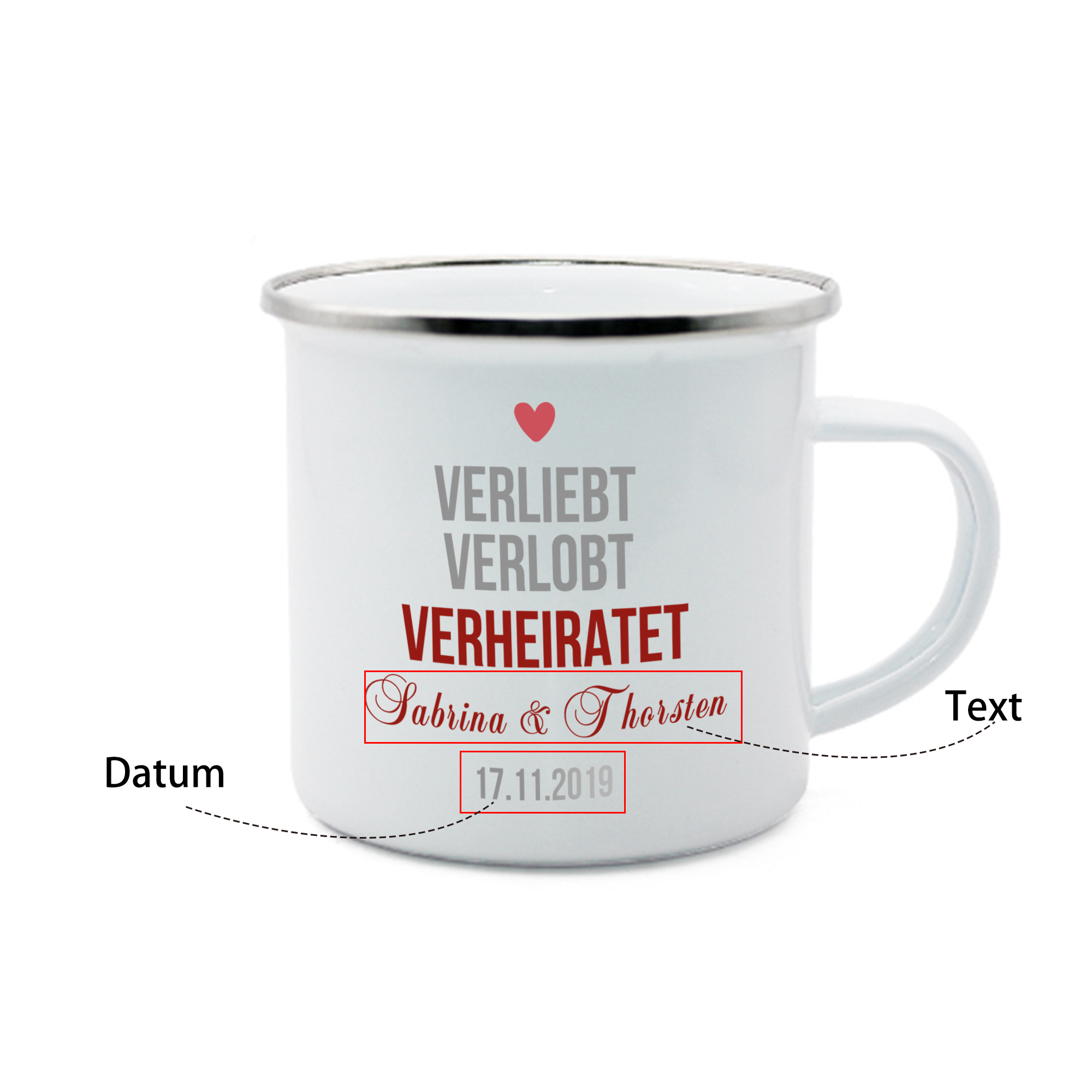 Emaille Tasse-Personalisierter Text & Datum-Verliebt Verlobt Verheiratet-Emaille Becher für Paare