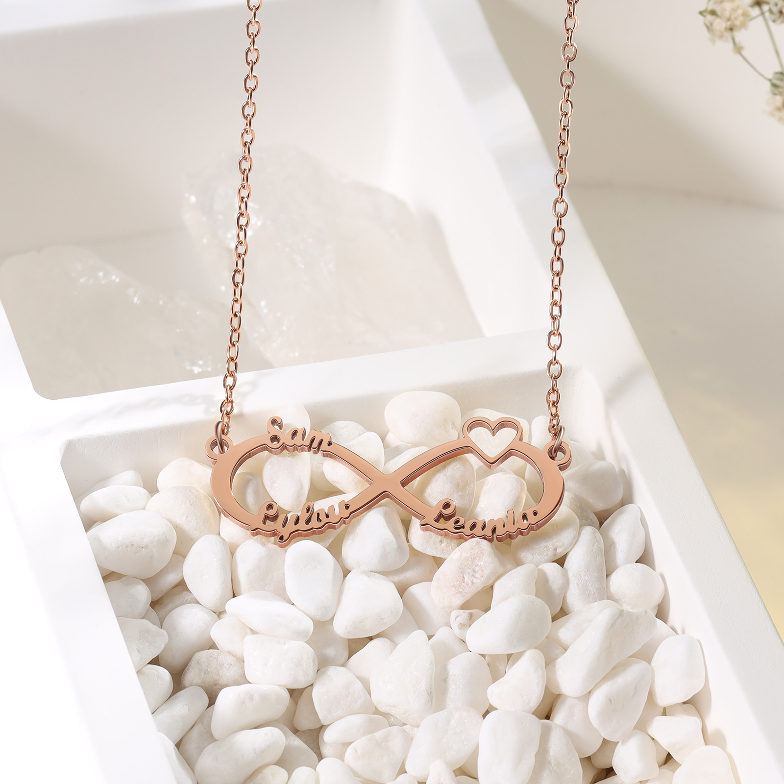 Diese feine Infinity Halskette kombiniert hier einen niedlichen, freundlichen und atemberaubenden Look, um ein stilvolles und auffälliges Stück zu schaffen. Diese Halskette wird sicher zu einem Grundnahrungsmittel in deinen alltäglichen Looks. Diese Halskette kann mit 3 Namen graviert werden. Legen Sie diese schöne und süße Halskette in Ihren Warenkorb.