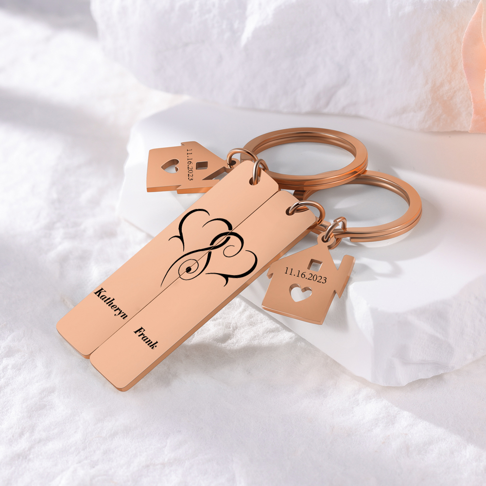 Personalisierbar 2 Namen & 2 Datum Herz Metall Schlüsselanhänger mit Haus Anhänger