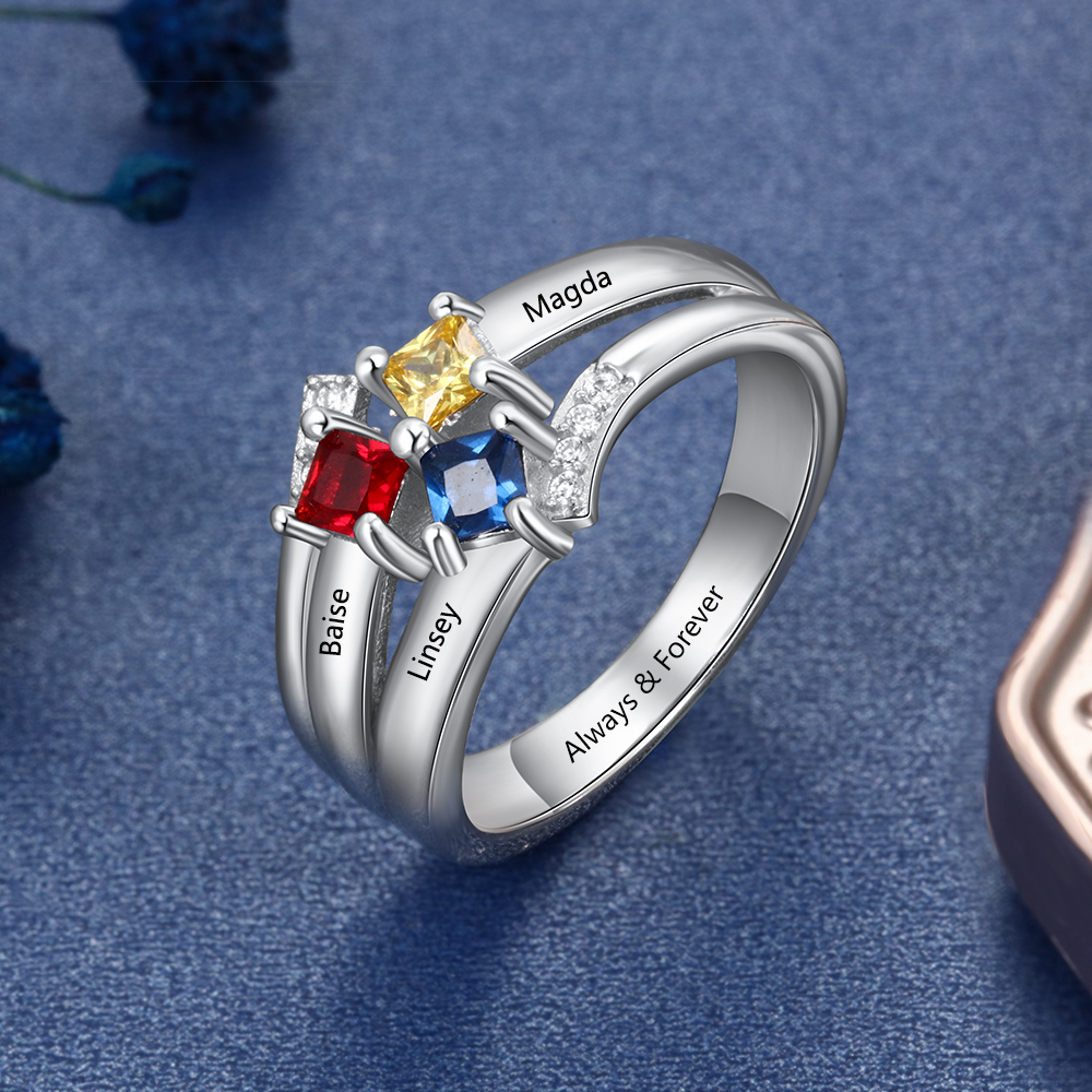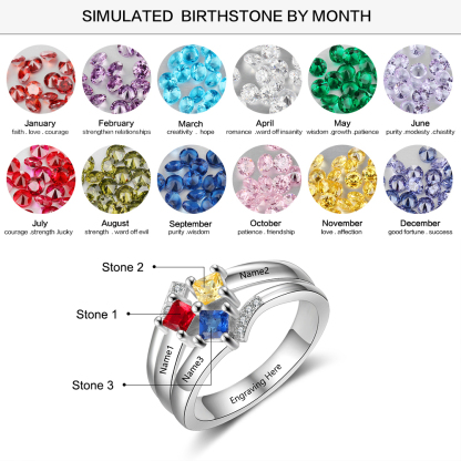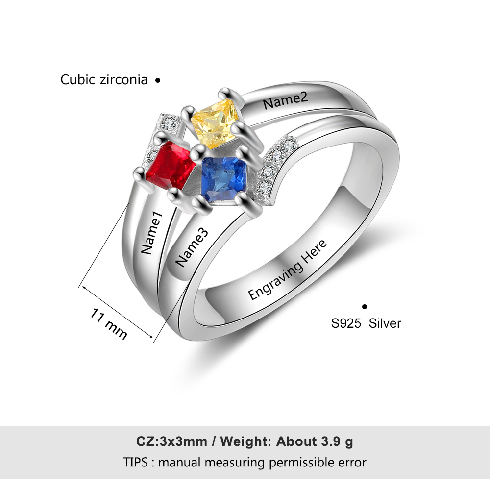 925 Sterling Silber Ring mit 3 Namen und 3 Geburtssteinen mit Gravuren