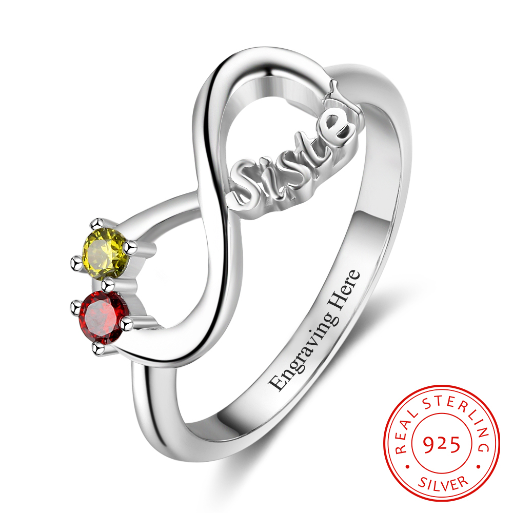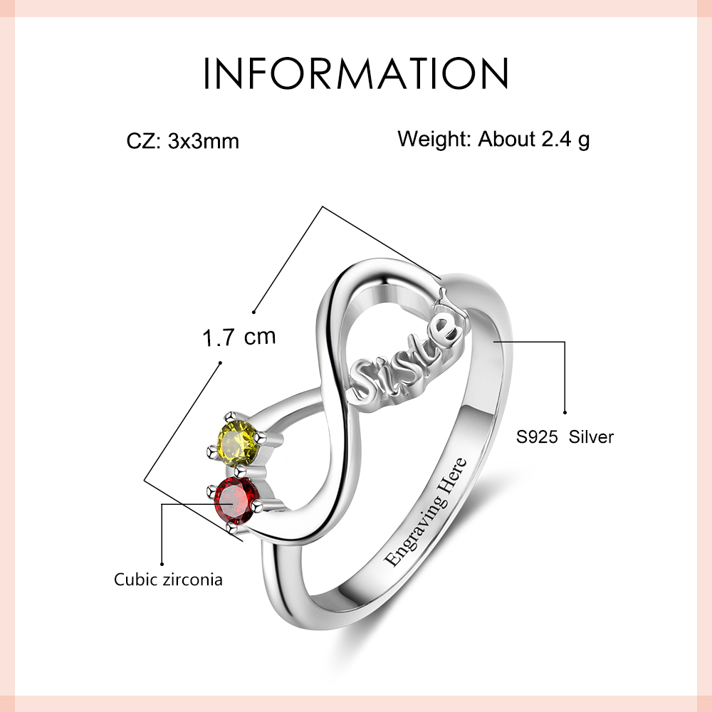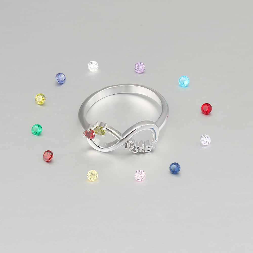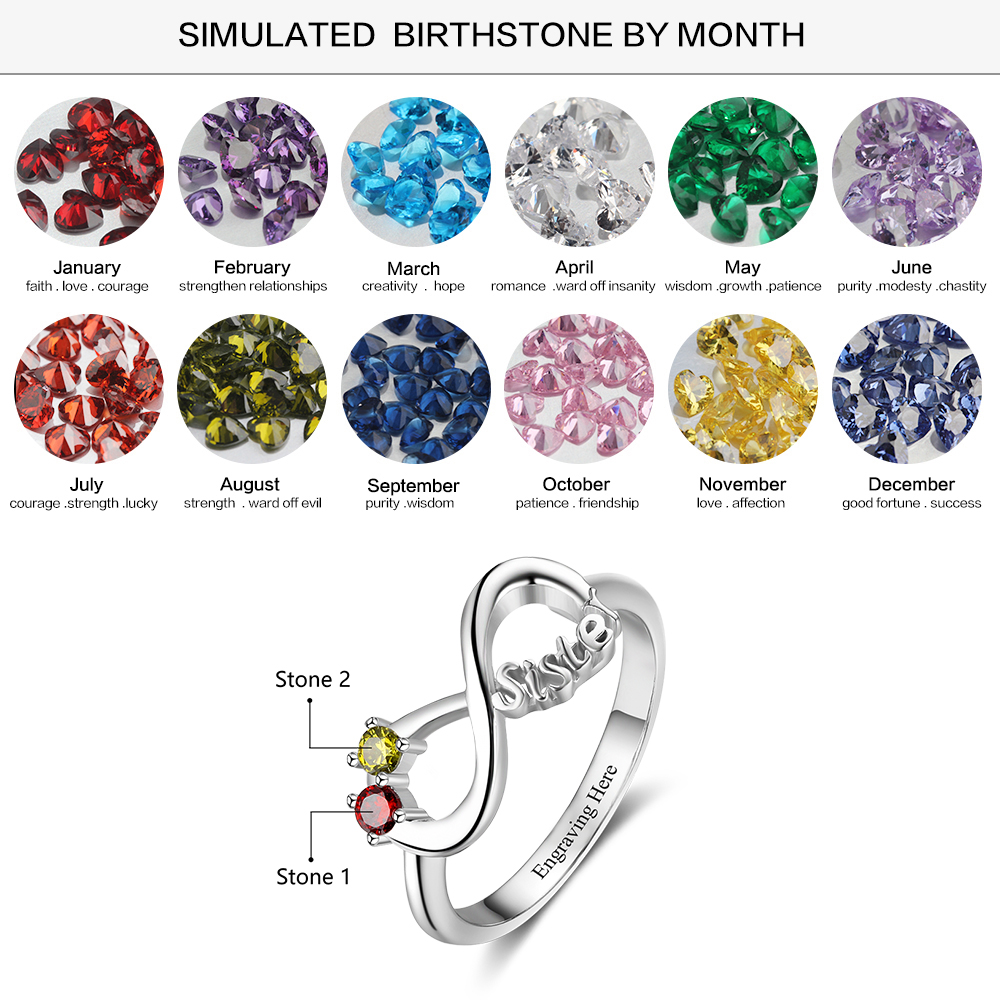 925 Sterling Silber Ring mit Text und 2 Geburtssteinen mit Gravuren