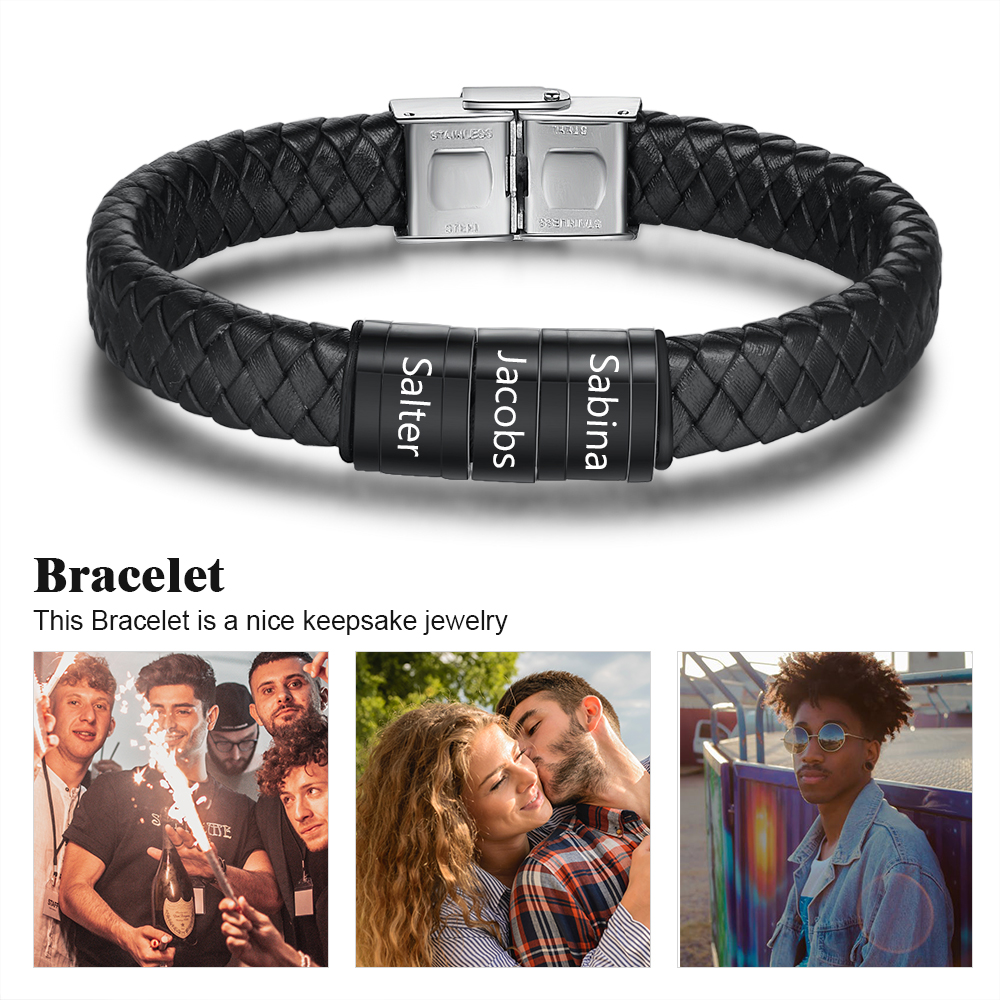 Stilvolle Details verleihen dem schwarzen Lederarmband für Männer, das auf kleinen, personalisierten Perlen eingraviert ist, eine Menge optischer Anziehungskraft. Mit einem auffälligen geflochtenen Lederband
