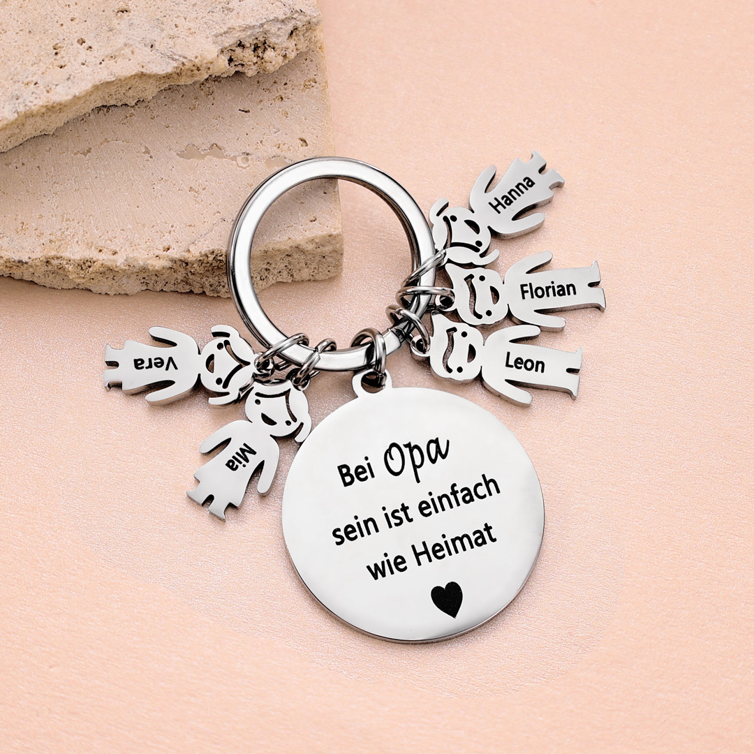 Sie werden Ihre Kinder immer in der Nähe haben, wenn Sie den Schlüsselanhänger mit Kinder-Charms und Gravur bei sich tragen. Sie können fünf Kinder-Charms wählen, die an diesem personalisierten Schlüsselanhänger befestigt sind, und jeden Namen, jedes Datum oder Wort nach Wunsch eingravieren lassen.