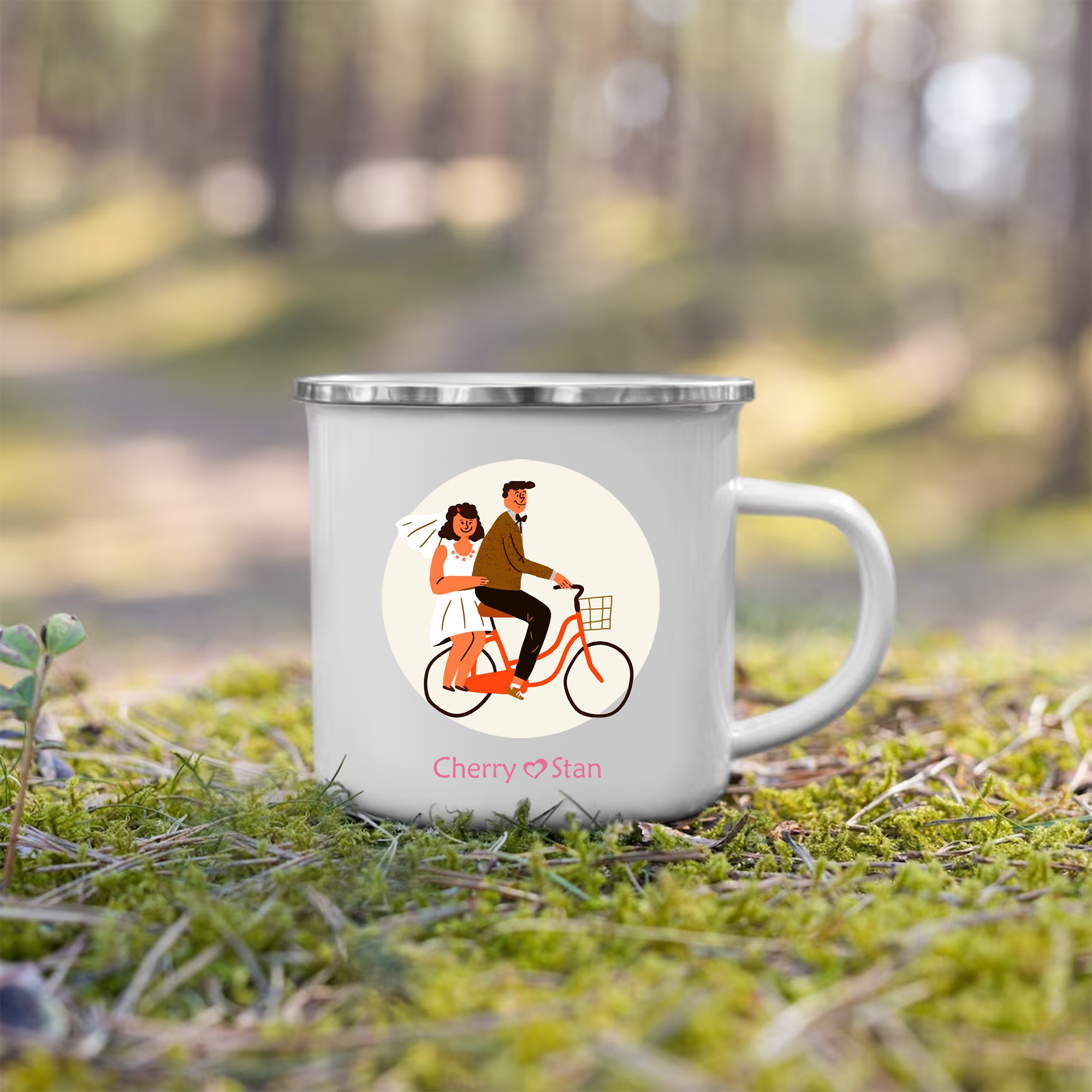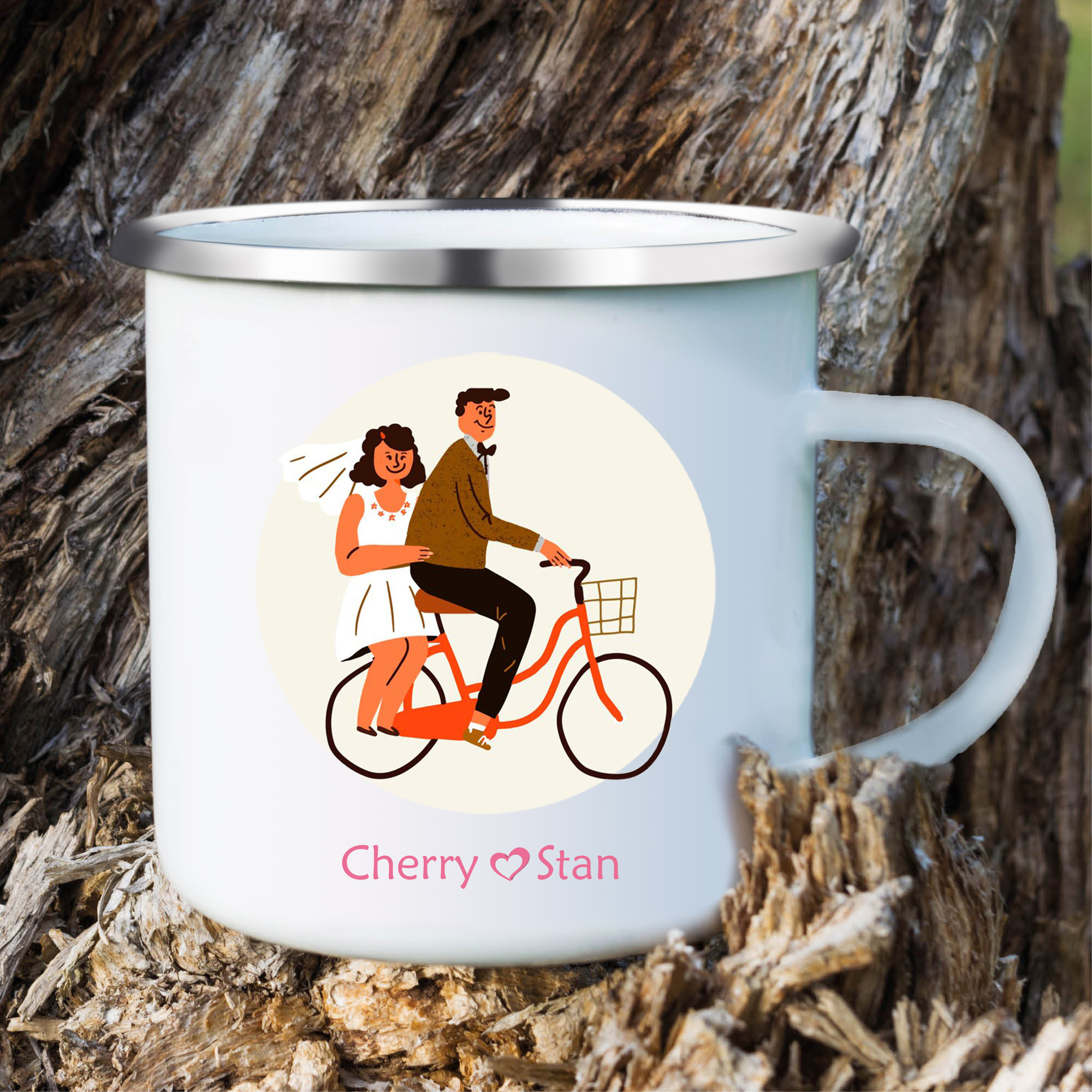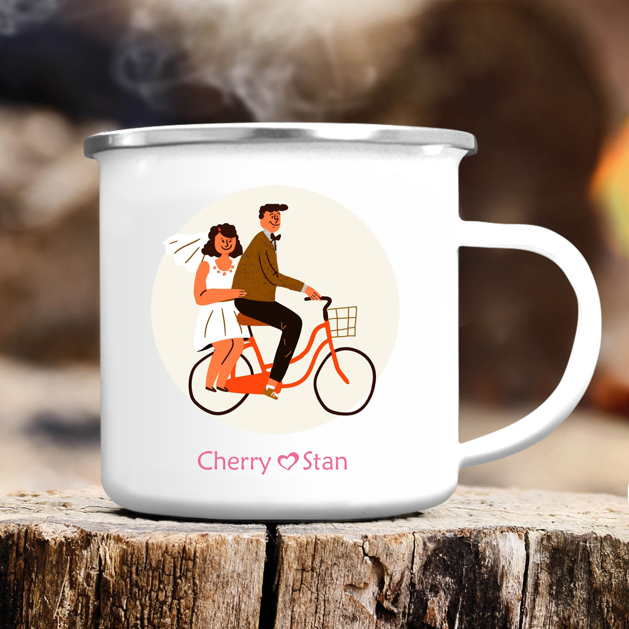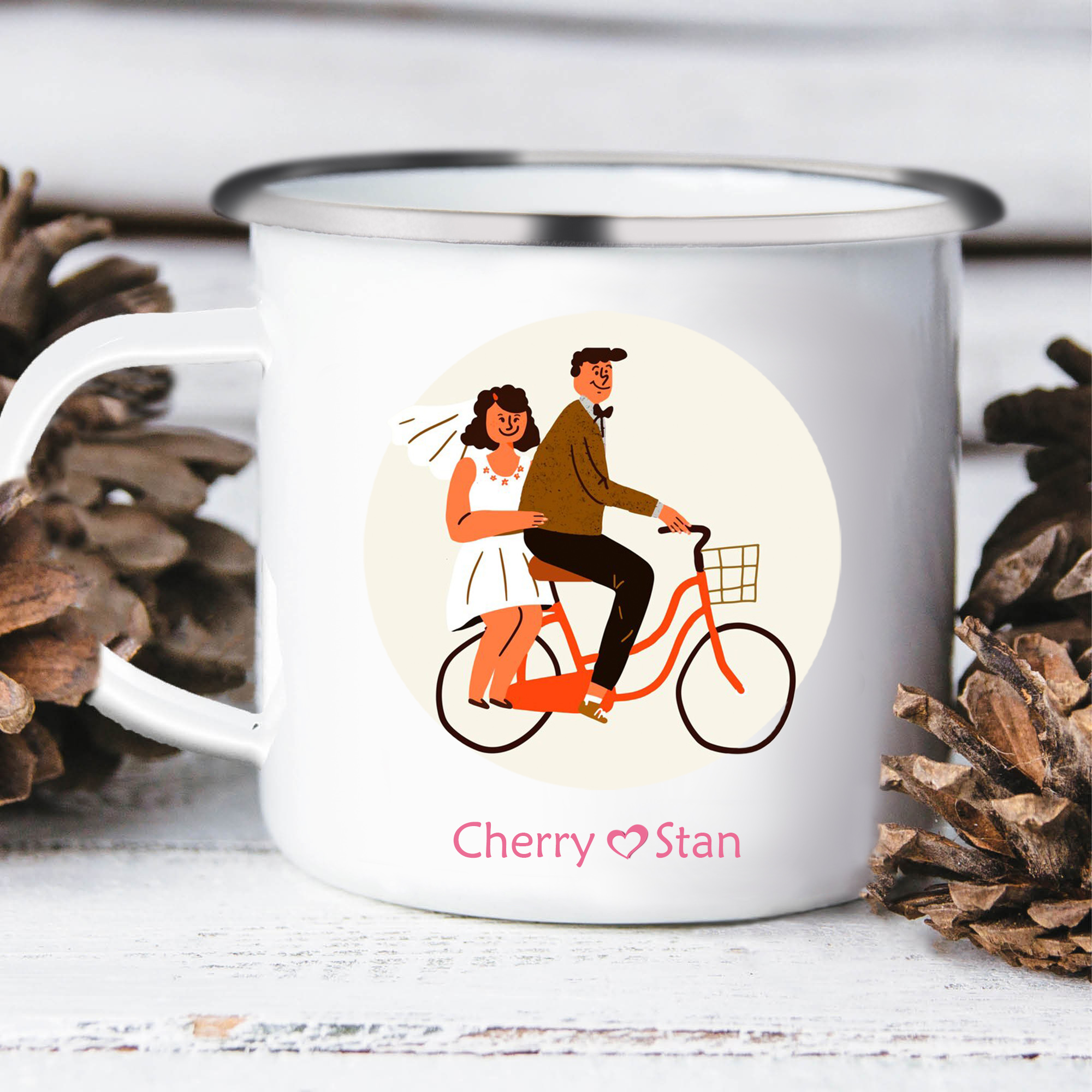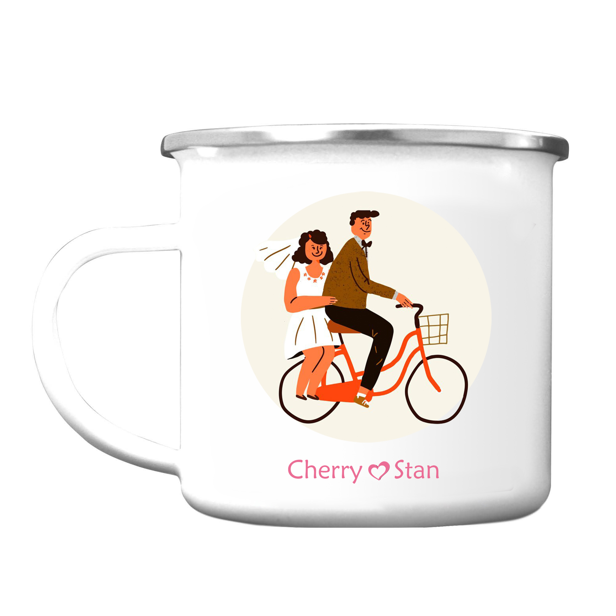 Emaille Tasse-Personalisierte 2 Namen Frischvermählte Radfahren Emaille Becher
