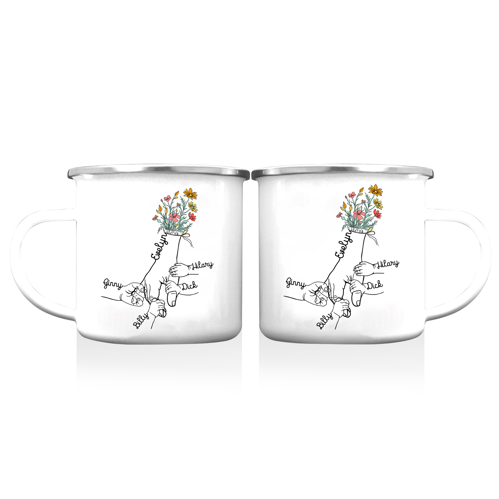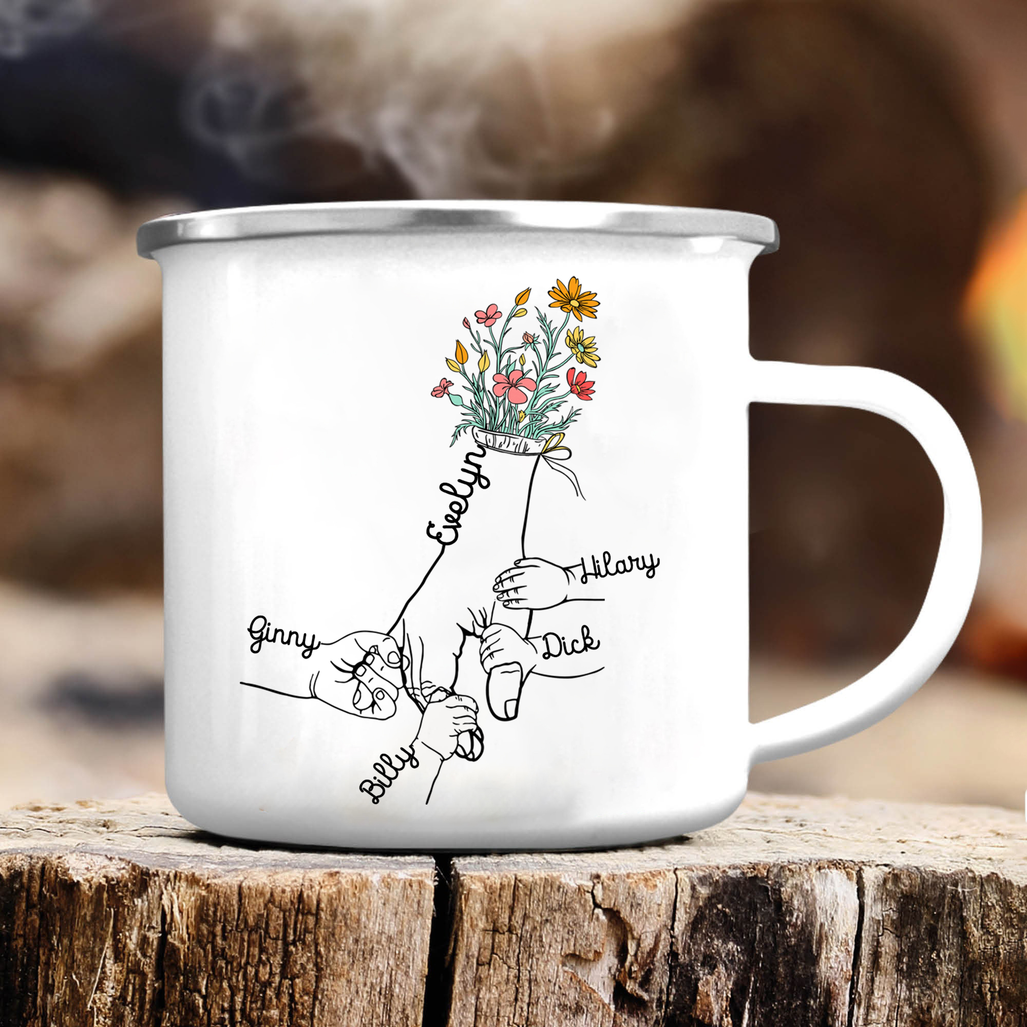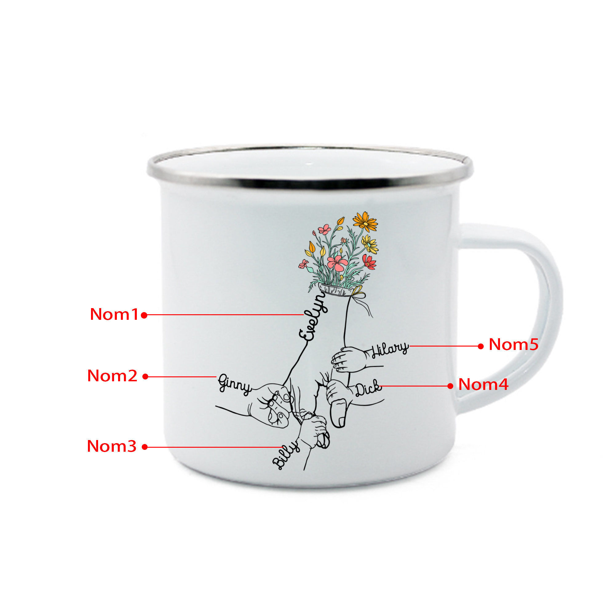 Emaille Tasse-Personalisierte 5 Namen Blume Hand in Hand Familie Emaille Becher