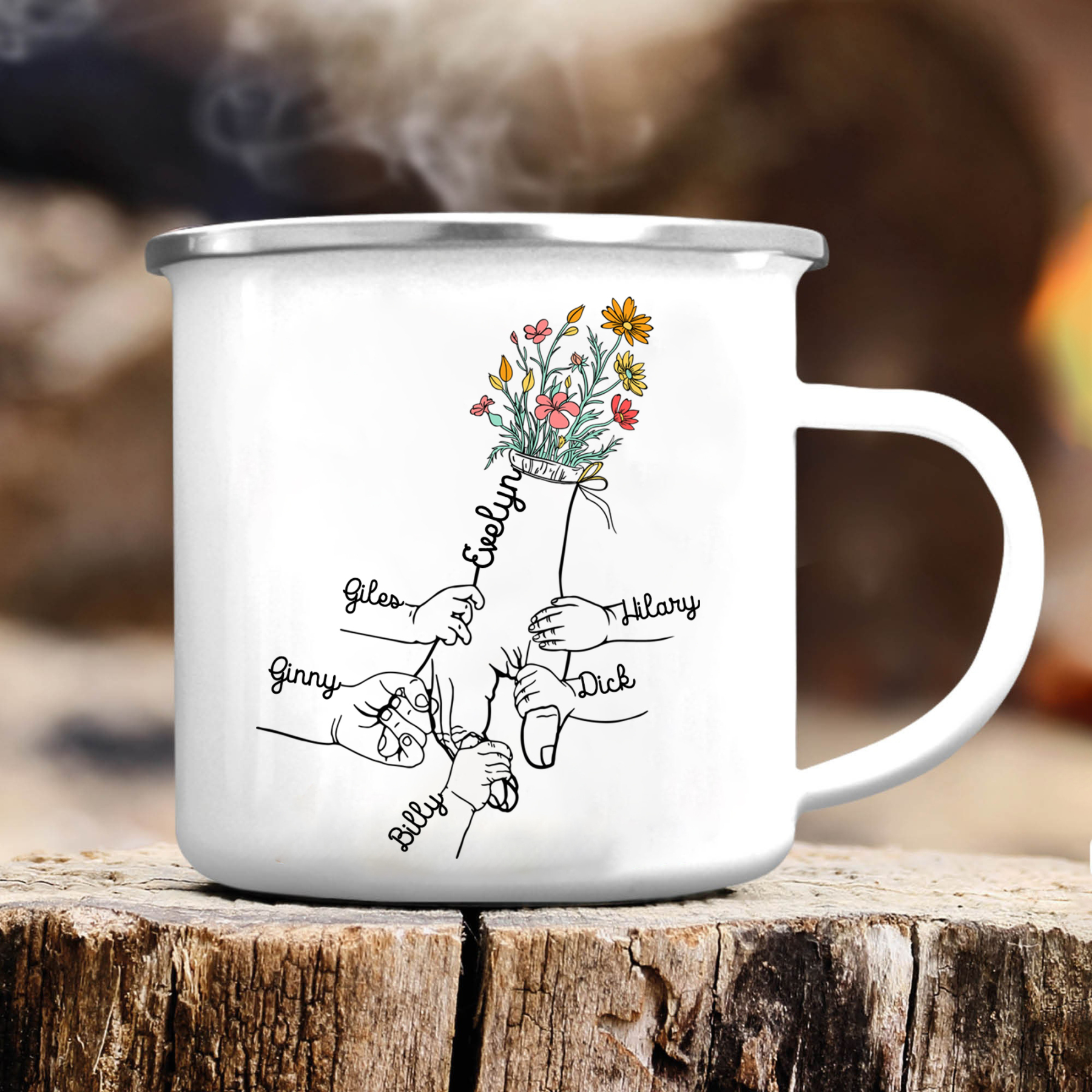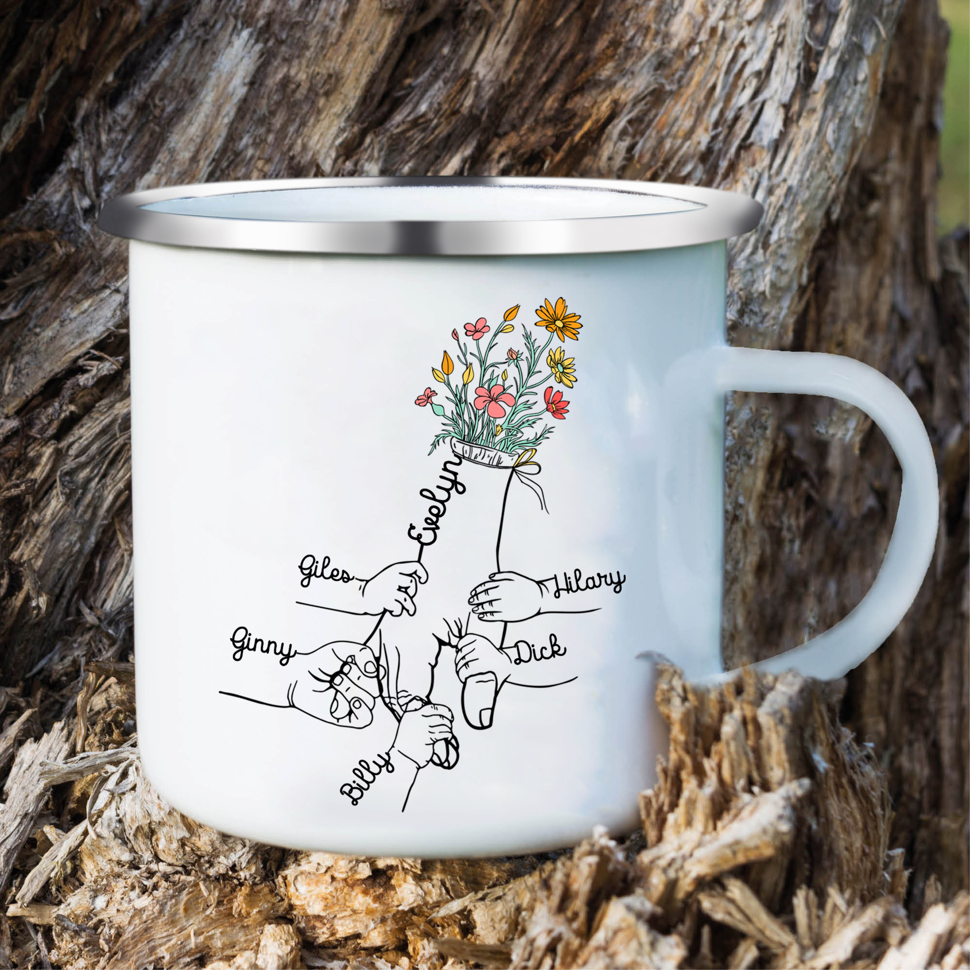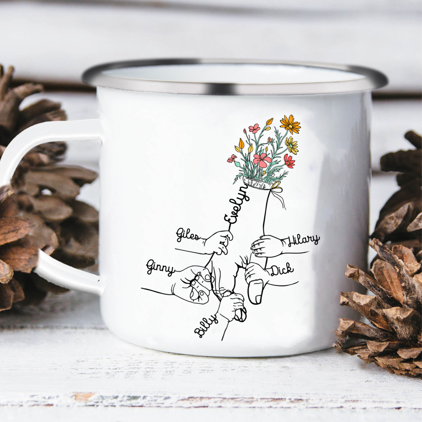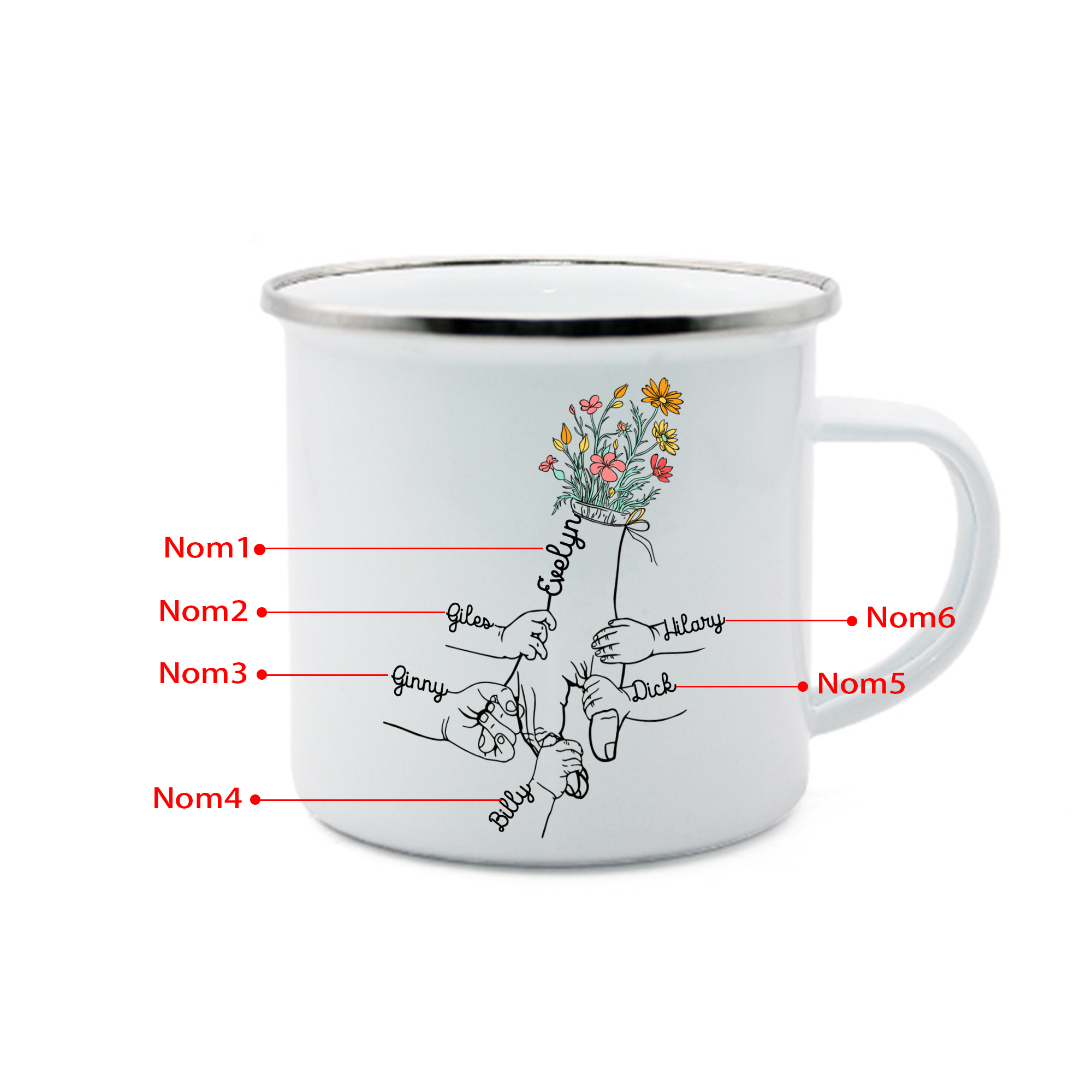 Emaille Tasse-Personalisierte 6 Namen Blume Hand in Hand Familie Emaille Becher
