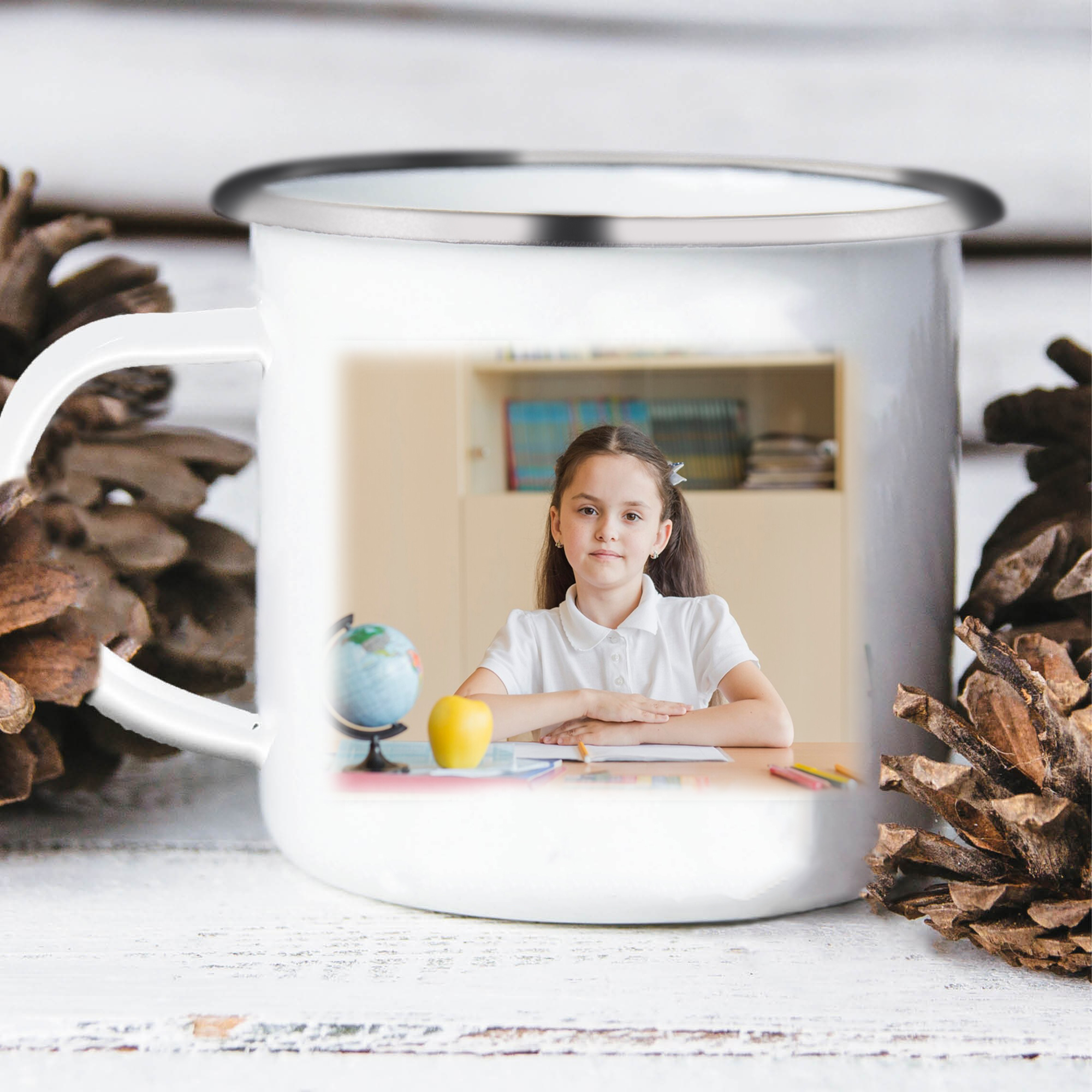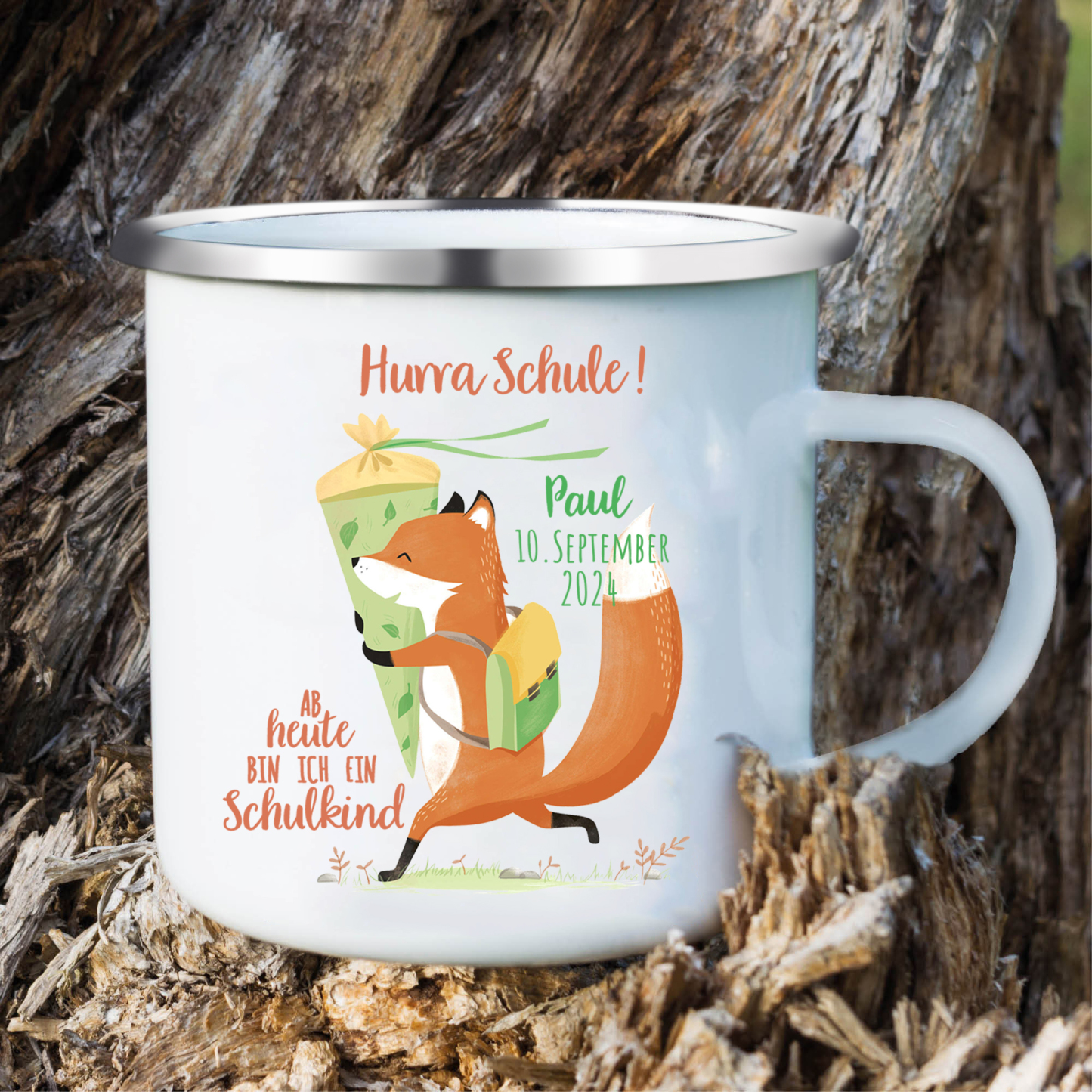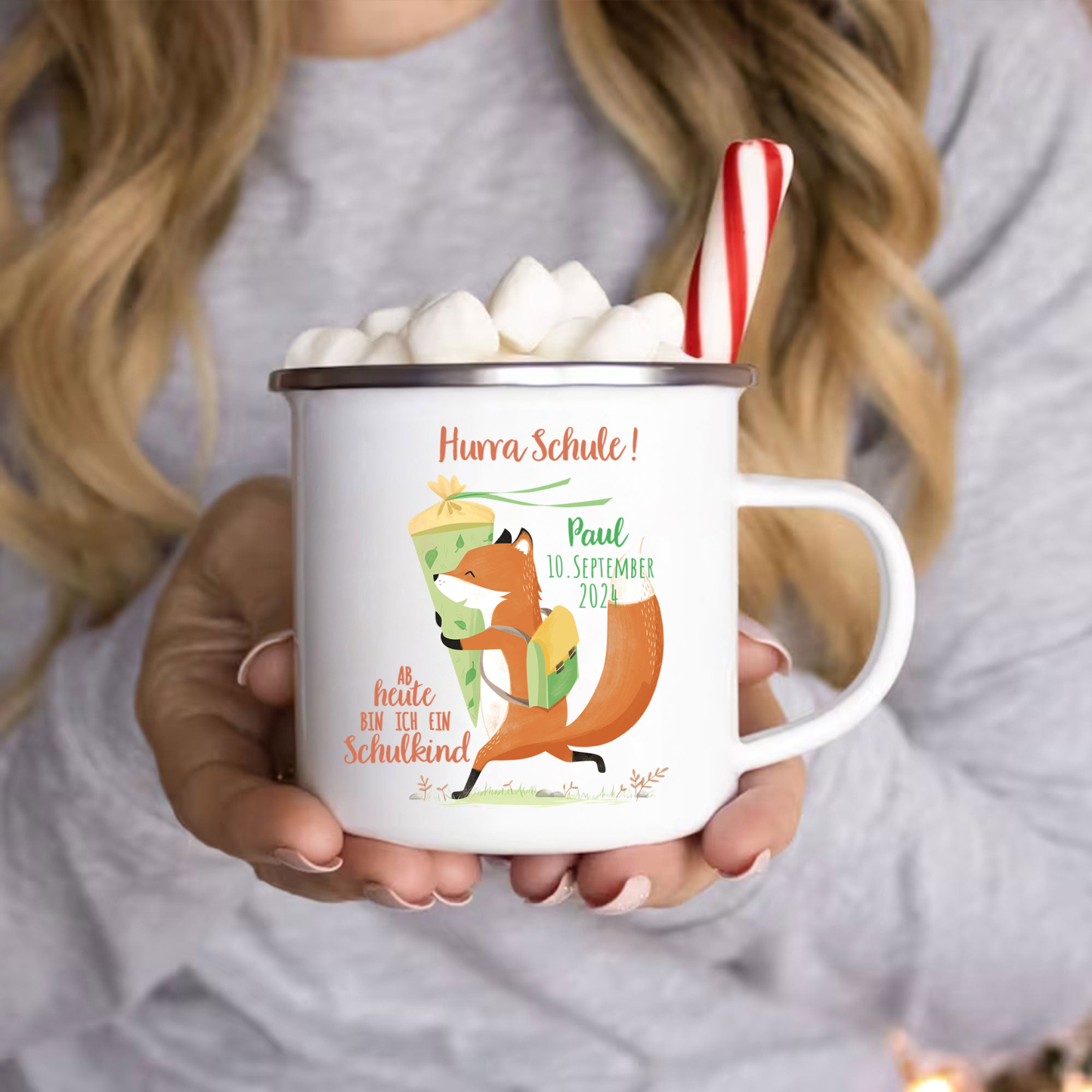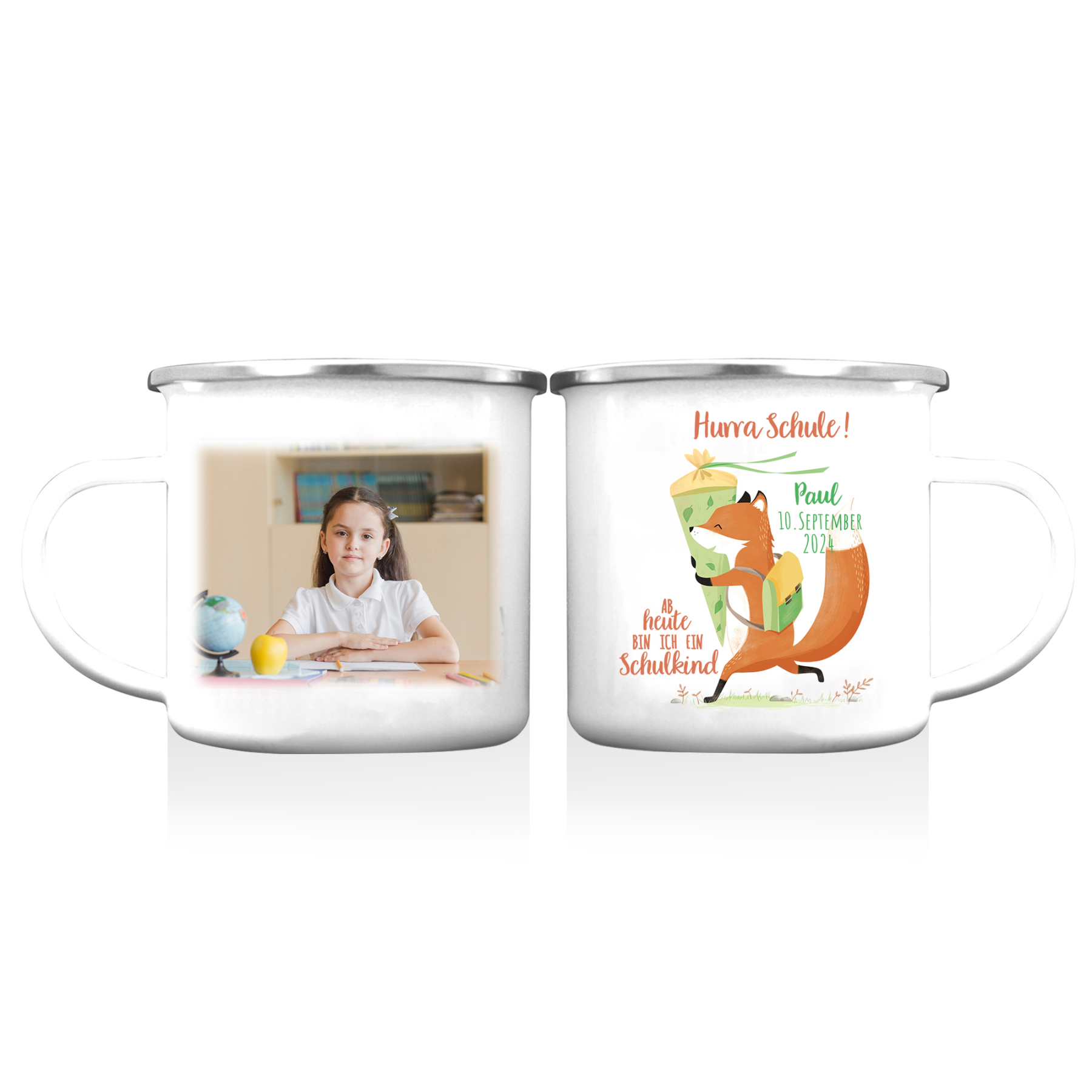 Emaille Tasse-Personalisierter Name & Datum & Foto Becher - Hurra Schule! Ab heute bin ich ein Schulkind - Geschenk zum Schulanfang