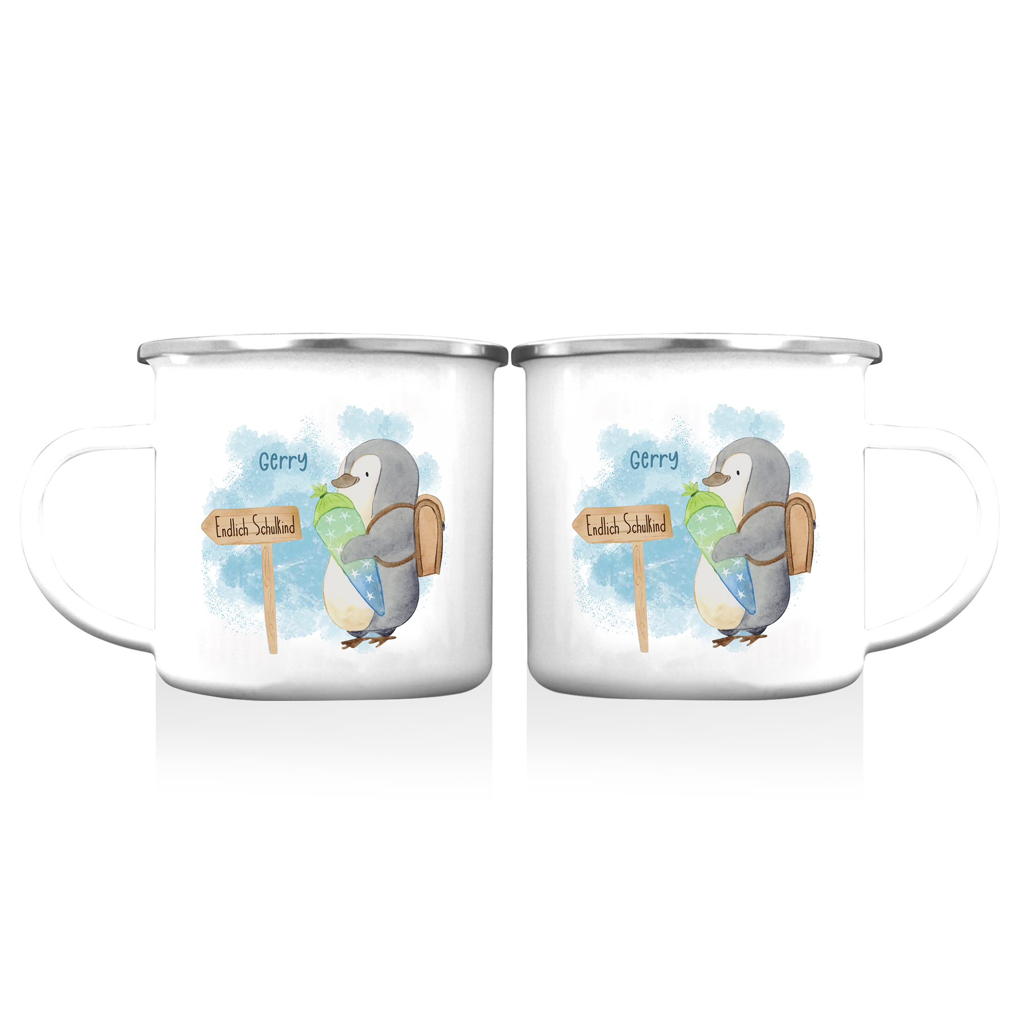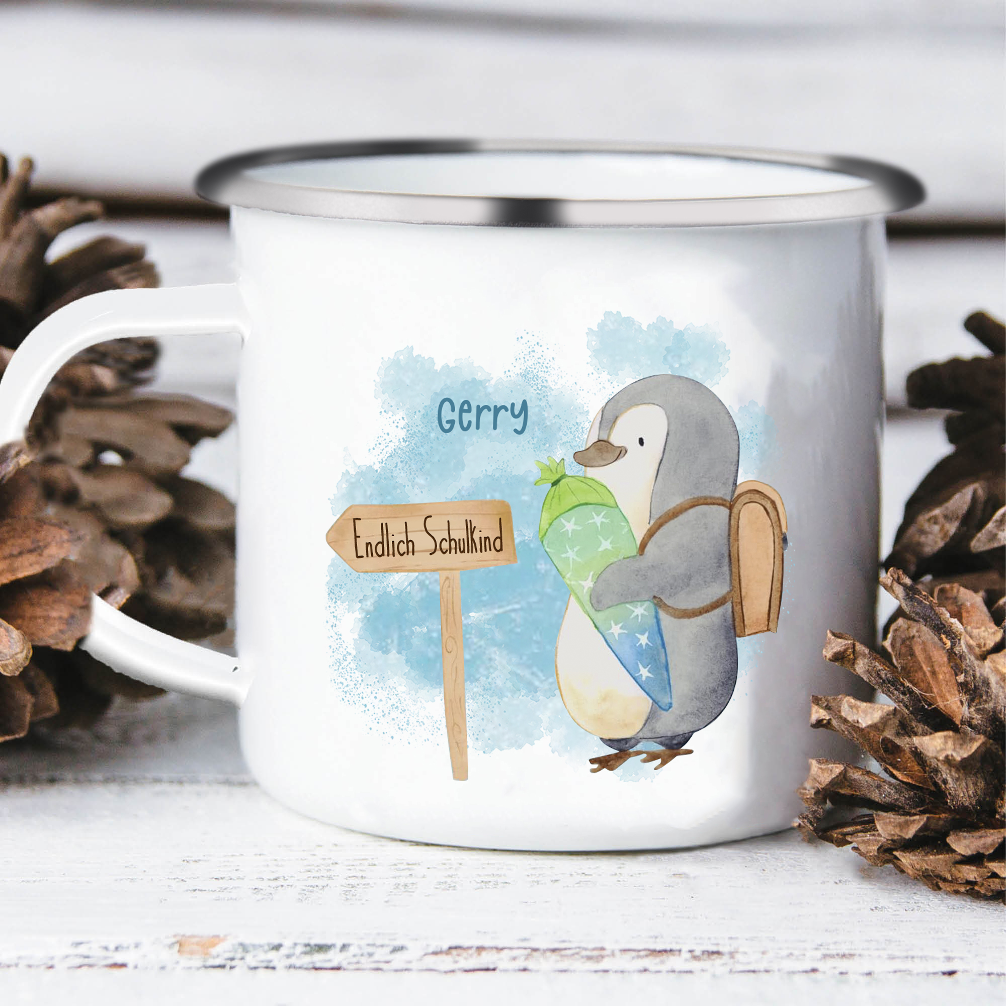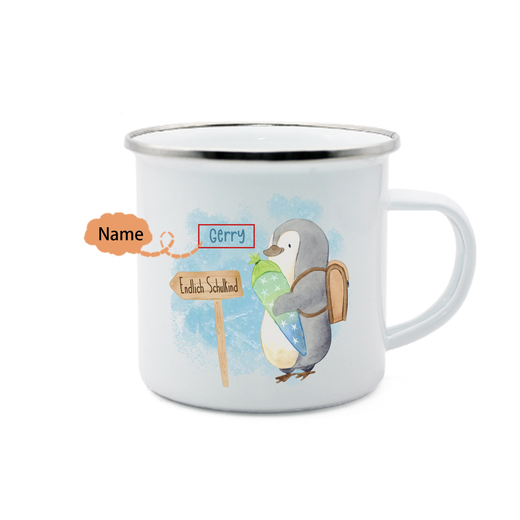 Emaille Tasse-Personalisierter Name Emaille Becher Pinguin Endlich Schukind Schulkind Geschenk zum Schulanfang