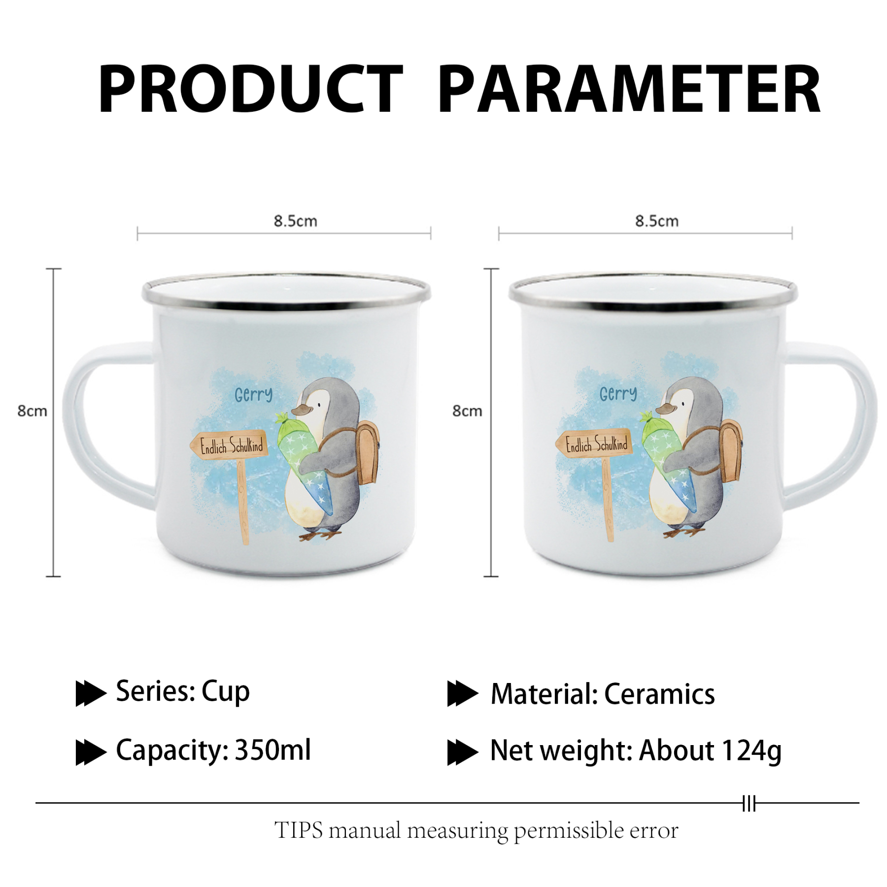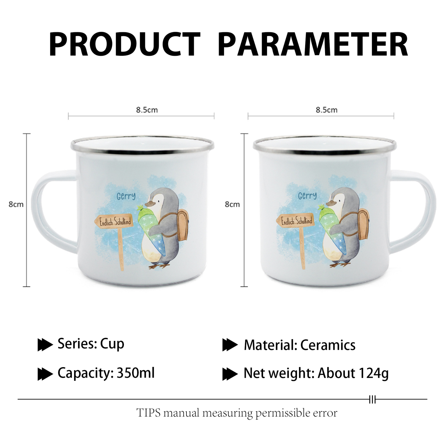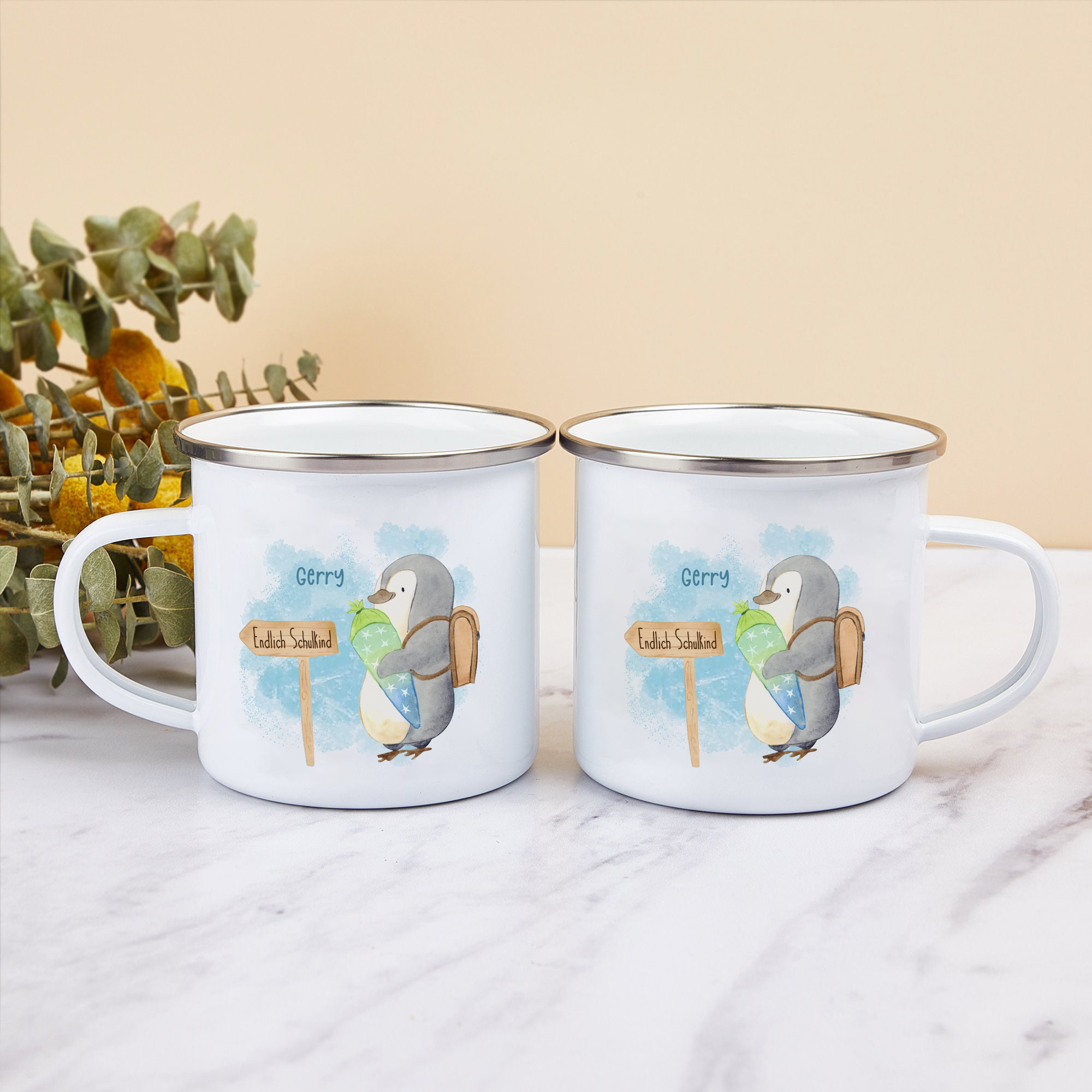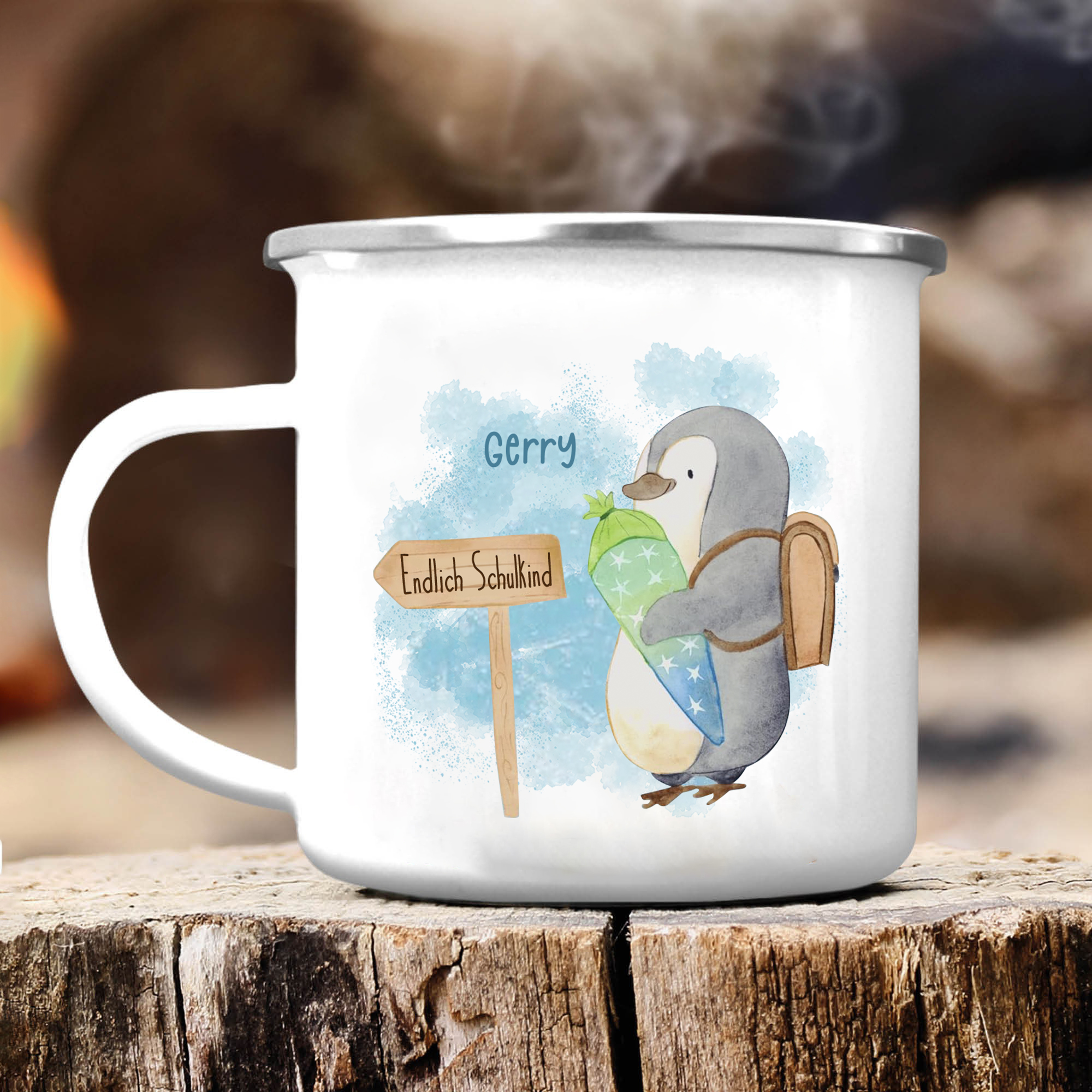 Emaille Tasse-Personalisierter Name Emaille Becher Pinguin Endlich Schukind Schulkind Geschenk zum Schulanfang
