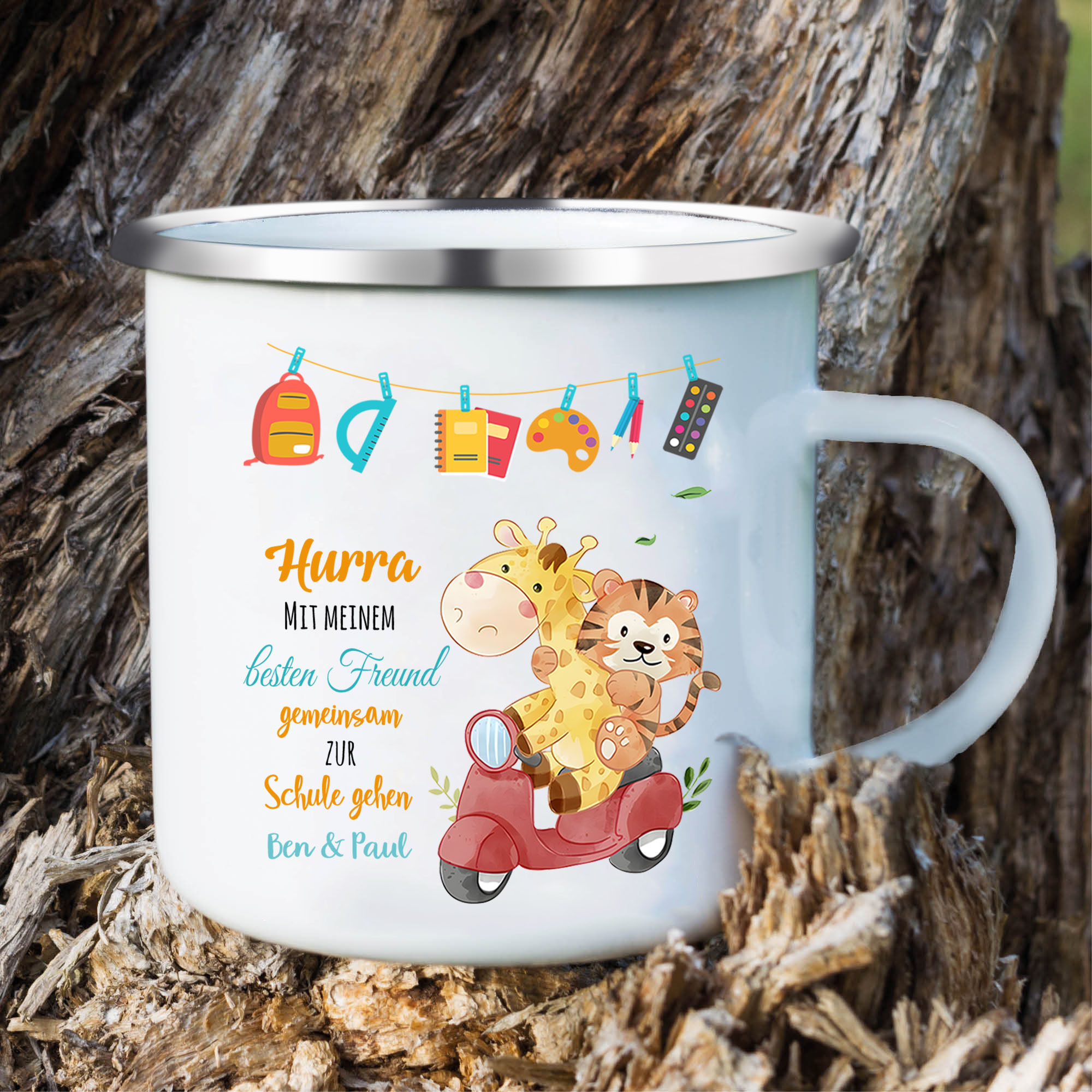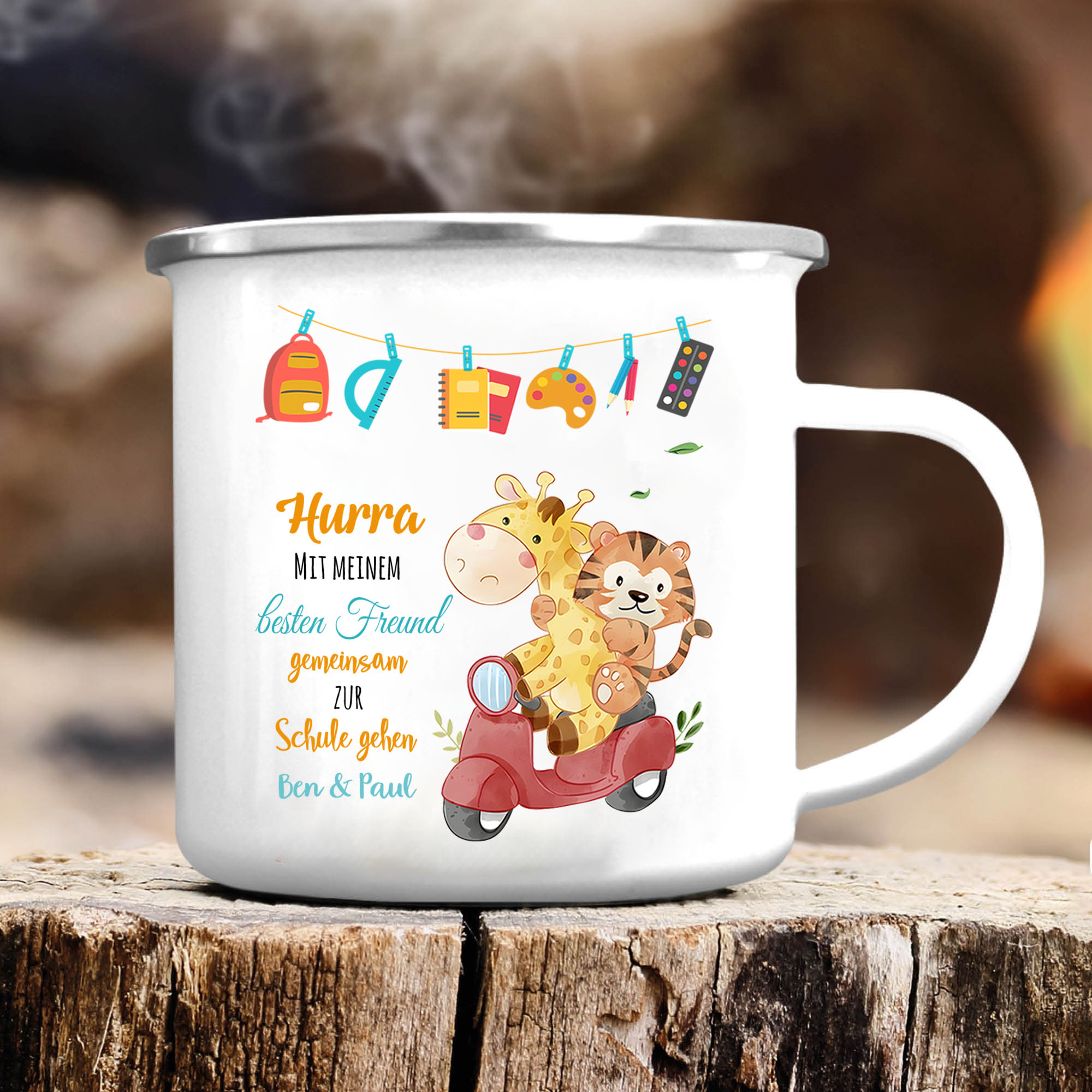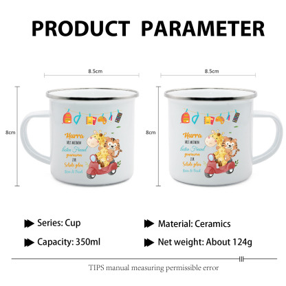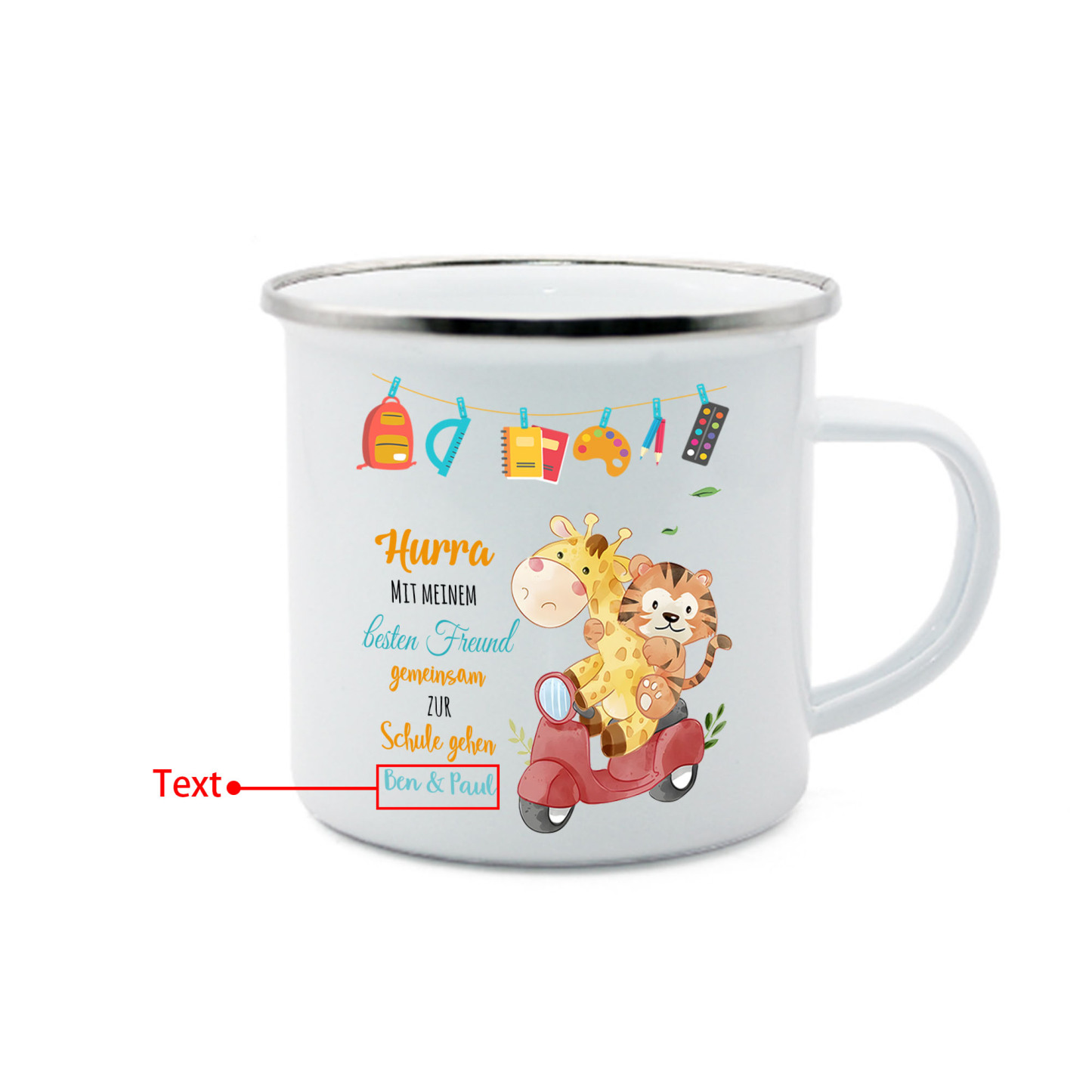 Emaille Tasse-Personalisierter Text Emaille Becher - Hurra mit meinem besten Freund gemeinsam zur Schule gehen - Geschenk zum Schulanfang