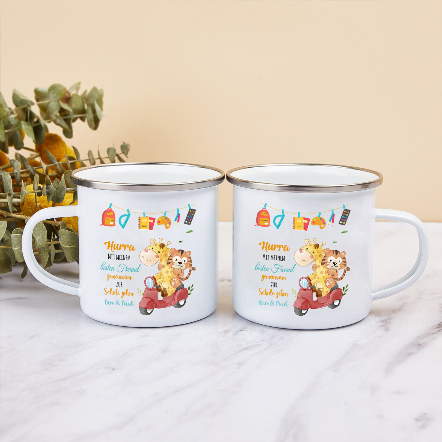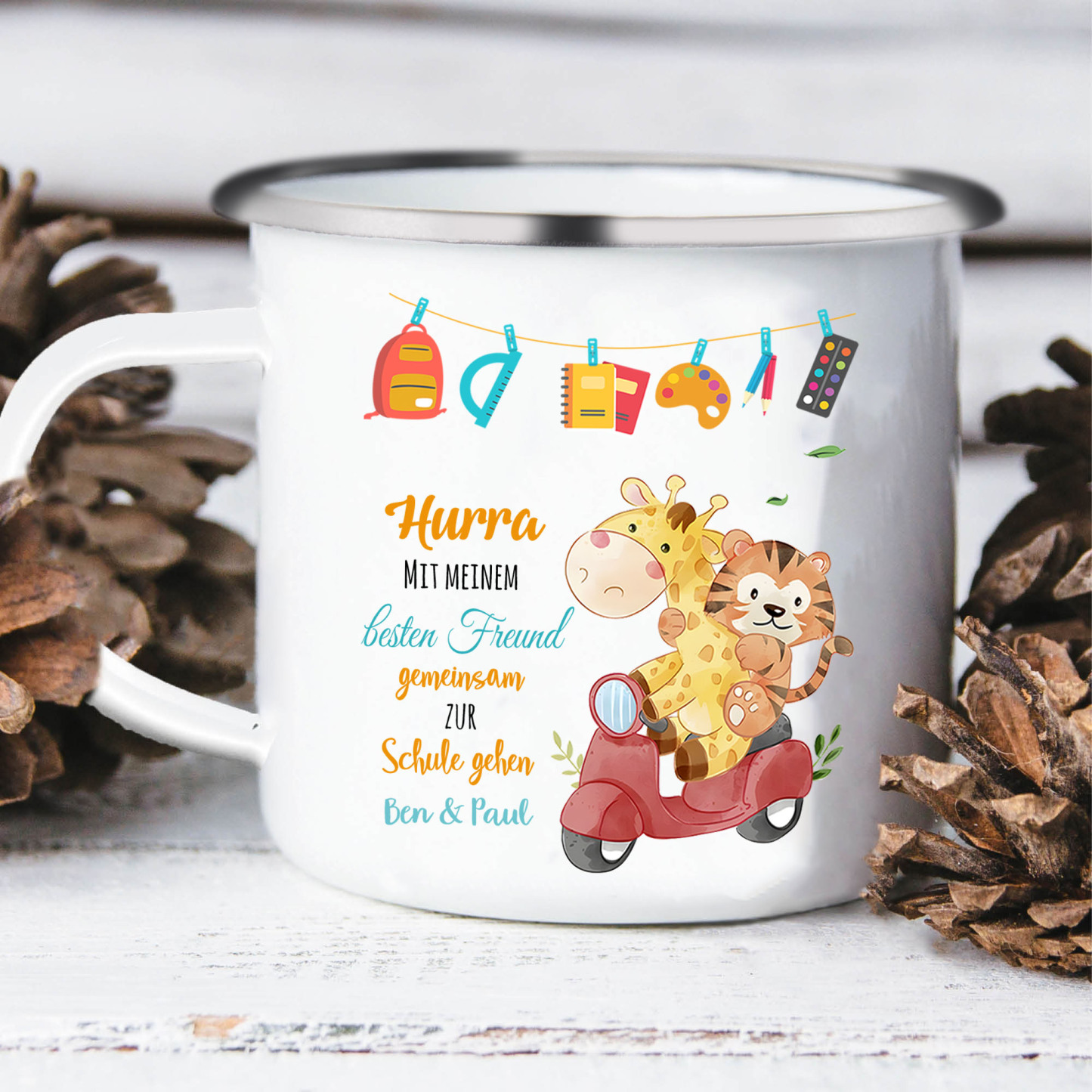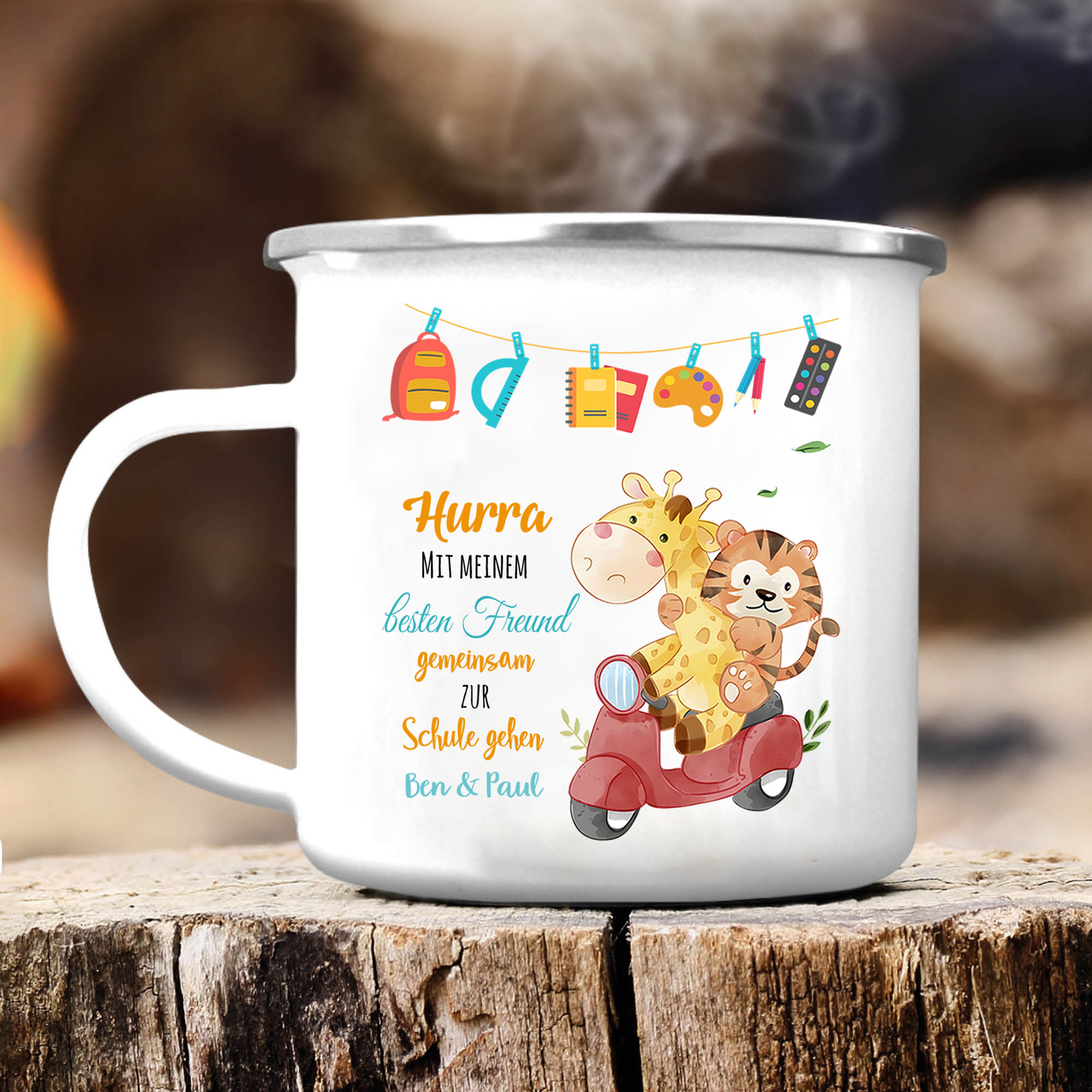 Emaille Tasse-Personalisierter Text Emaille Becher - Hurra mit meinem besten Freund gemeinsam zur Schule gehen - Geschenk zum Schulanfang