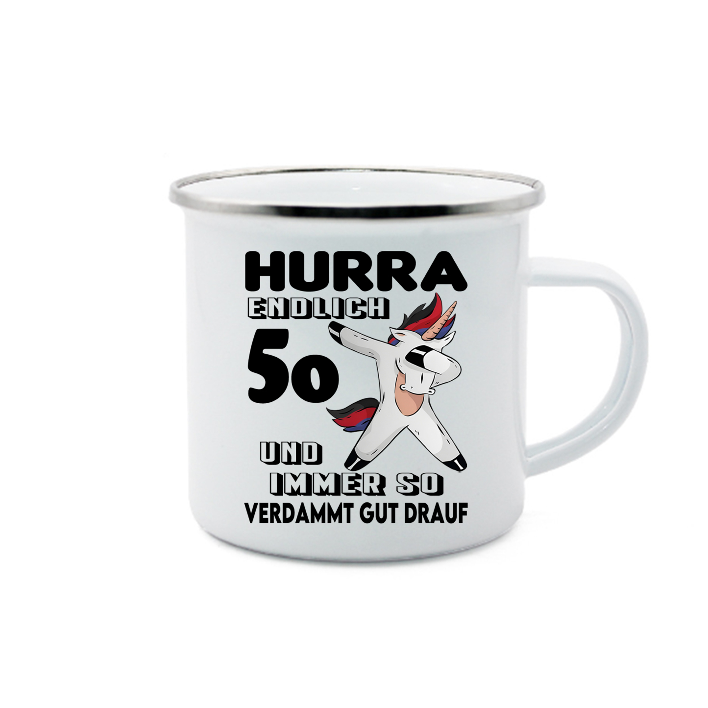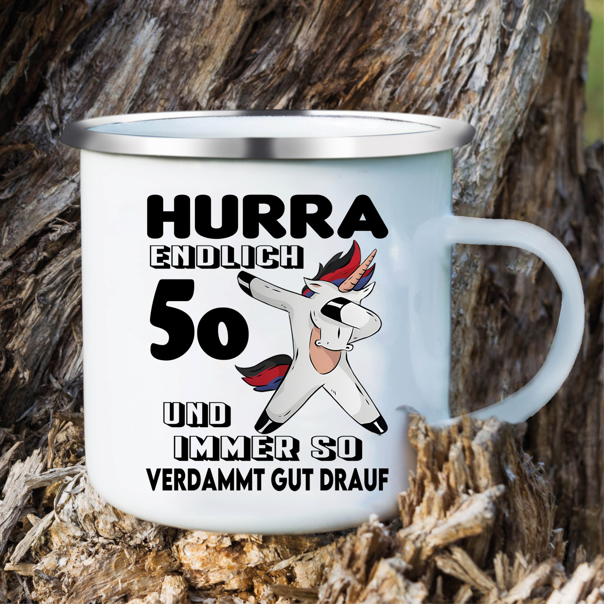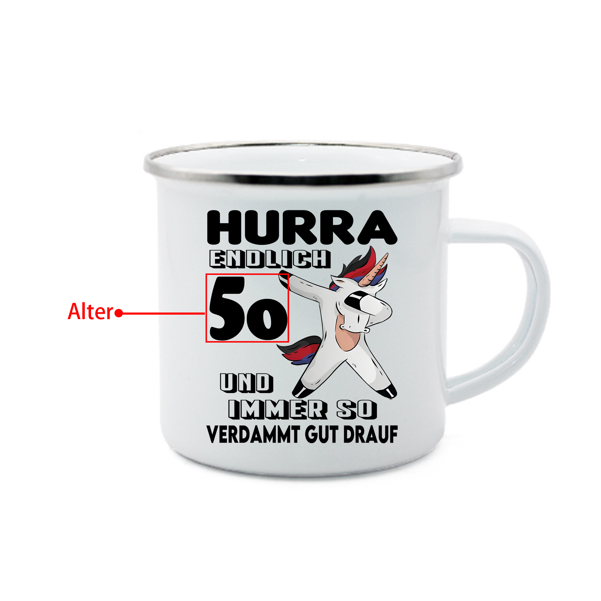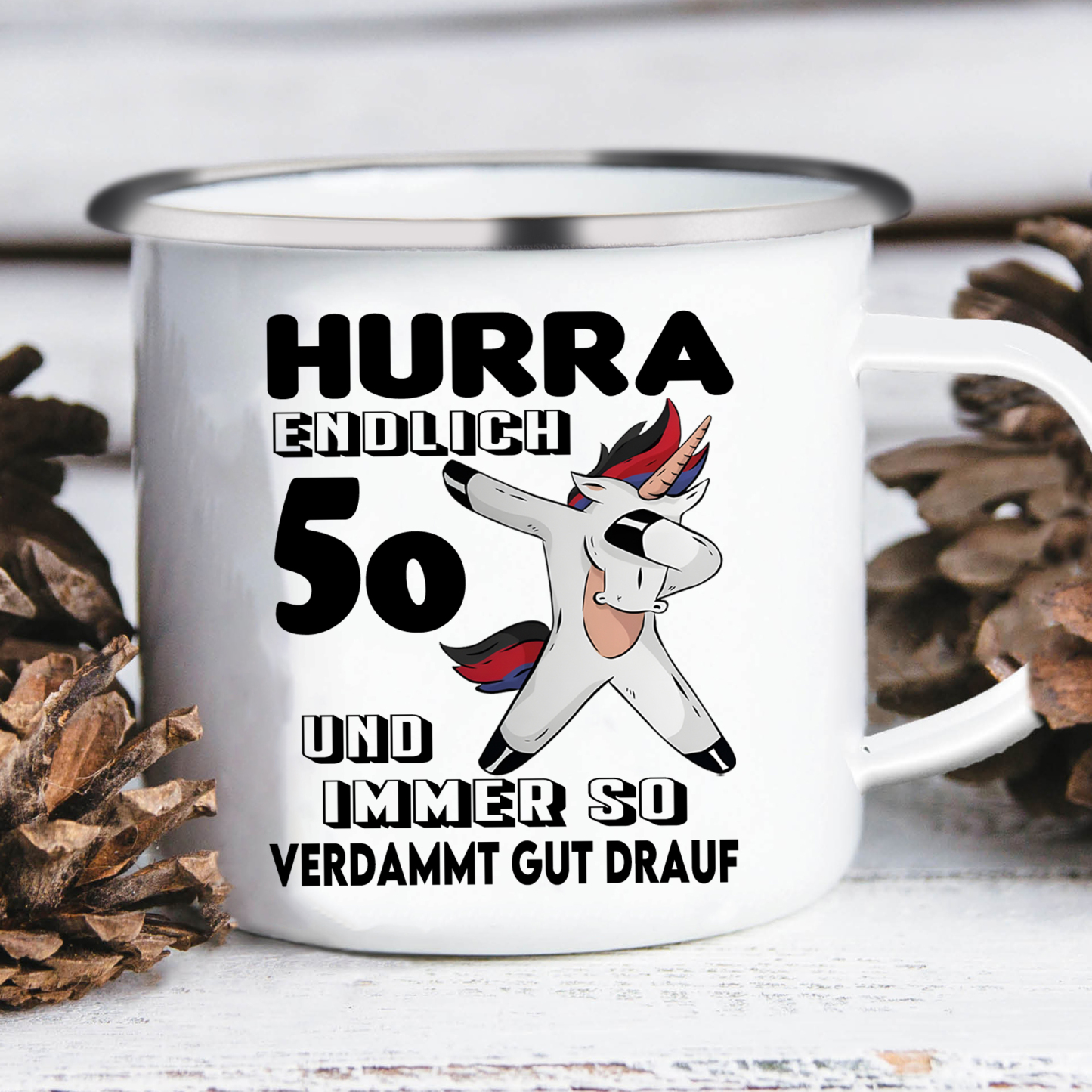 Emaille Tasse-Personalisiertes Alter Hurra endlich 50 und immer so verdammt gut drauf Emaille Becher- Geburtstagsgeschenk lustig und witzig Geschenk
