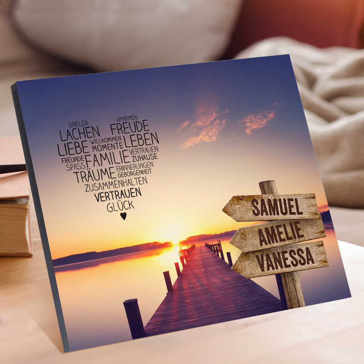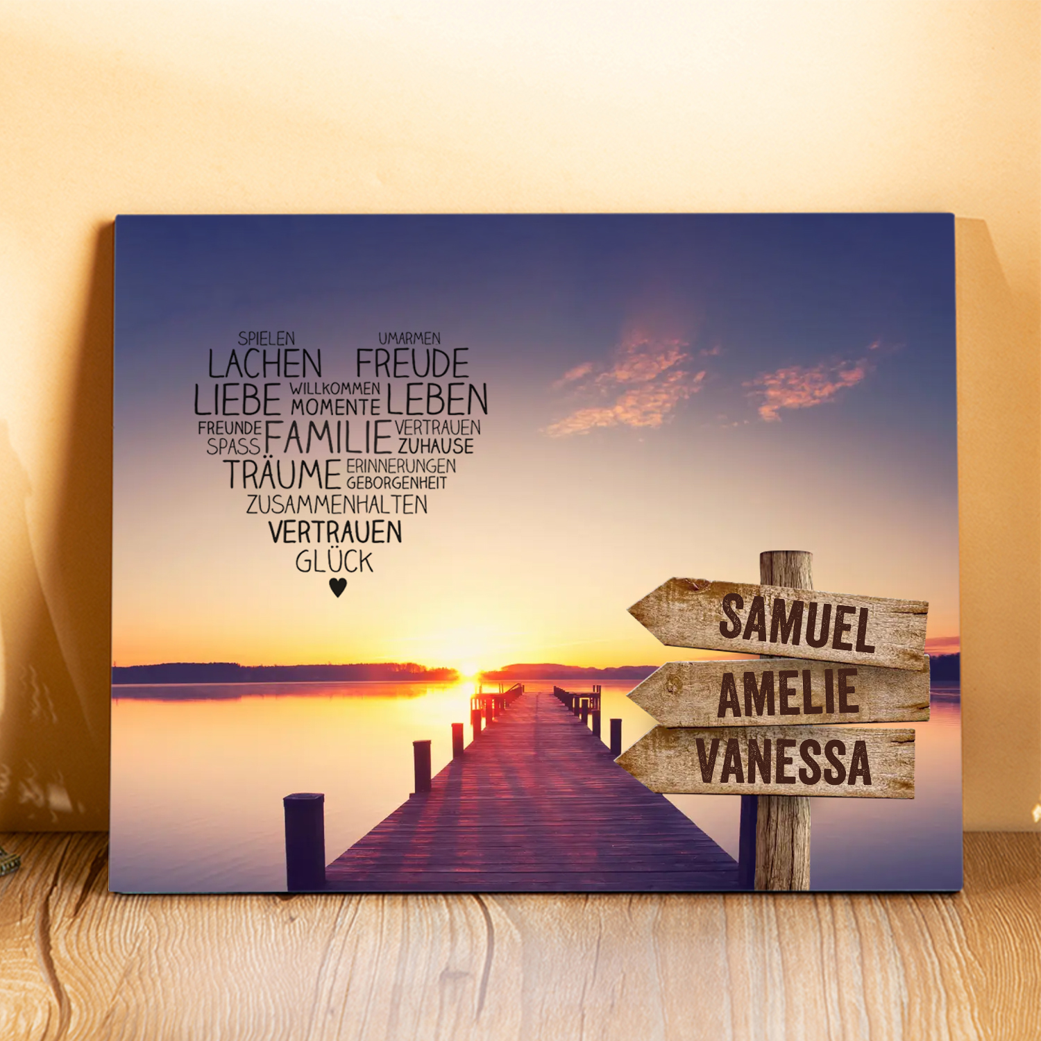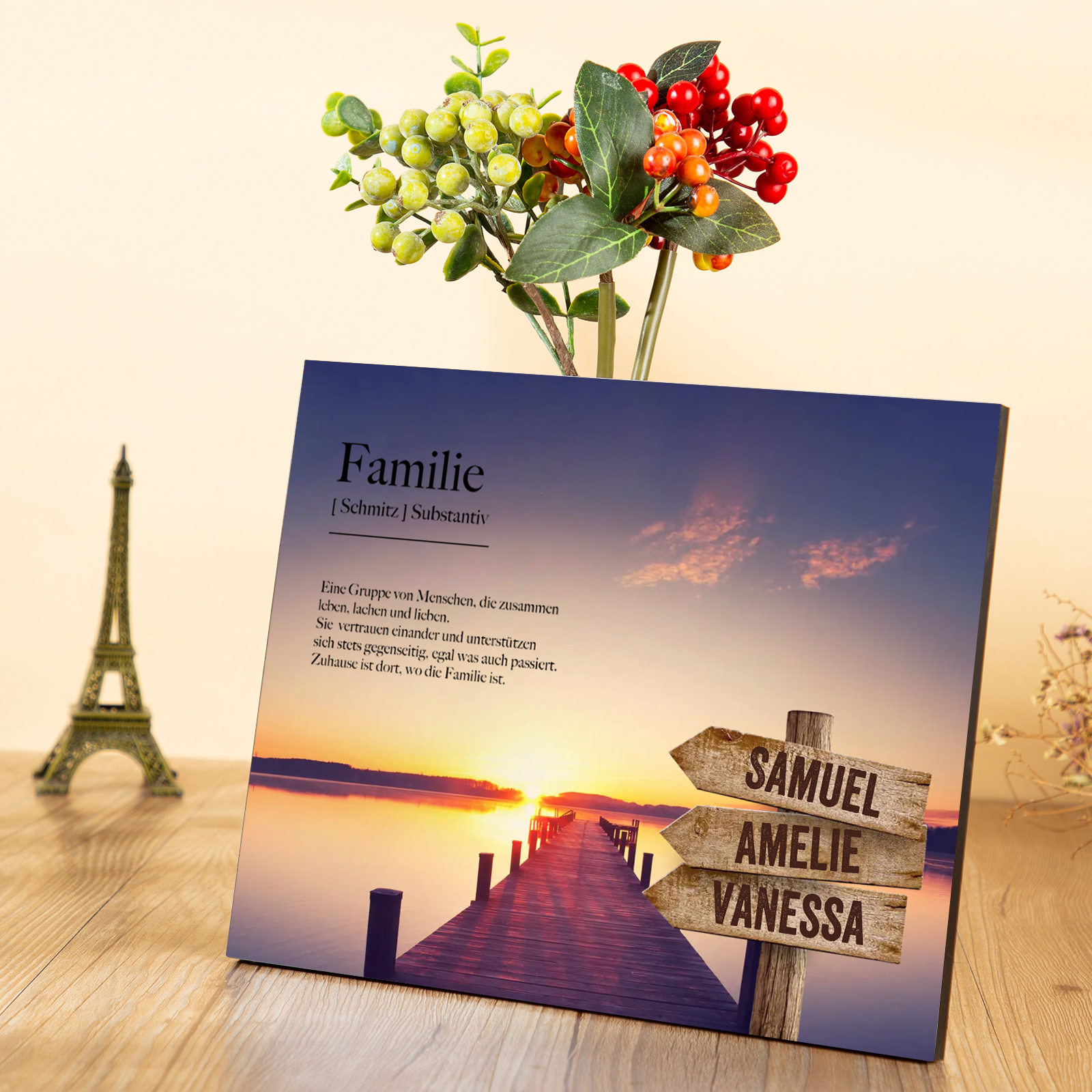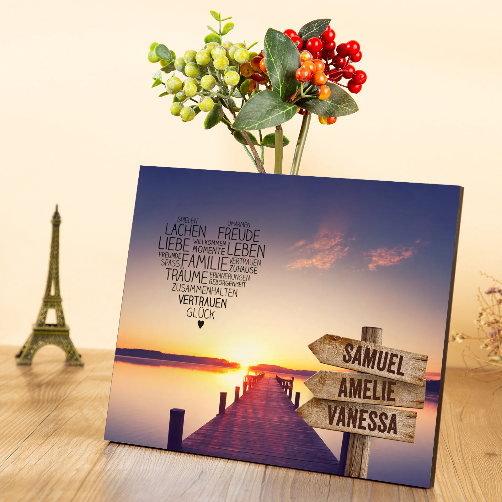Familie Holzbild-Personalisierter 3 Namen-Zuhause ist dort, wo die Familie ist/Famile Herz/Wildgans Herz-Holzdekoration