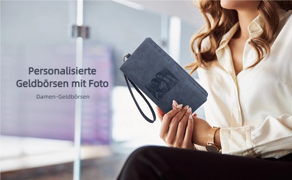 Frauen Personalisierte Foto & Text & Name Brieftasche Blau Leder Lange Geldbörse