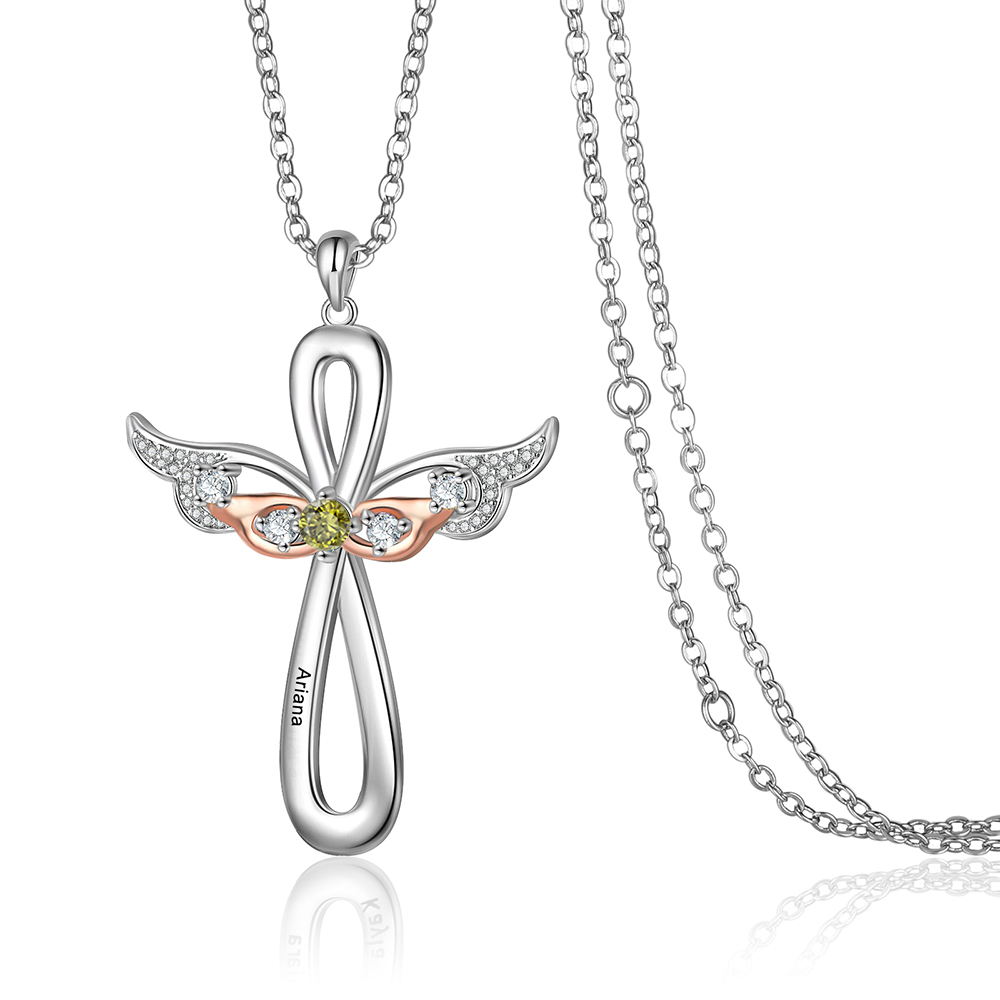 Gravur 1 Name Kommunion Kreuz Flügel Halskette mit 1 Geburtsstein Kette