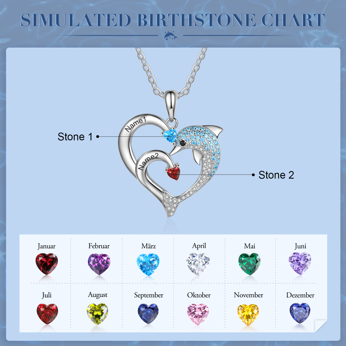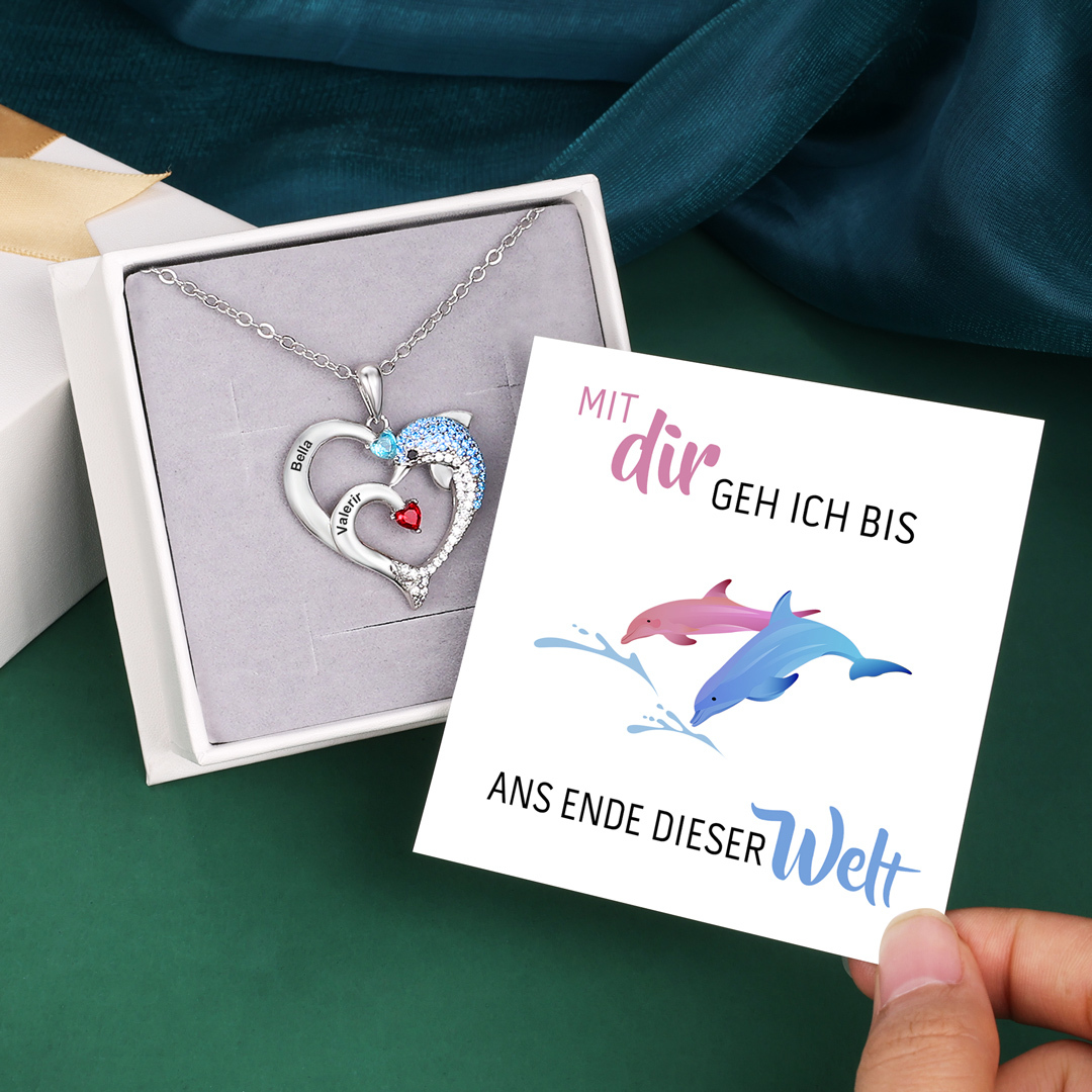Gravur 2 Namen Herz Delphin Halskette mit 2 Geburtssteinen