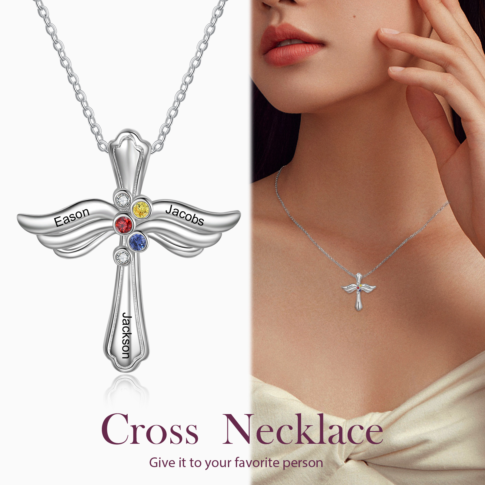 Gravur 3 Namen Kommunion Kreuz Flügel Halskette mit 3 Geburtssteinen Kette