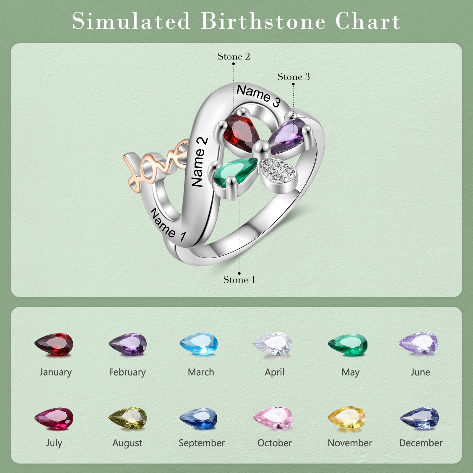 Gravur 3 Namen Schmetterling "LOVE" Ring mit 3 Geburtssteinen