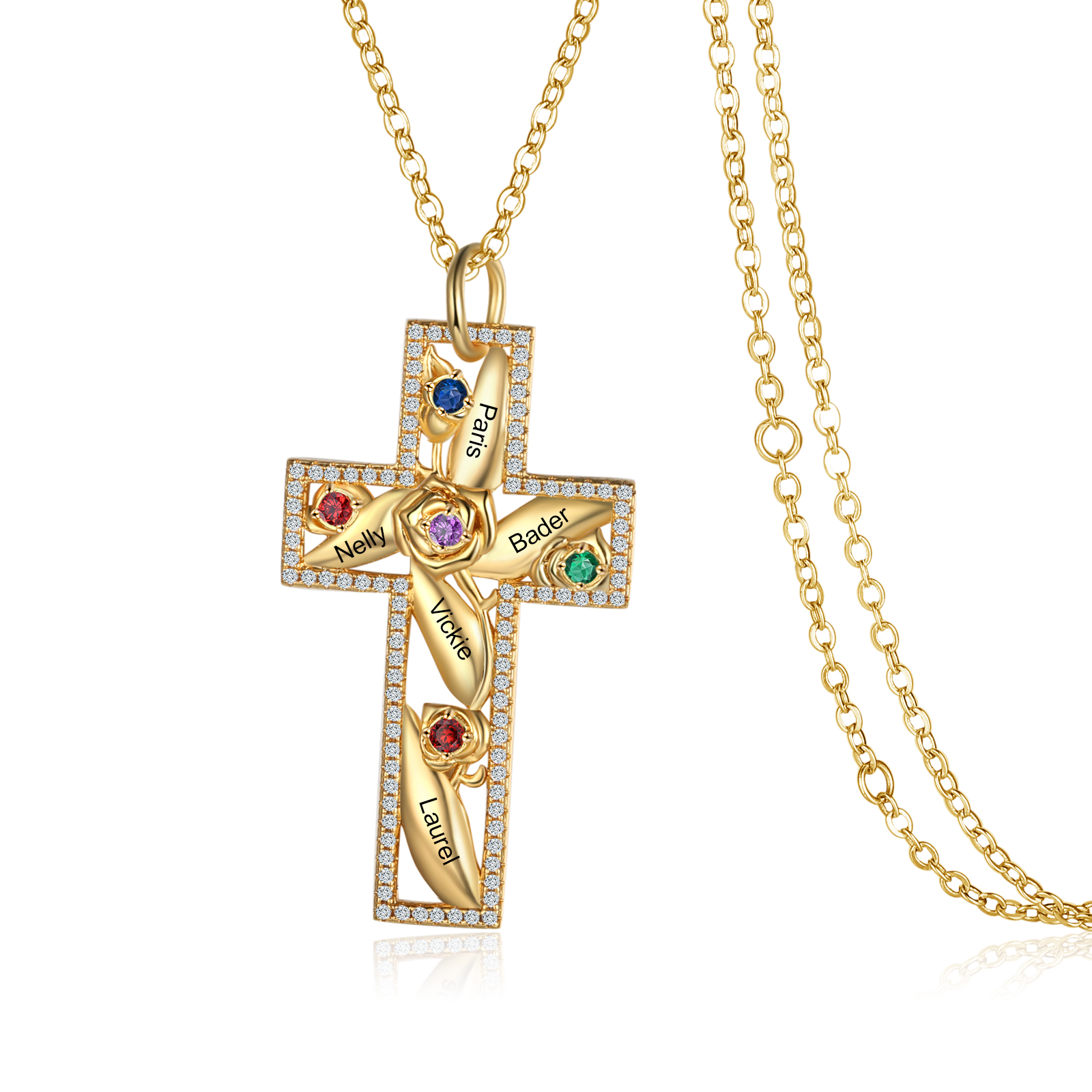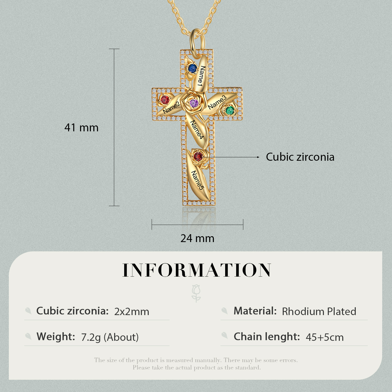 Gravur 5 Namen Kommunion Kreuz Rose Blume Halskette mit 5 Geburtssteinen Kette