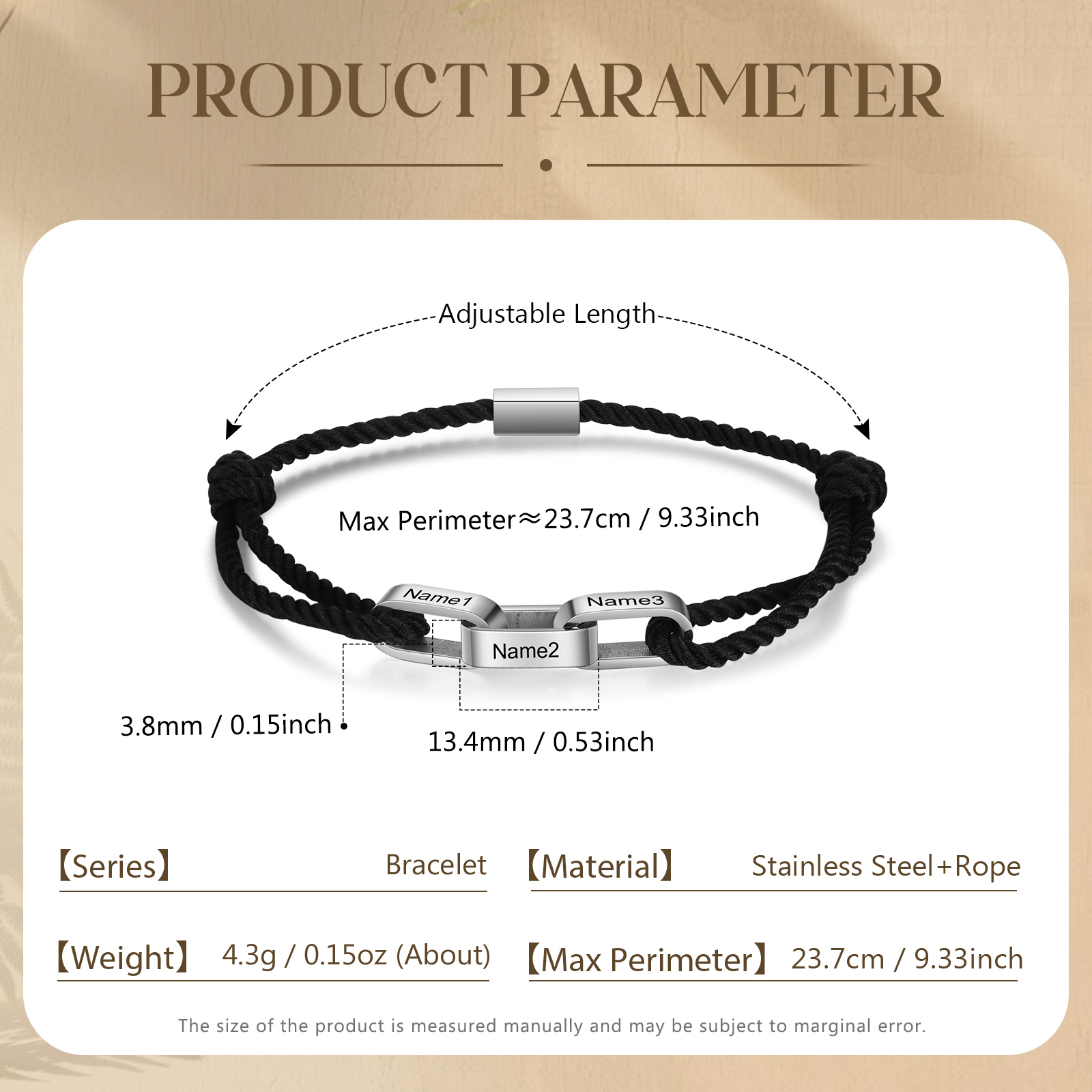 Herren Personalisierte 3 Namen Edelstahl Perle Schwarz Handseil Armband
