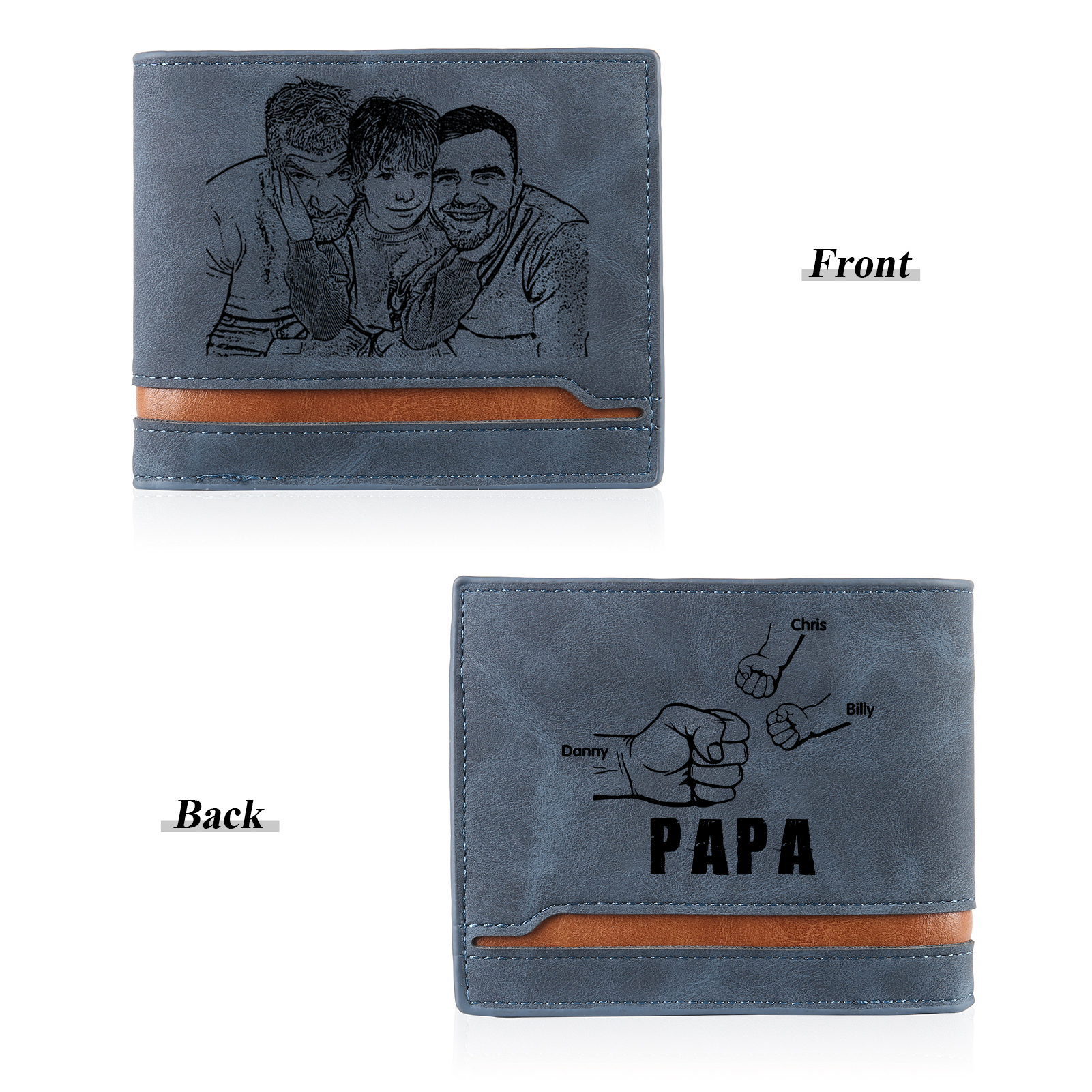 Herren Personalisierte 3 Namen & Foto Leder Papa und Kind Faust Geldbörse Geschenk für Vater