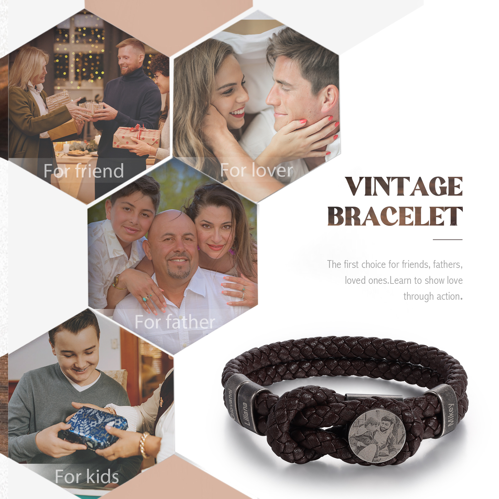 Herren Personalisierte 3 Namen & Foto Leder Vintage Armband