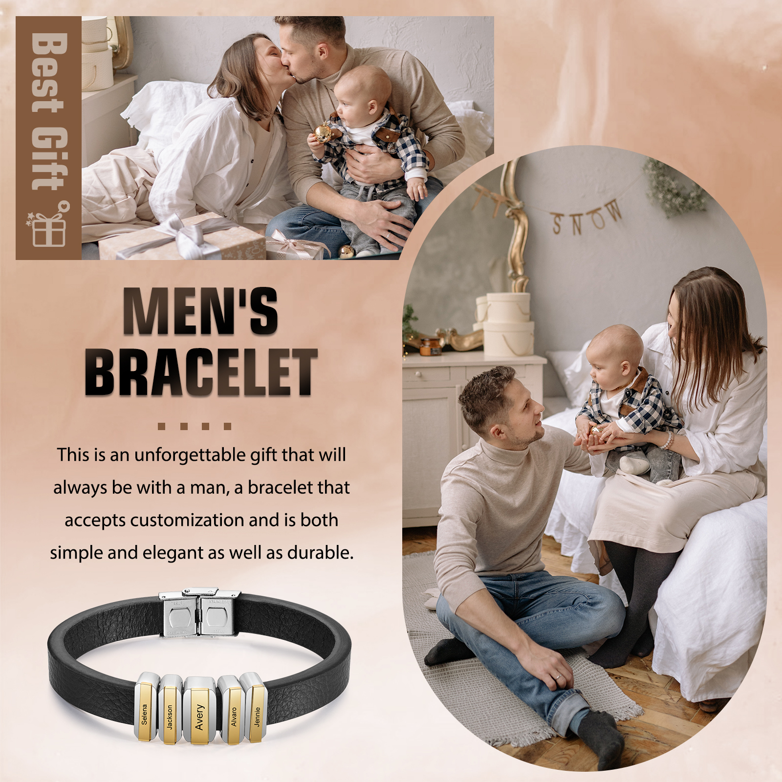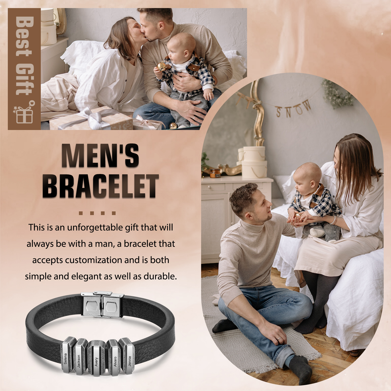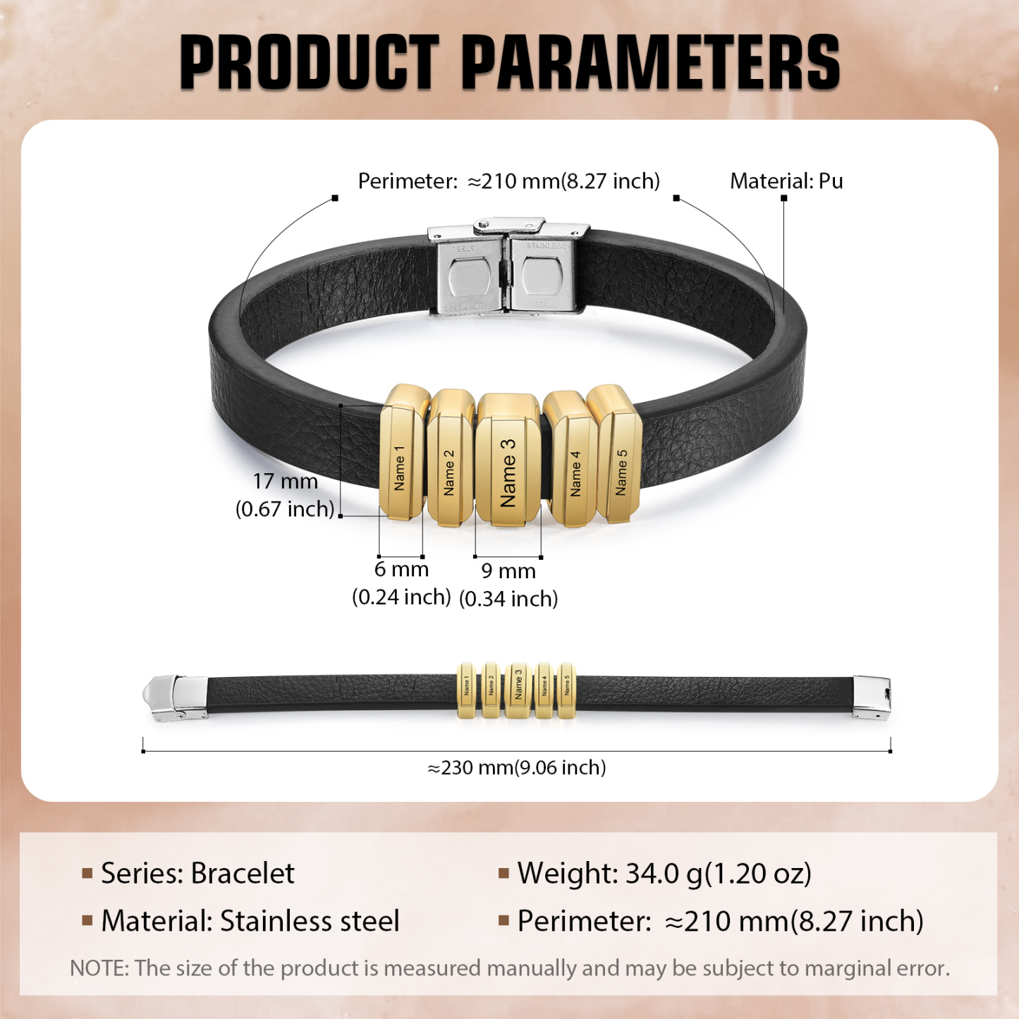 Herren Personalisierte 5 Namen Vintage Edelstahl Perle Leder Armband