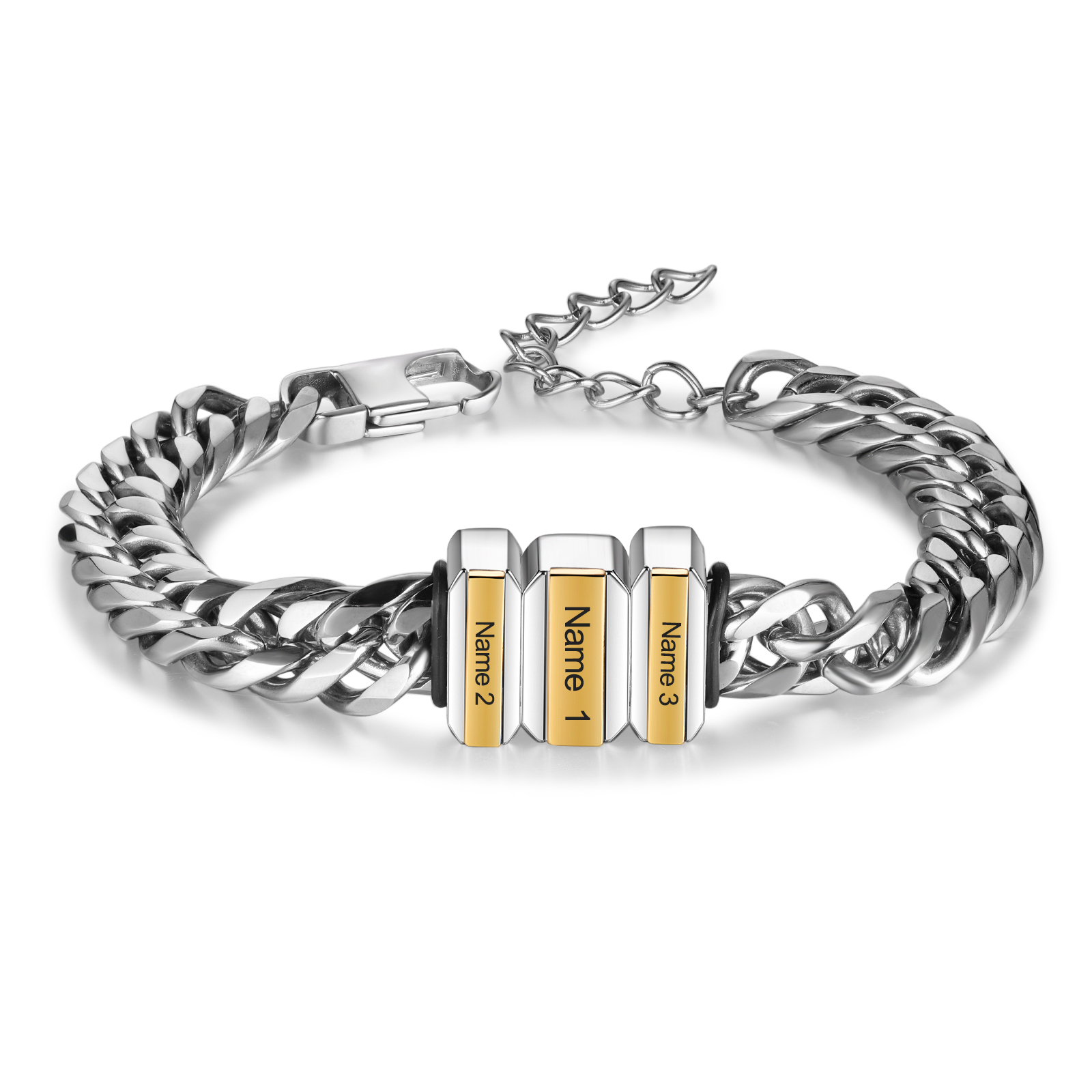 Herren Personalisiertes 3 Namen Edelstahl Kubanisches Armband mit Edelstahl Perle
