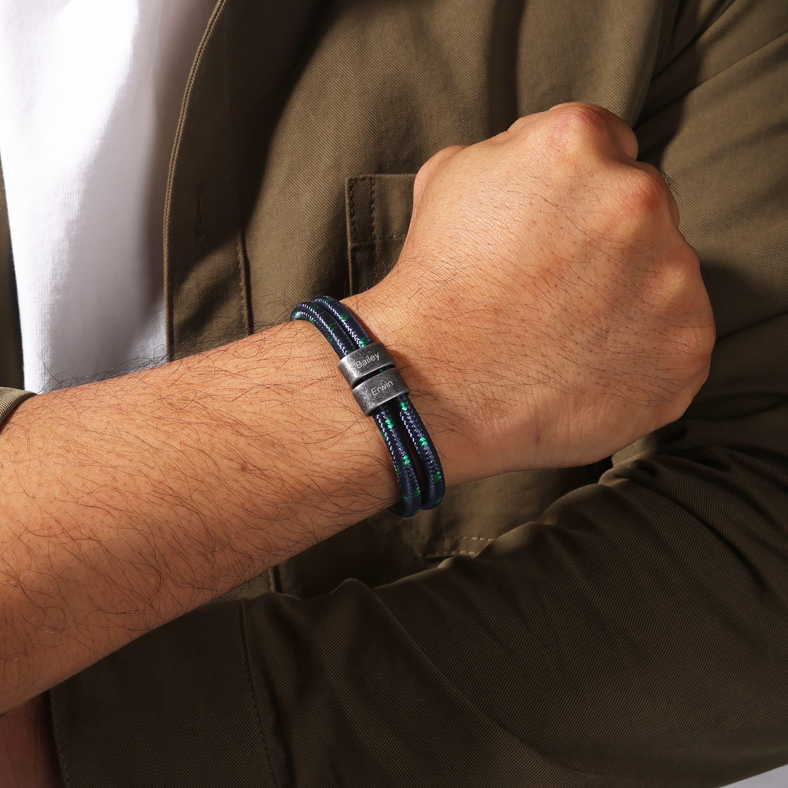 Herren Schmuck-Personalisierte 2 Namen Vintage Edelstahl Perlen Armband mit Grüner Punkt Blau Nylon Kette