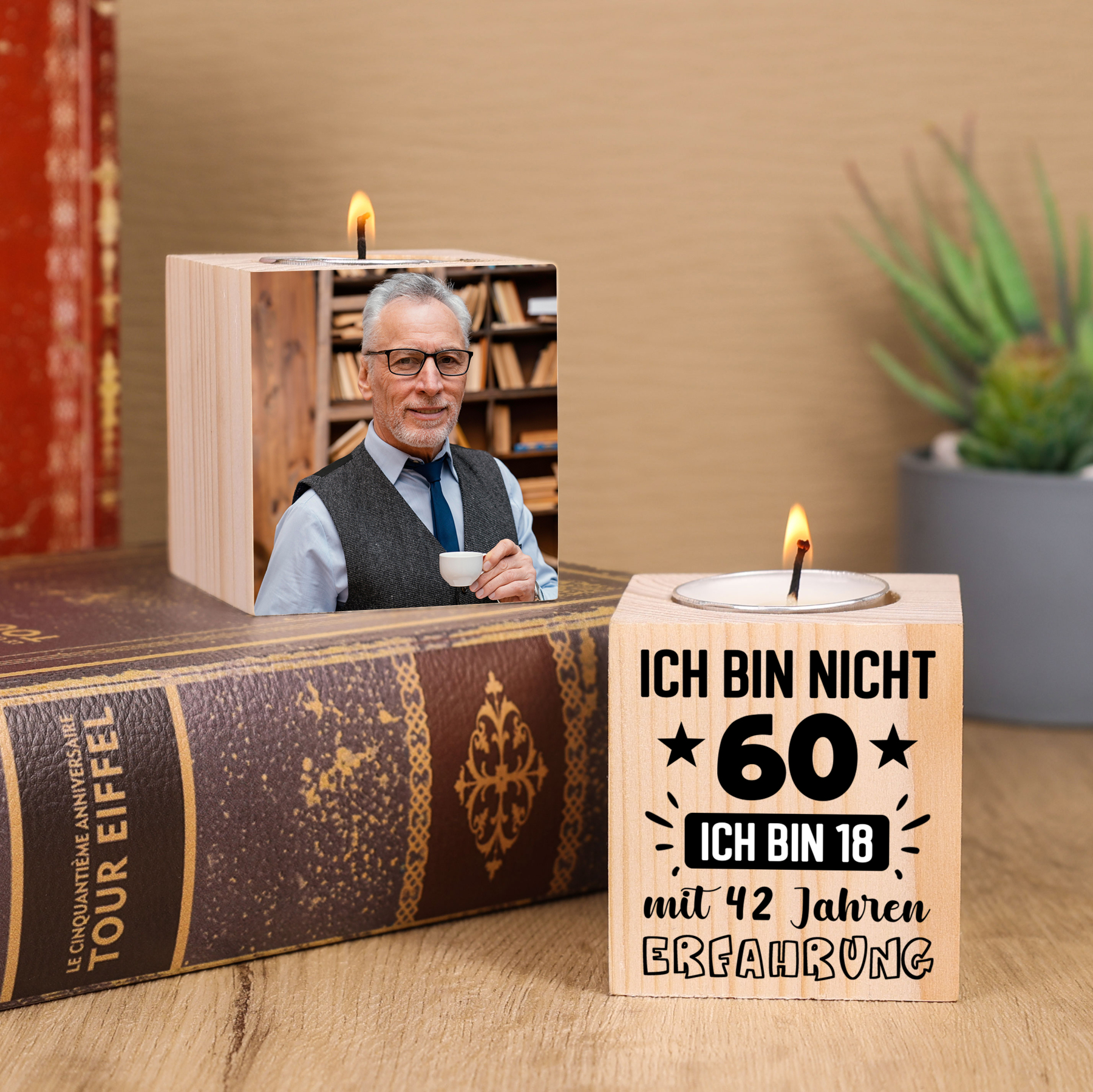 Holz Kompliment Personalisierte Foto & Alter 2 bedruckte Seiten Kerzenhalter -Ich bin 18 mit (Alter-18=XX) Jahren Erfahrung- Kerzenständer zum Geburtstag