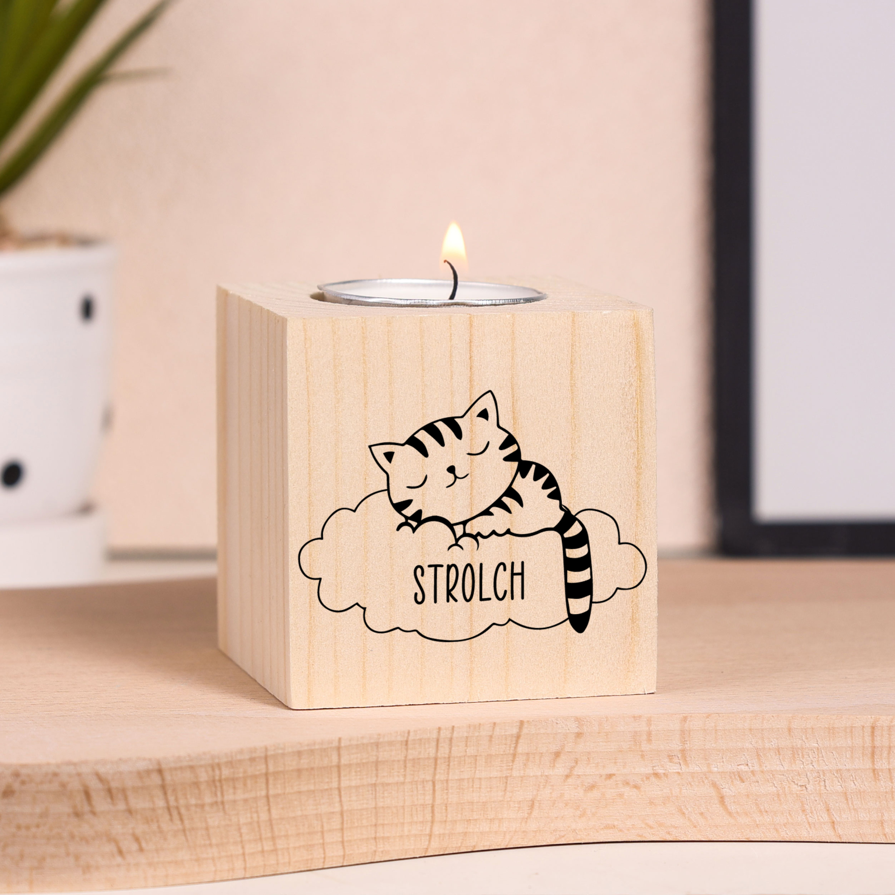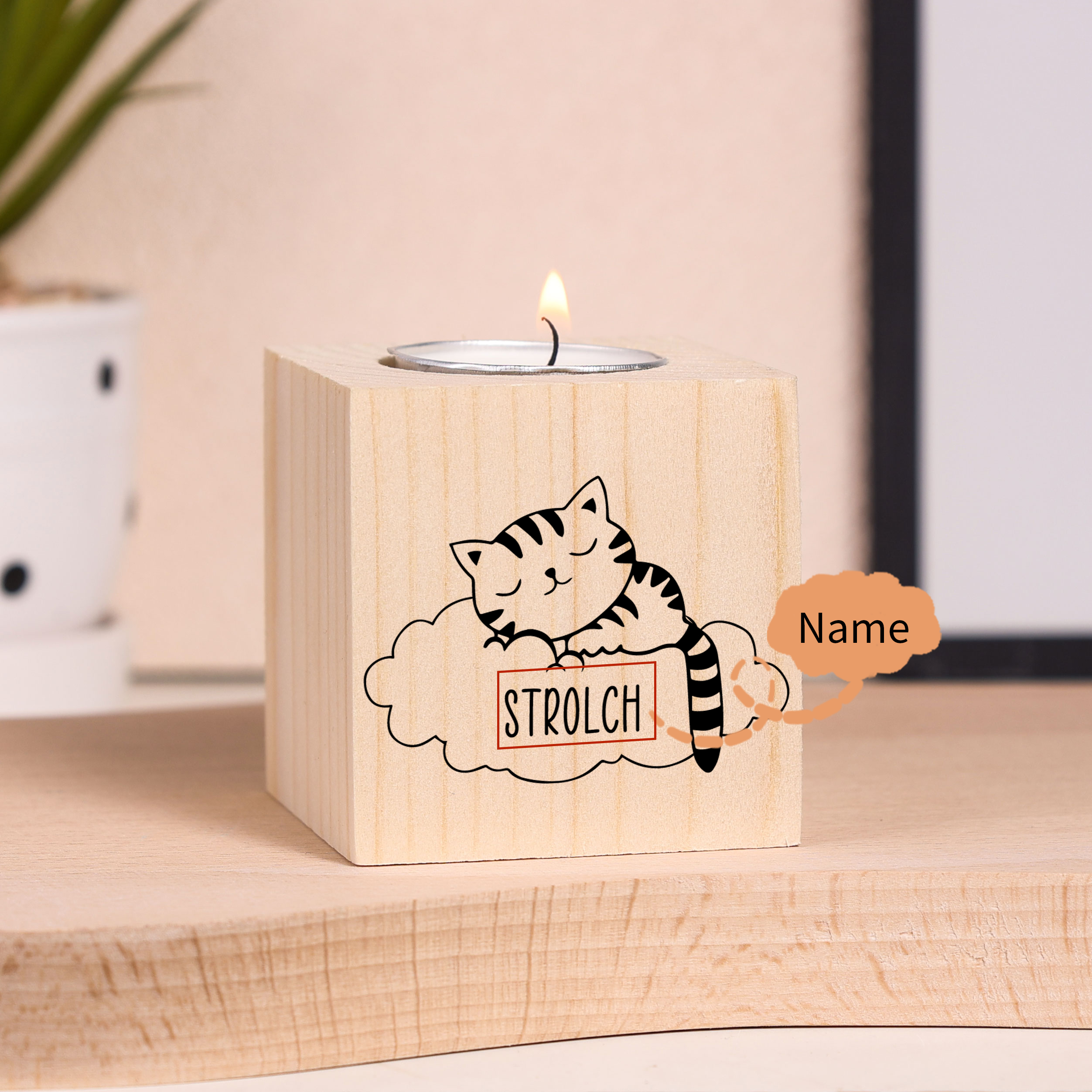 Holz Kompliment Personalisierter Name Auf einer Wolke schlafende Katze Trauer Kerzenhalter