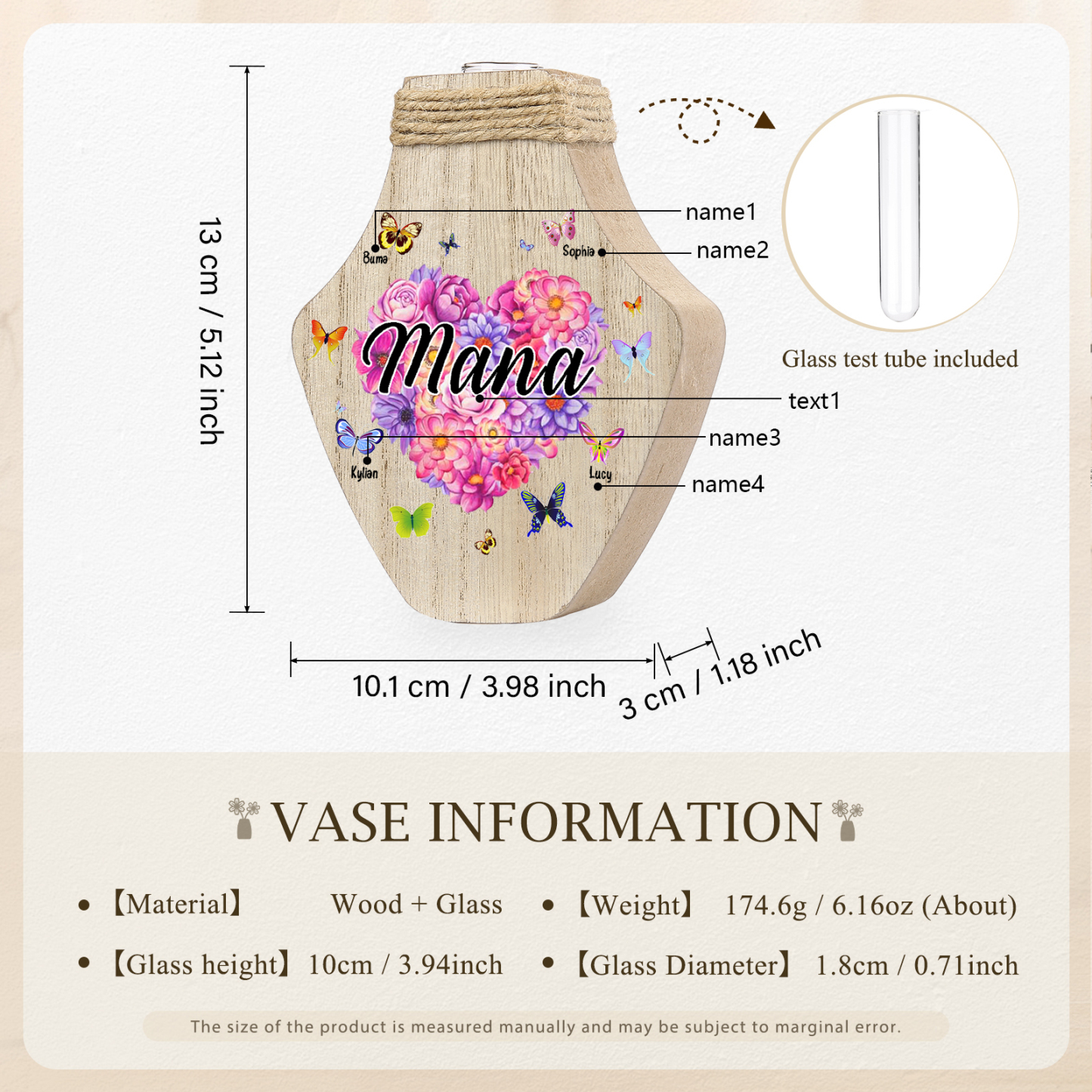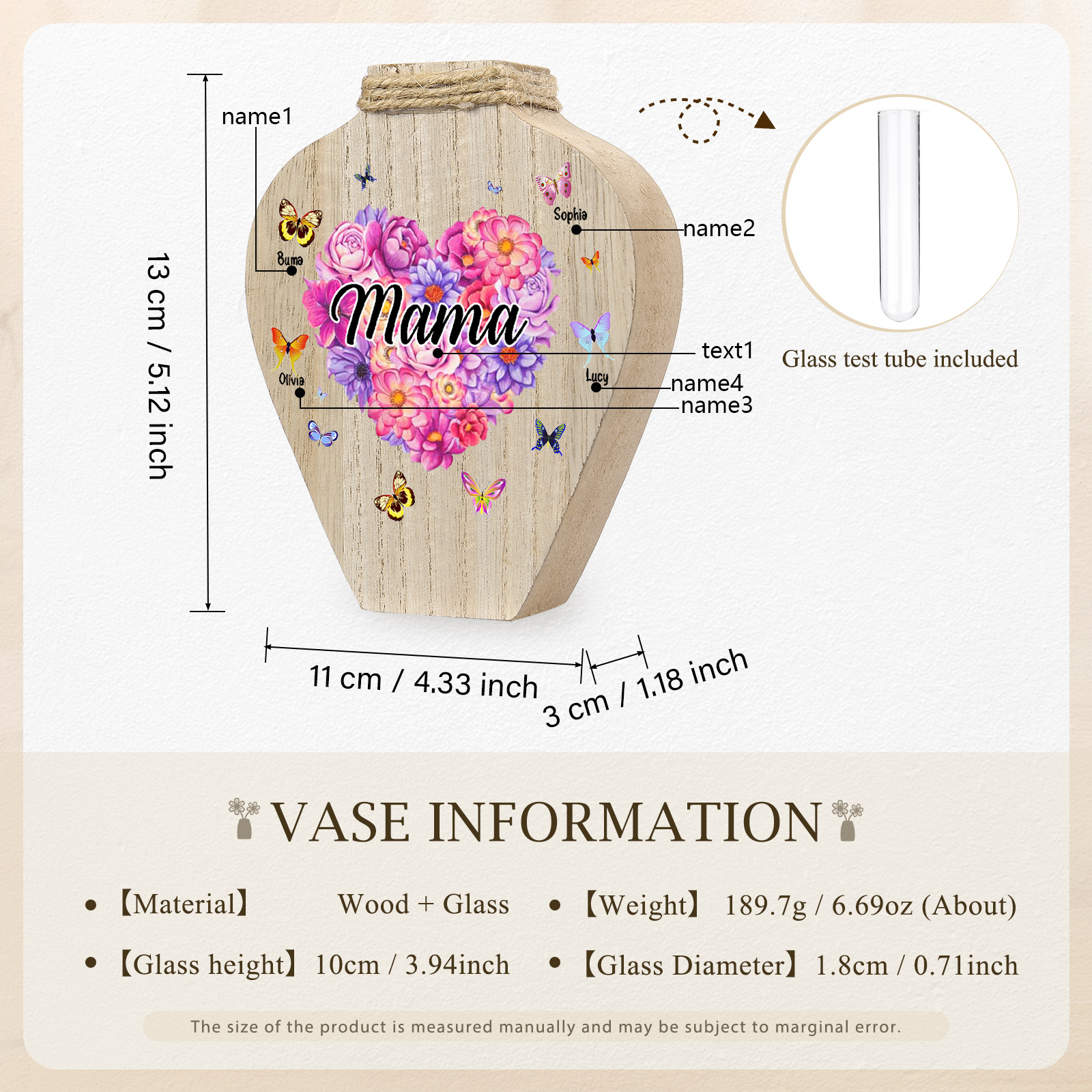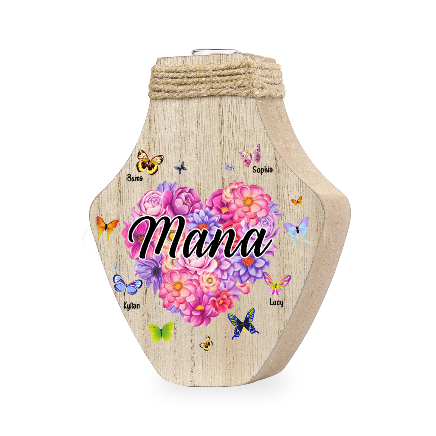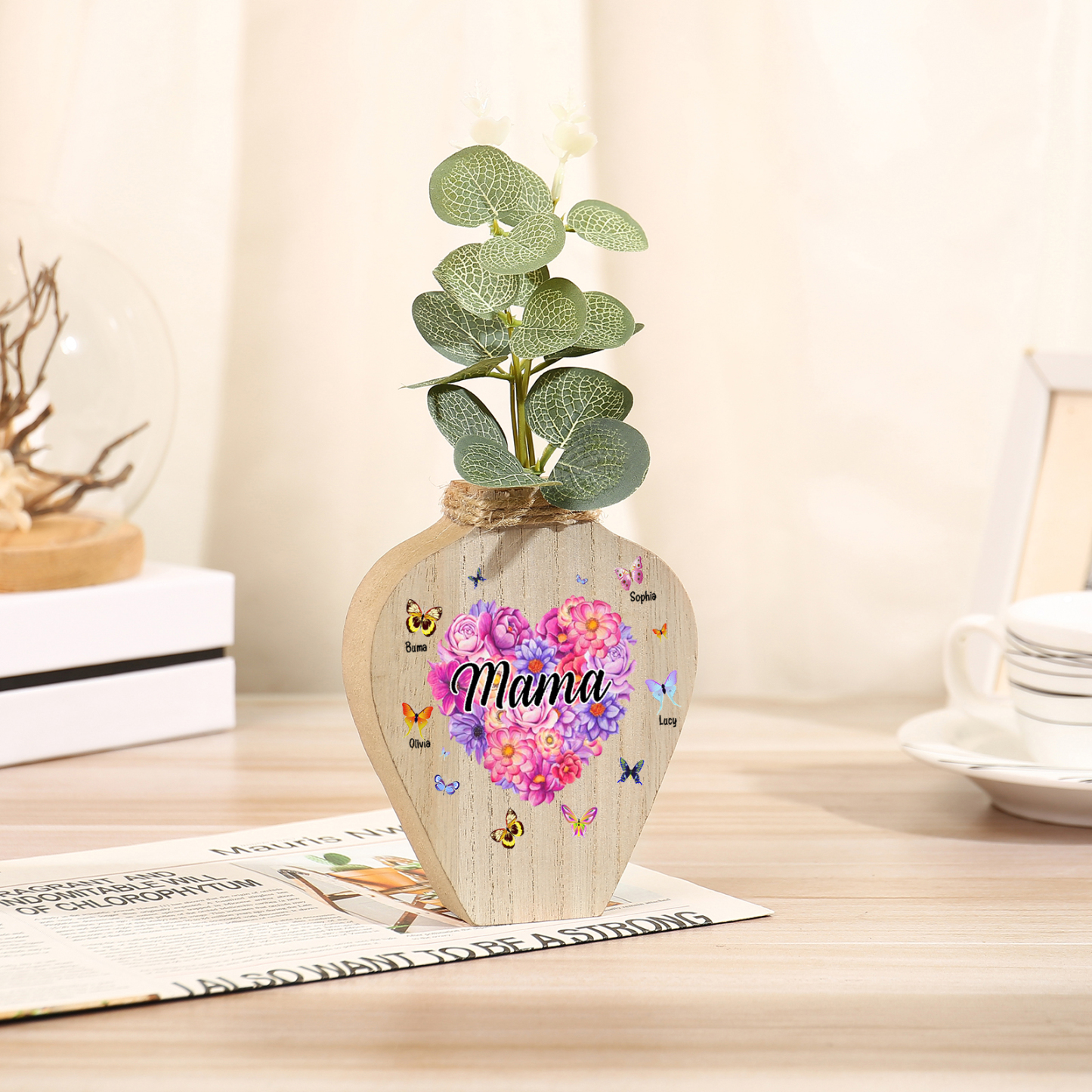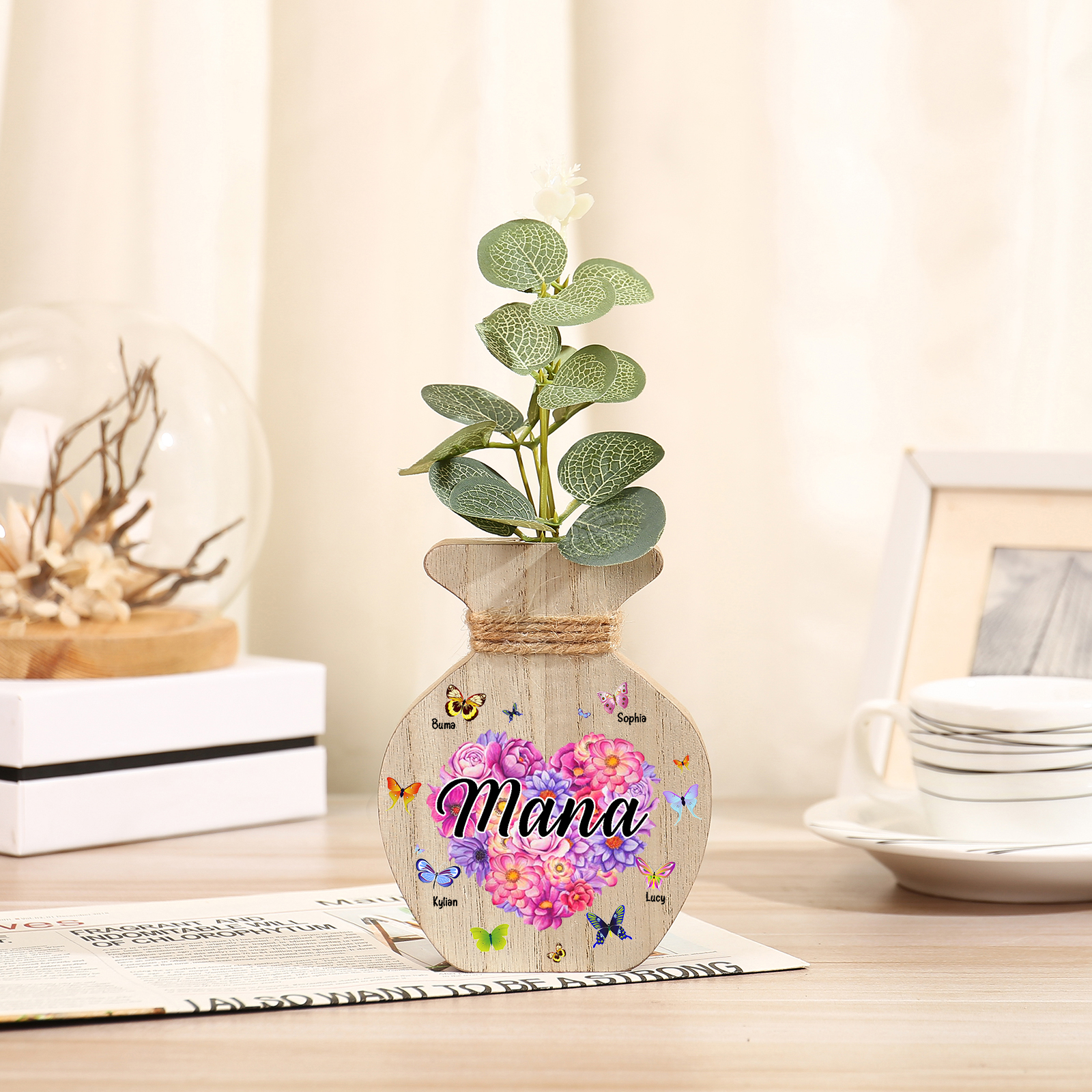 Holz Personalisierter 4 Namen & Text Blumen Herz Vase
