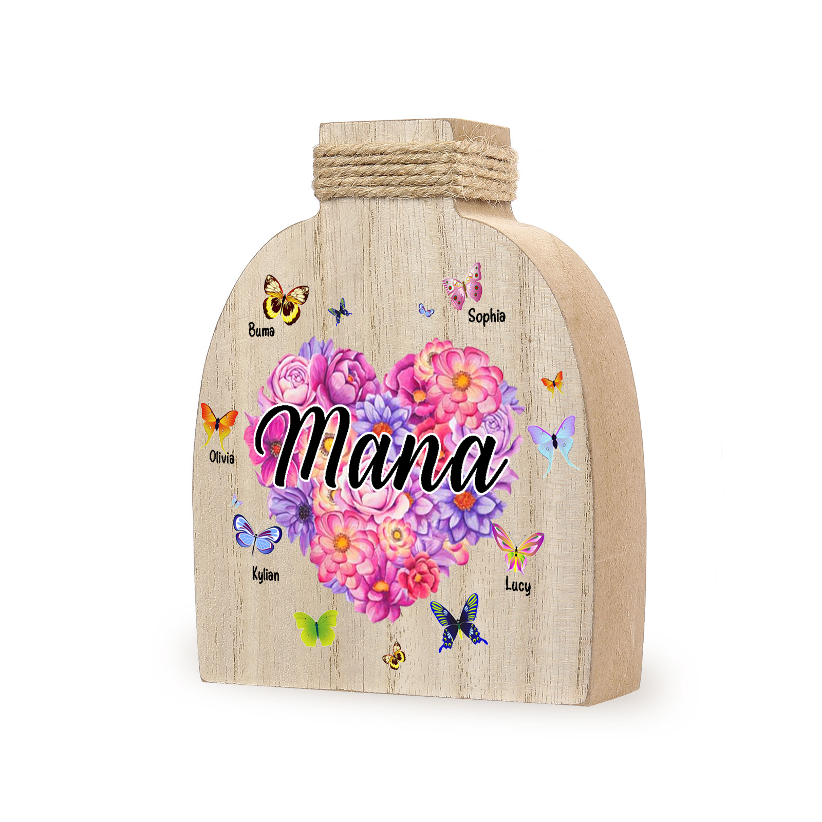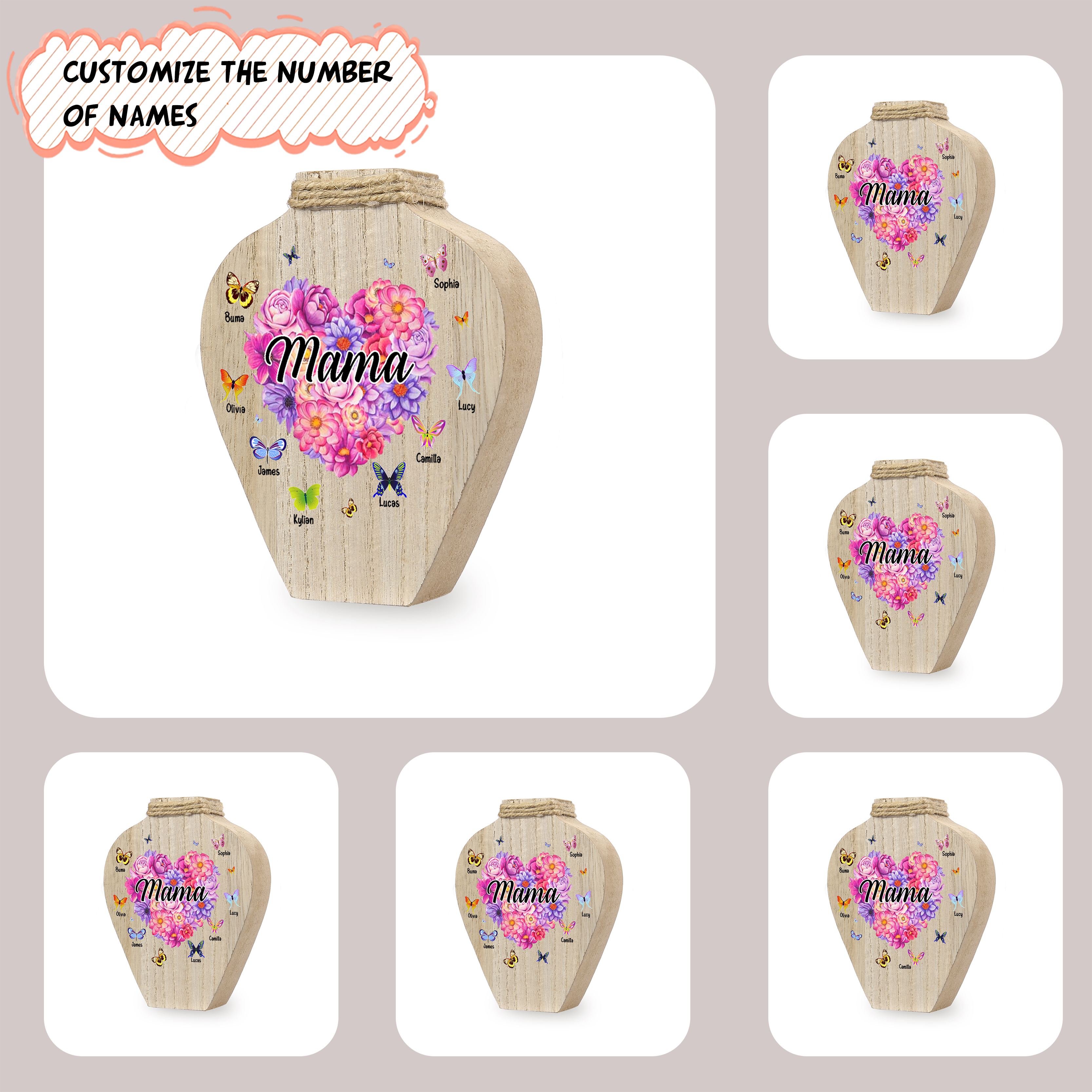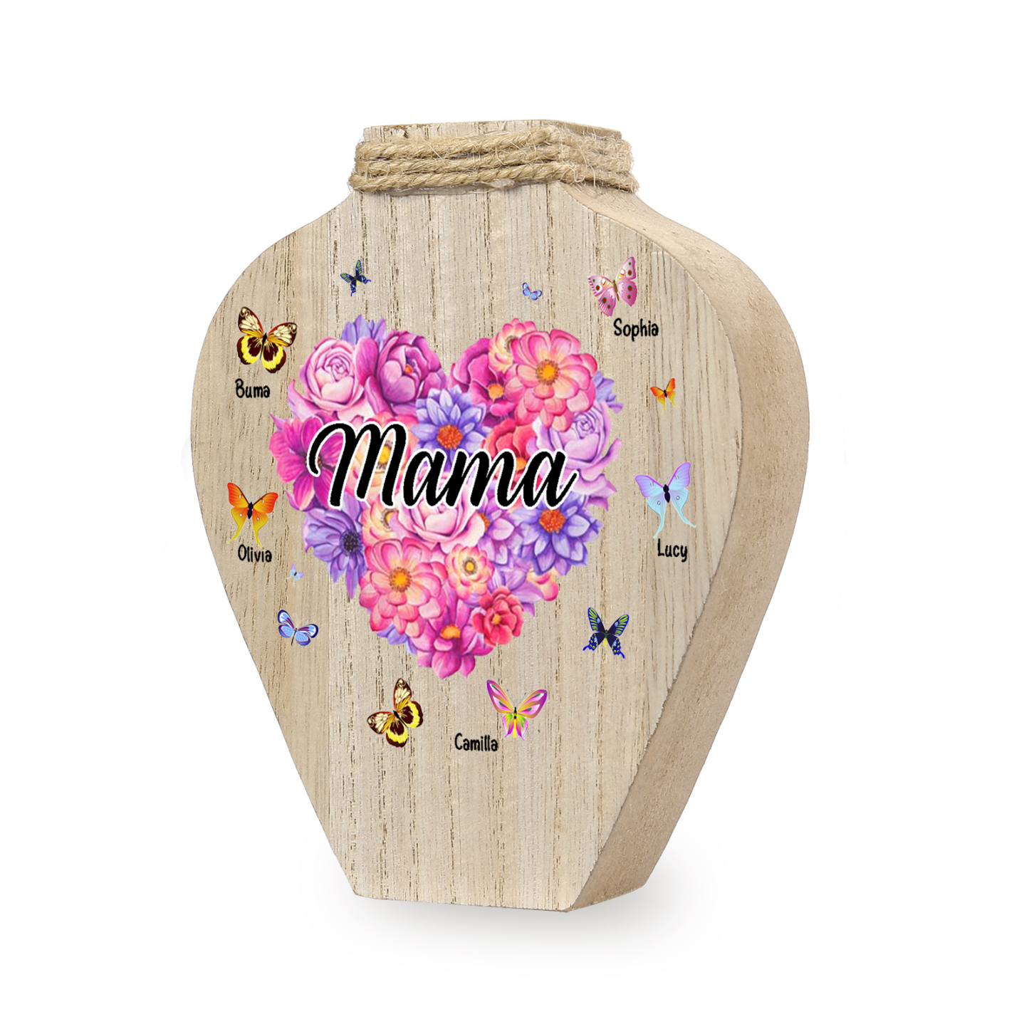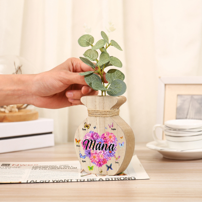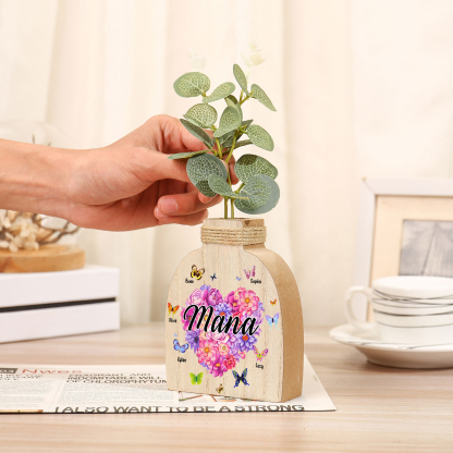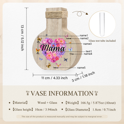 Holz Personalisierter 5 Namen & Text Blumen Herz Vase