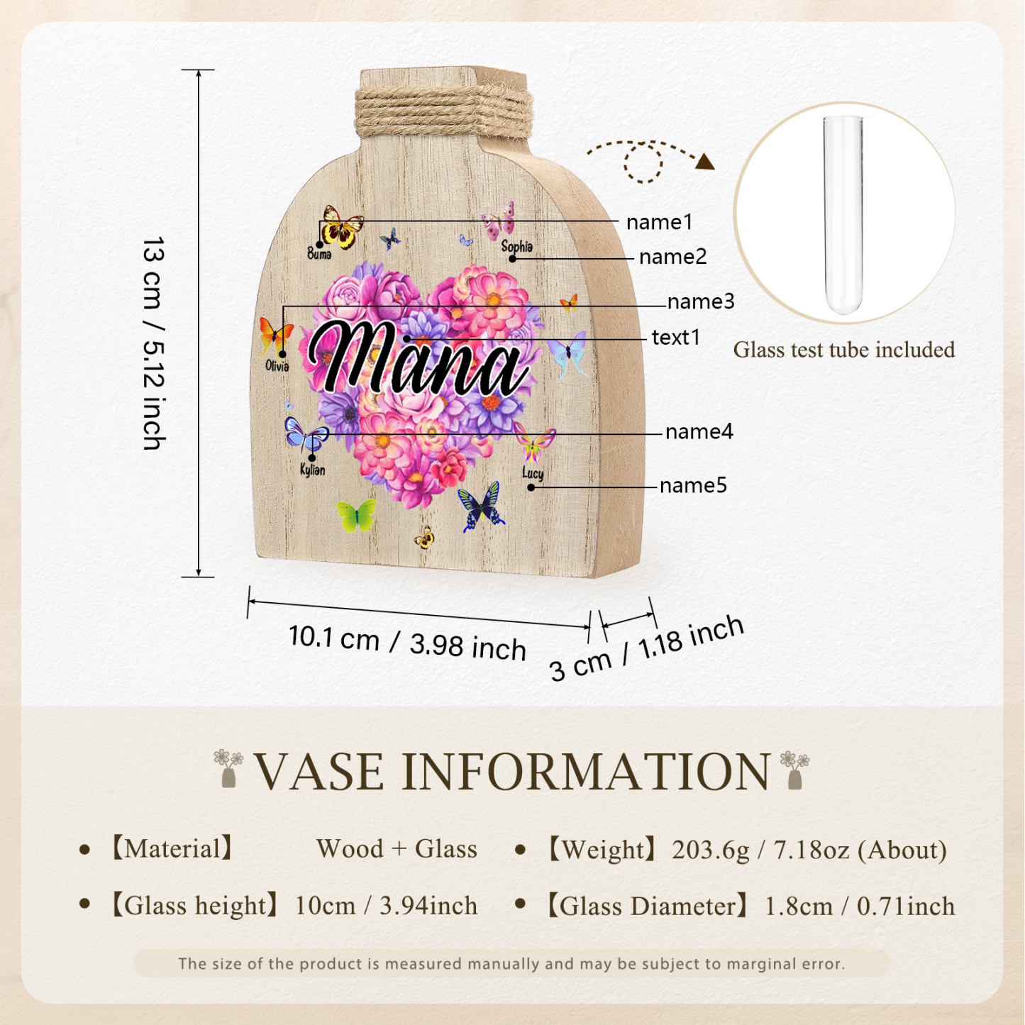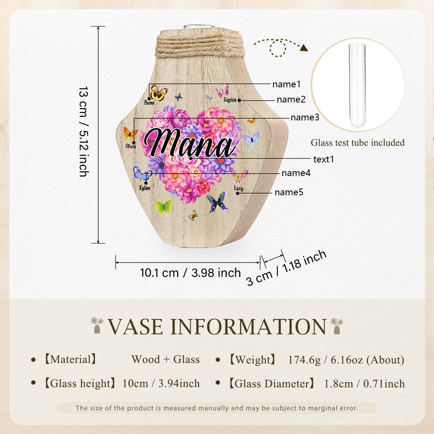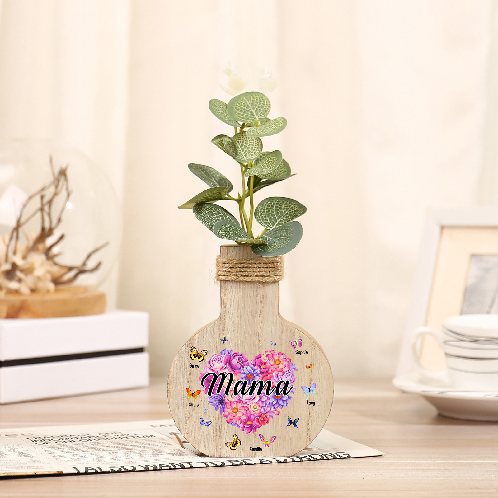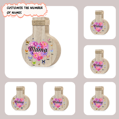 Holz Personalisierter 5 Namen & Text Blumen Herz Vase