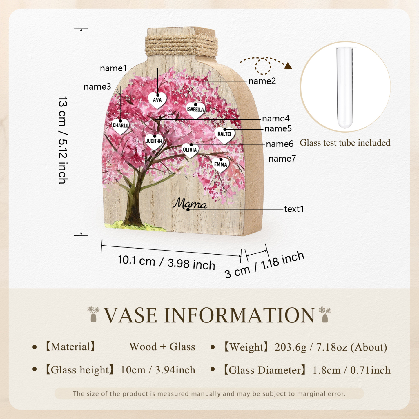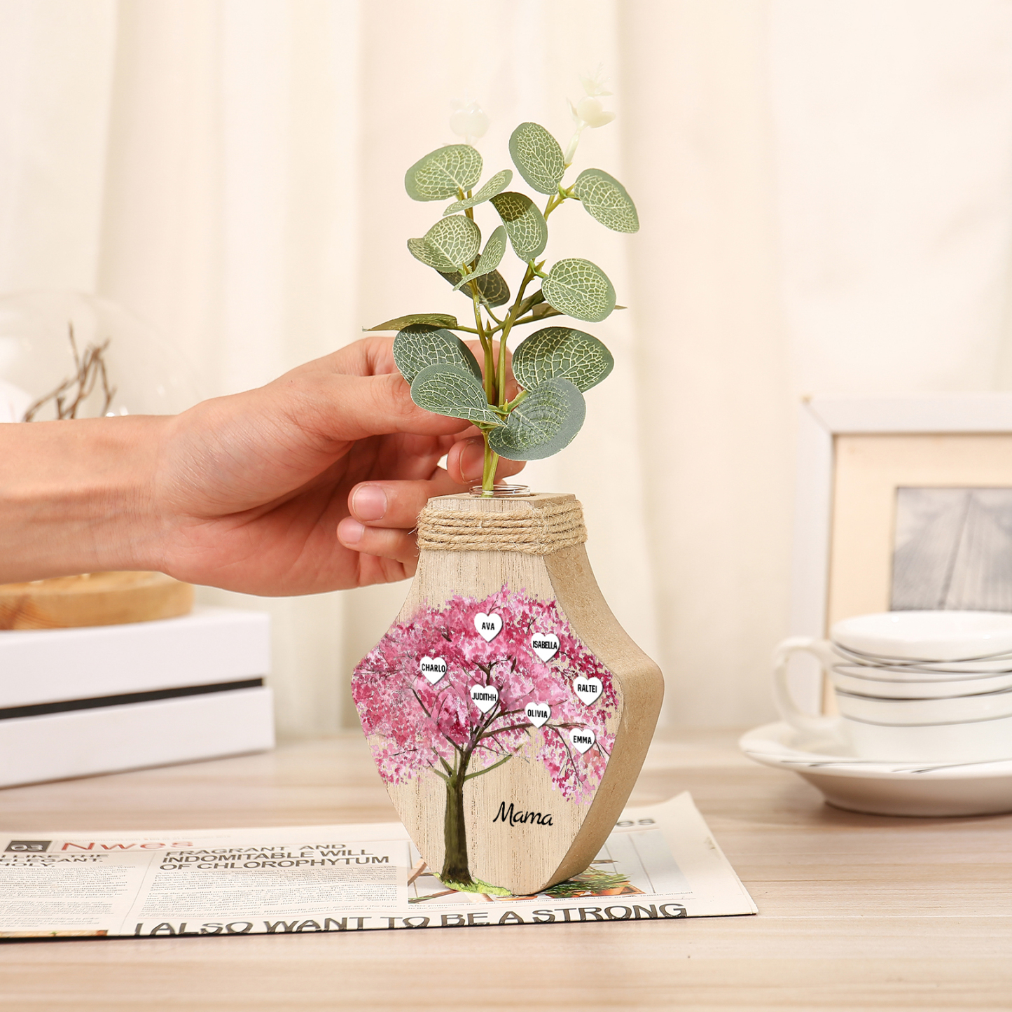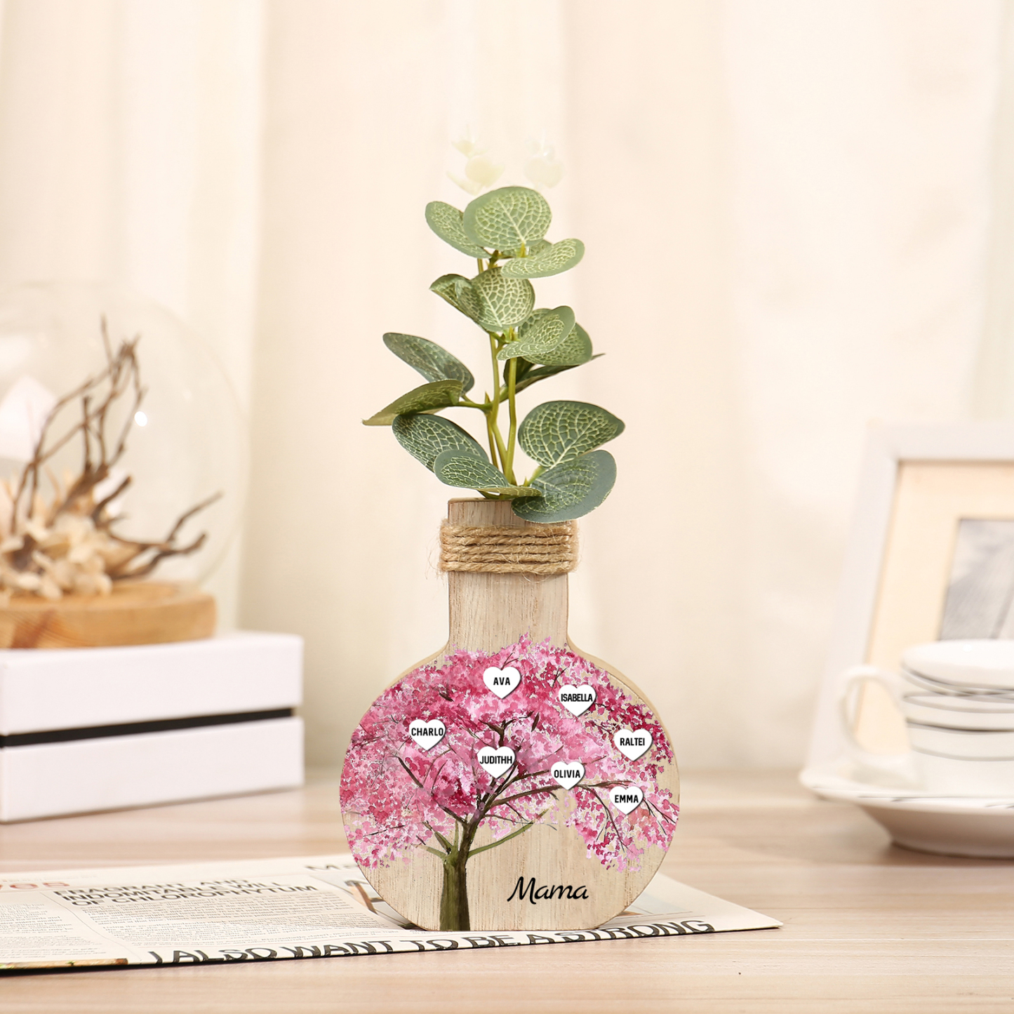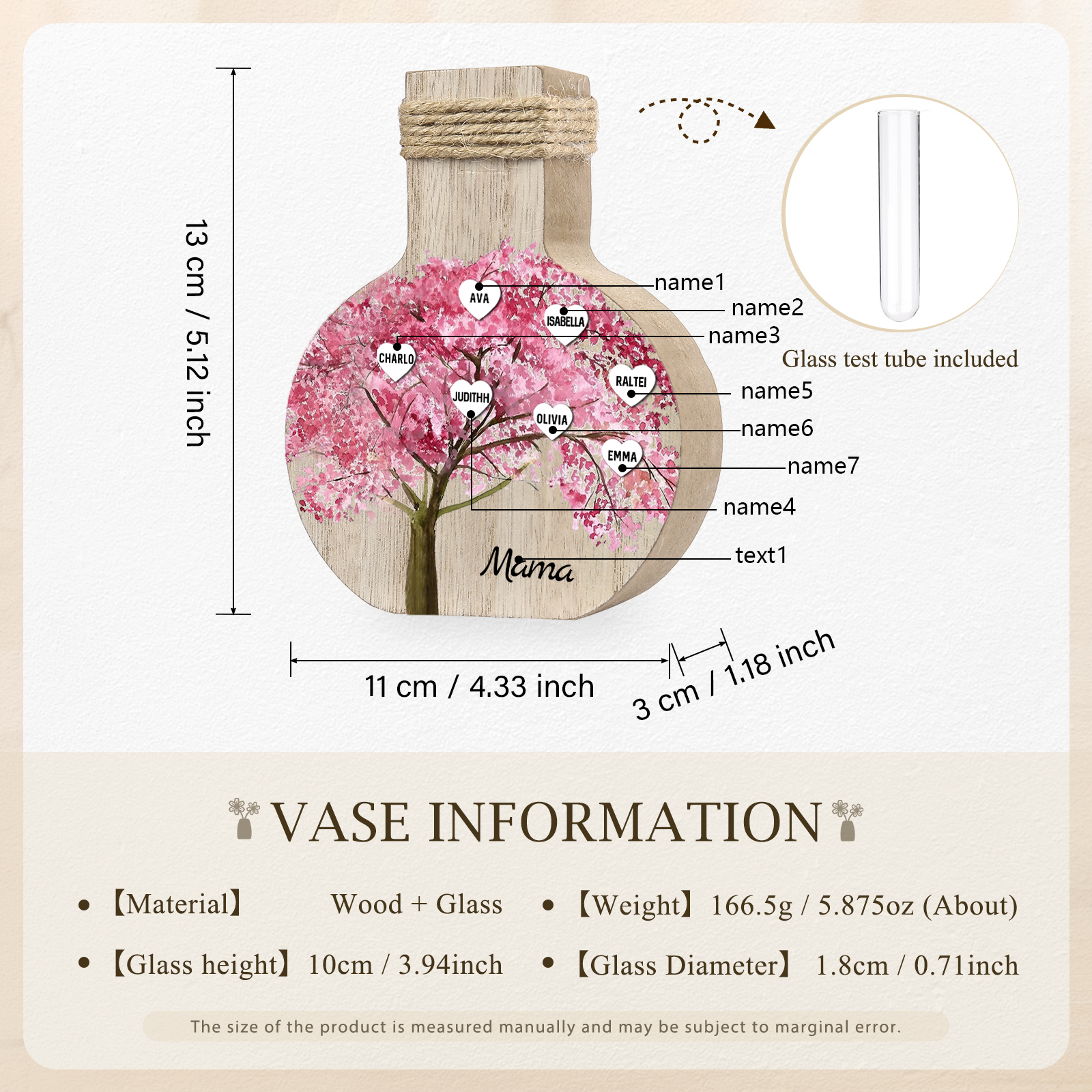 Holz Personalisierter 7 Namen & Text Rosa Familienbaum Famile Vase