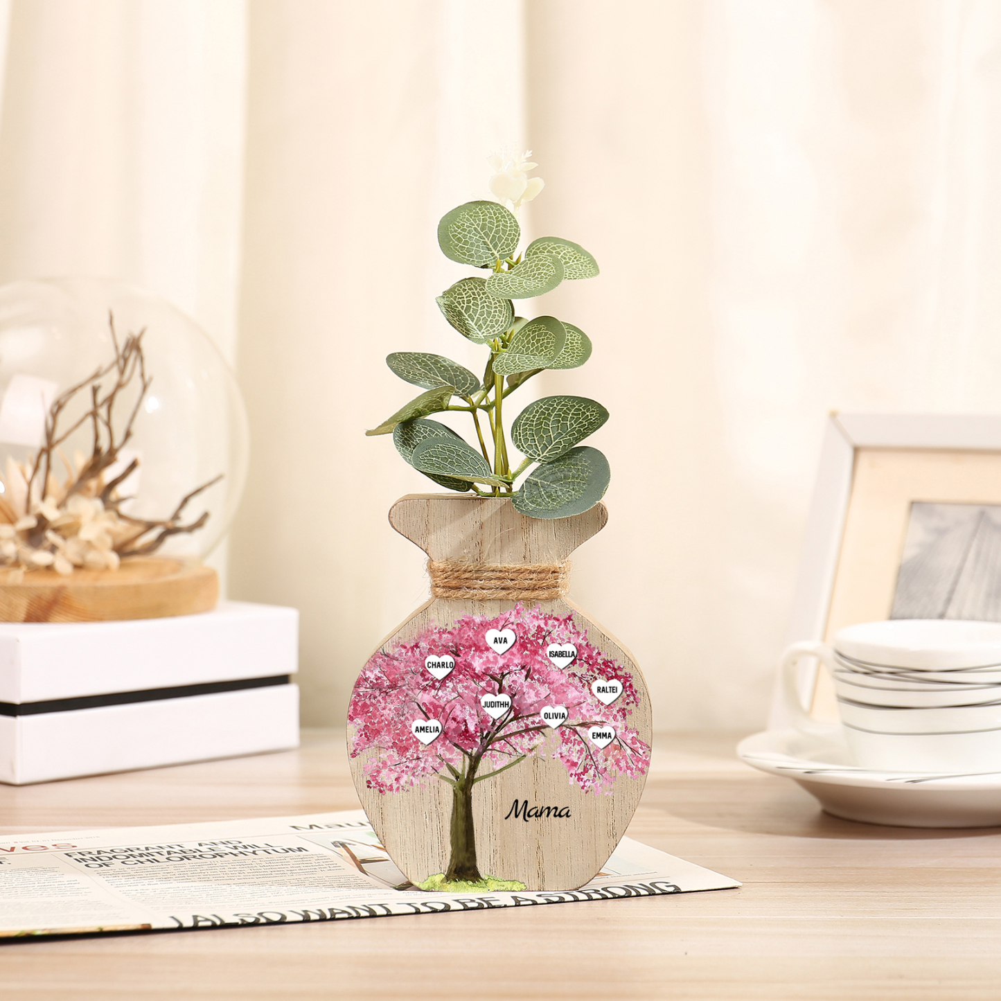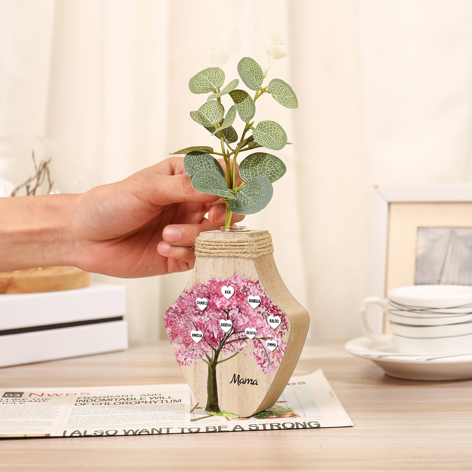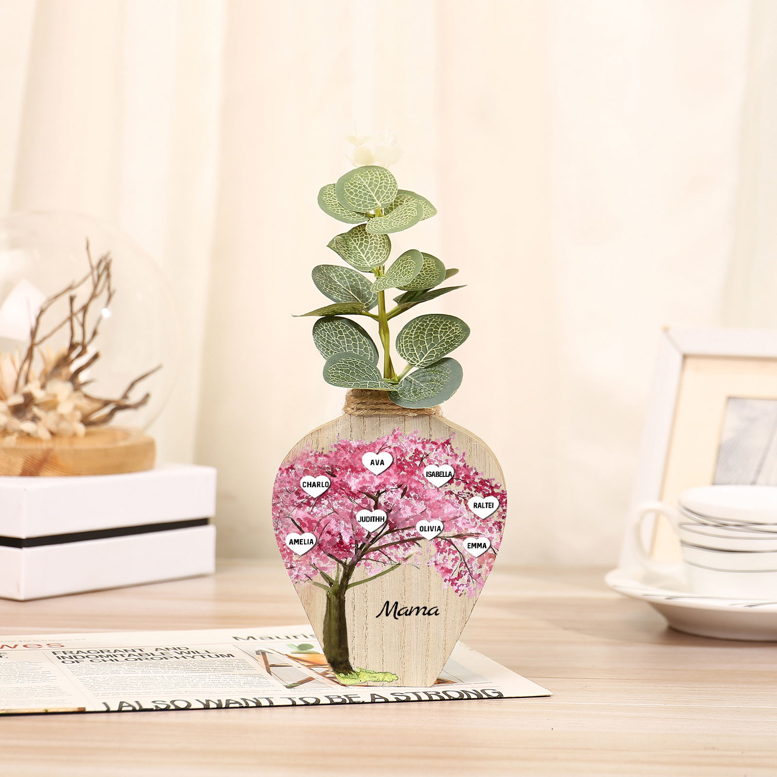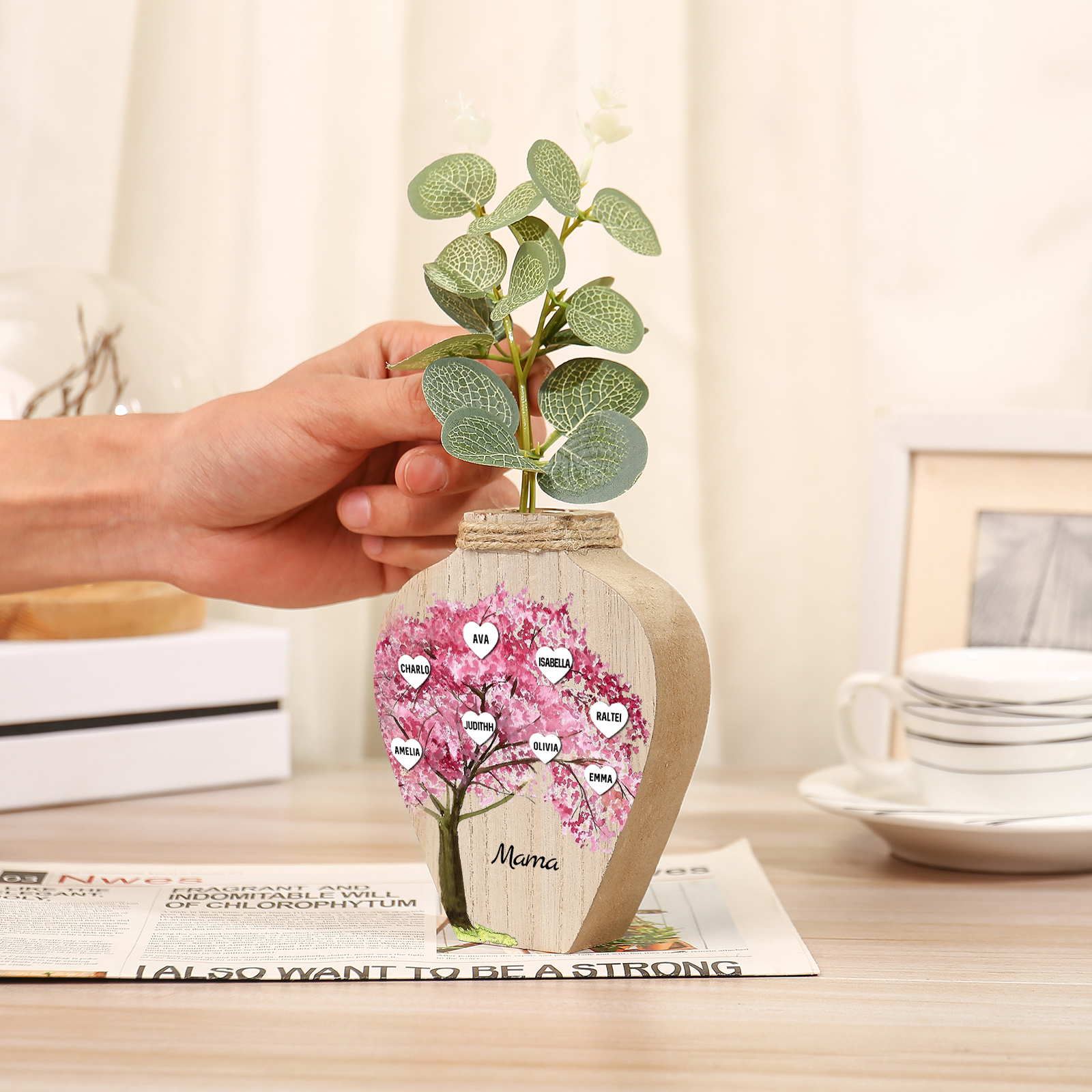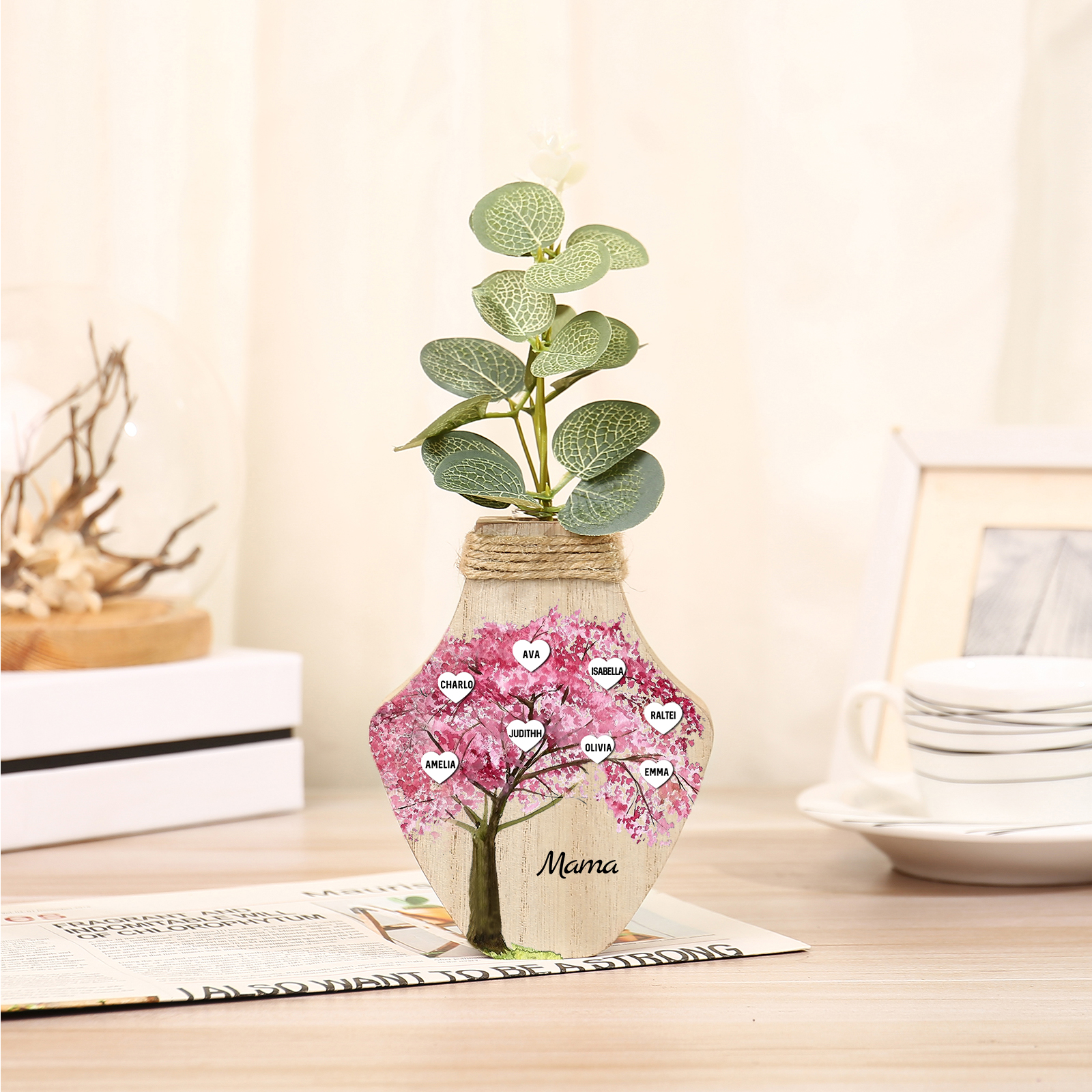 Holz Personalisierter 8 Namen & Text Rosa Familienbaum Famile Vase