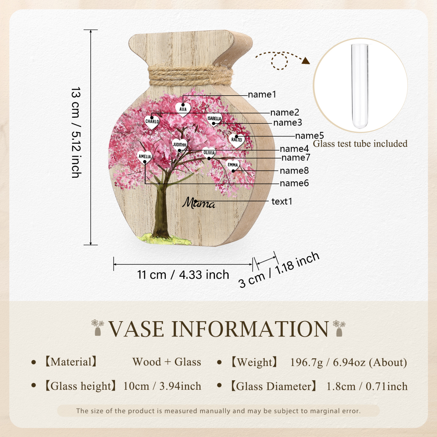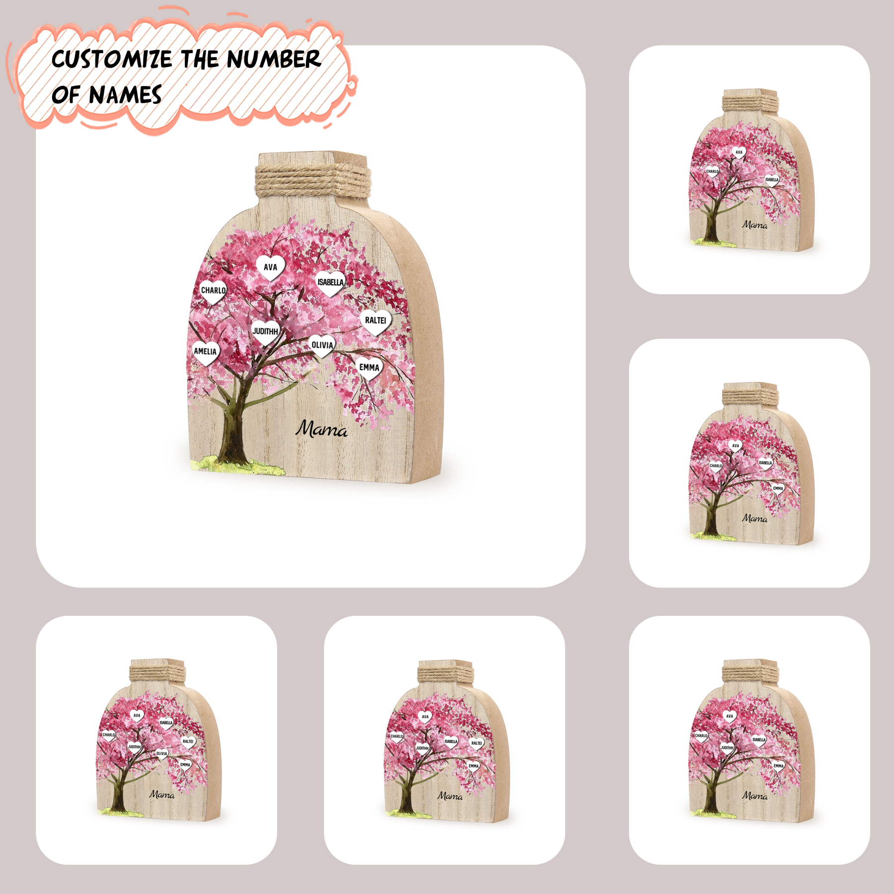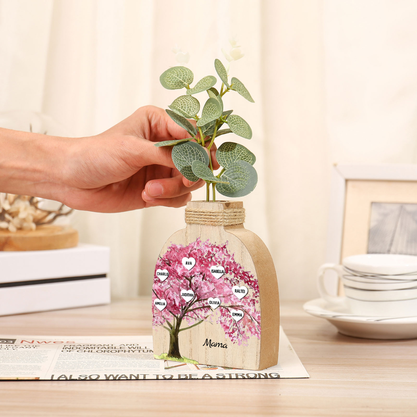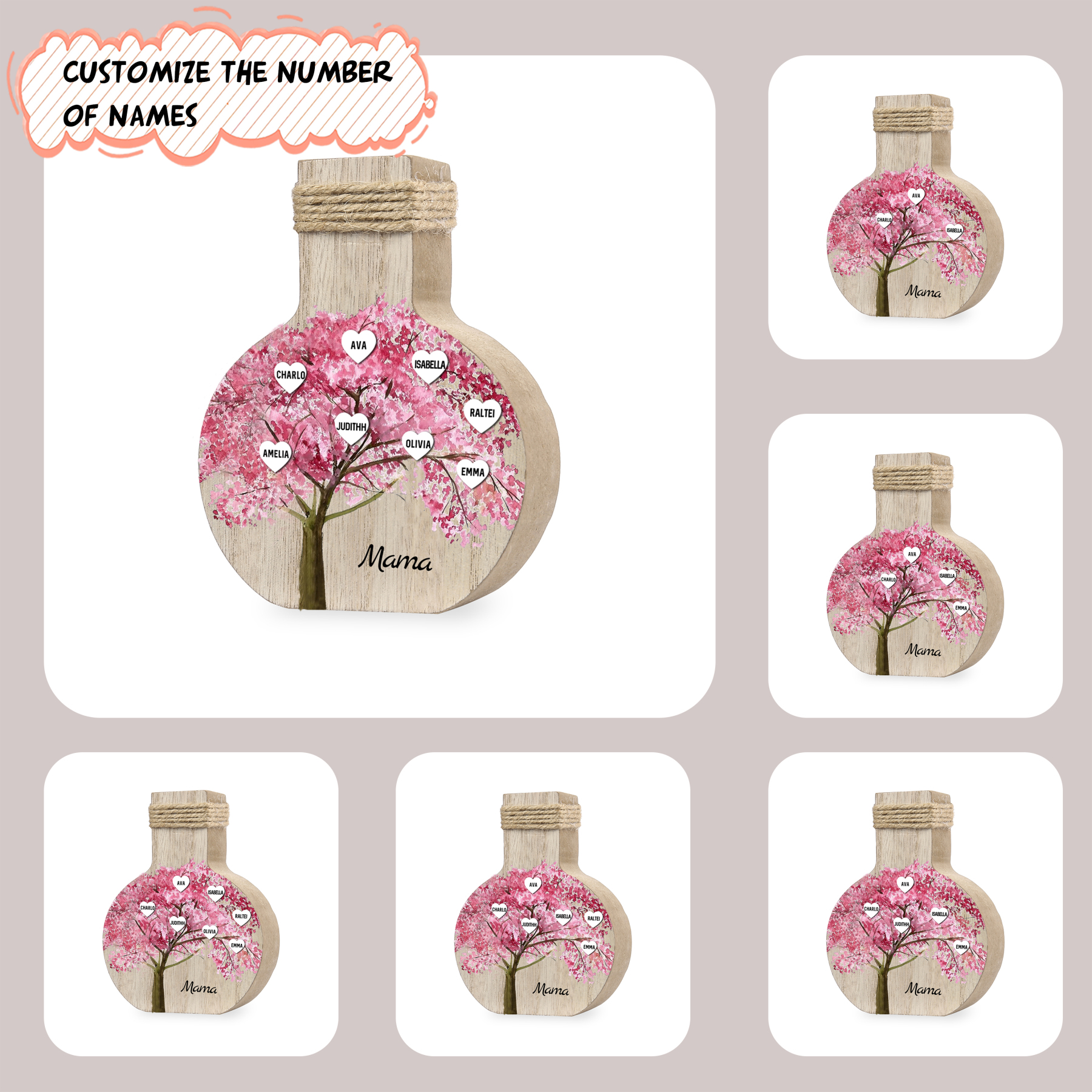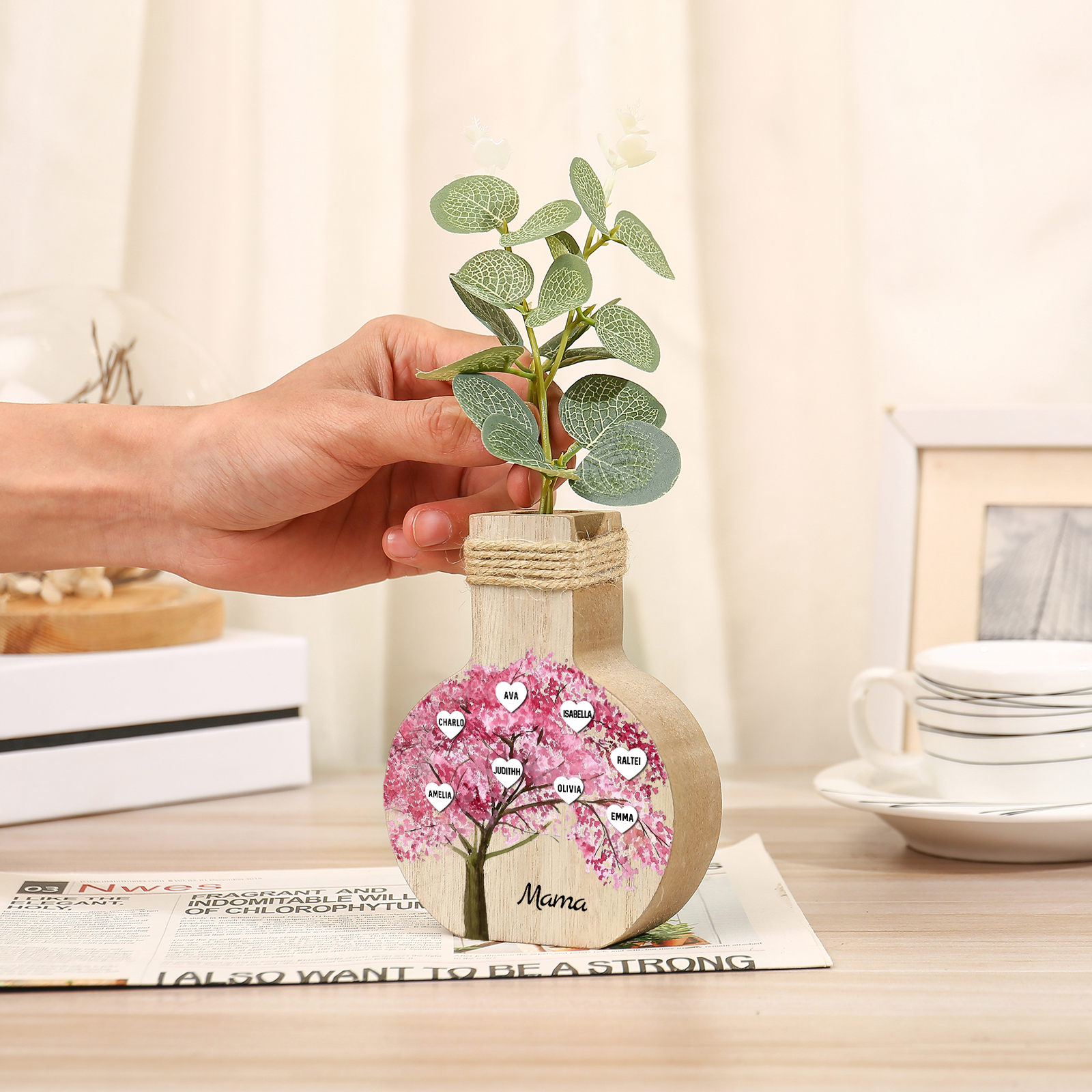 Holz Personalisierter 8 Namen & Text Rosa Familienbaum Famile Vase